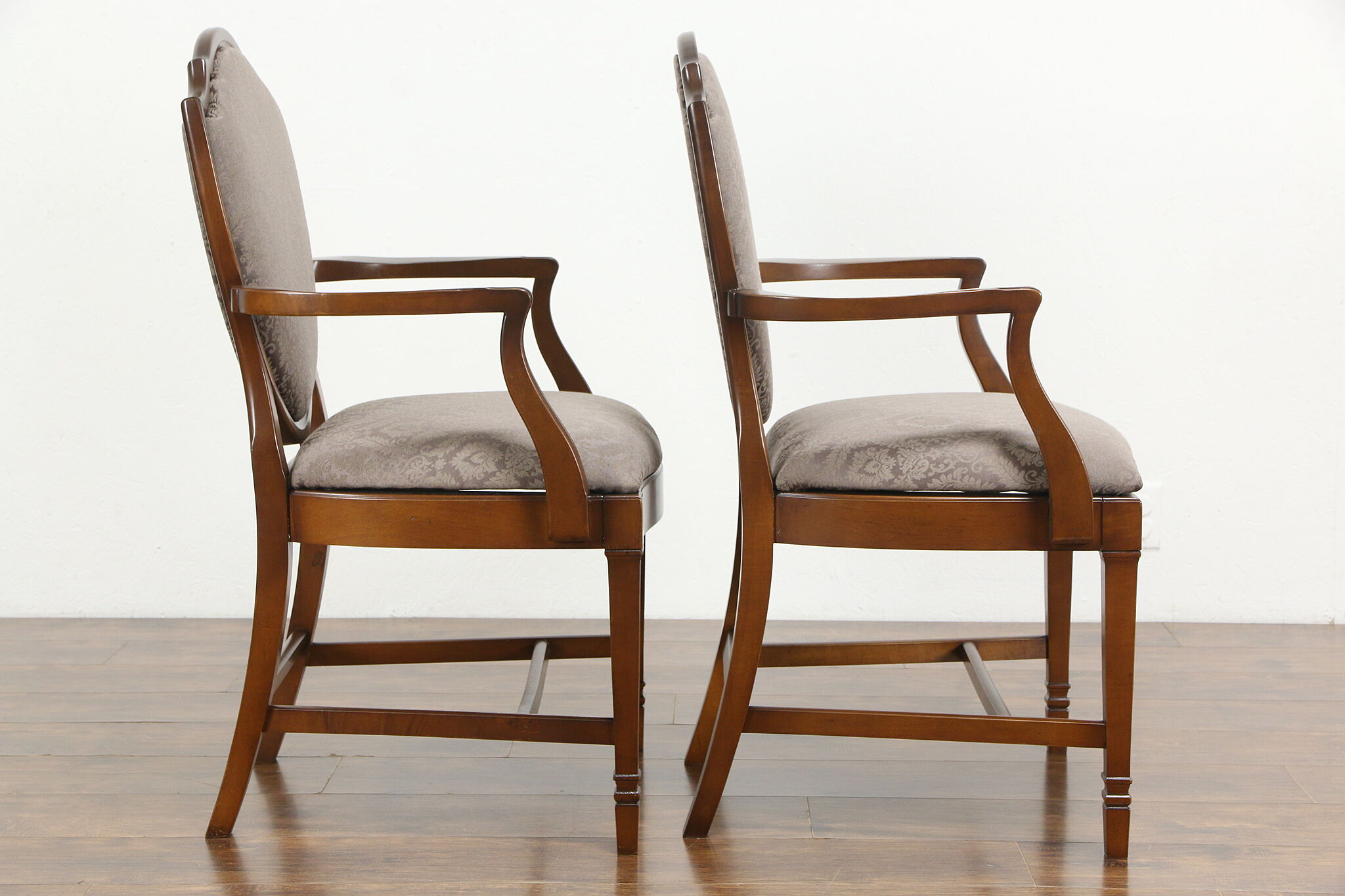 A set of six traditional Georgian design "shield back" dining chairs were carved of solid maple hardwood in the 1940's, and have been newly upholstered. No maker's signature survives.