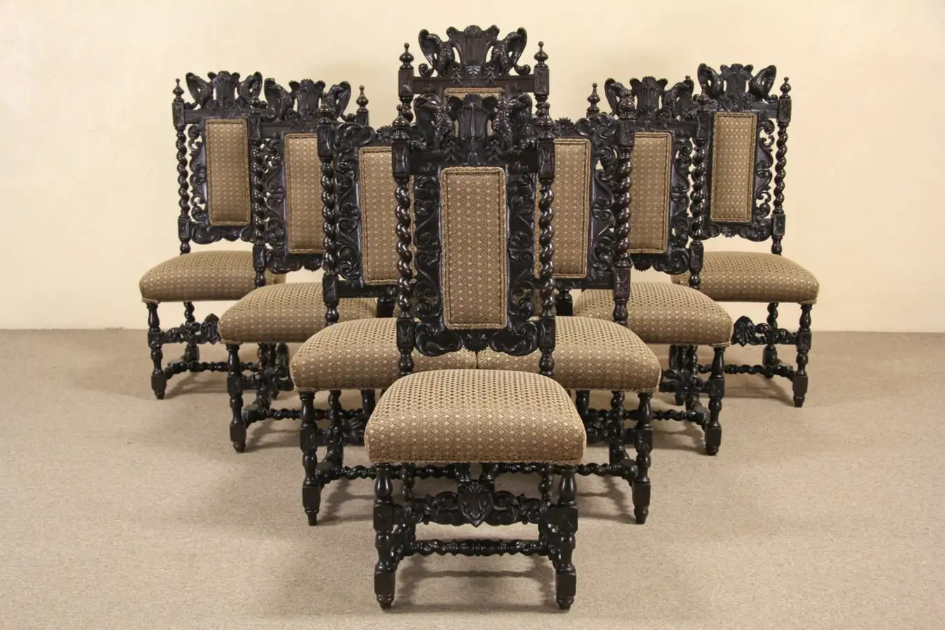 Frames with spiral columns have been reglued, they are strong and tight. The lustrous deep finish is in excellent condition. Soft comfortable seats are newly upholstered on this European antique furniture. All but two of the side chairs have a double eagle family crest or coat of arms.