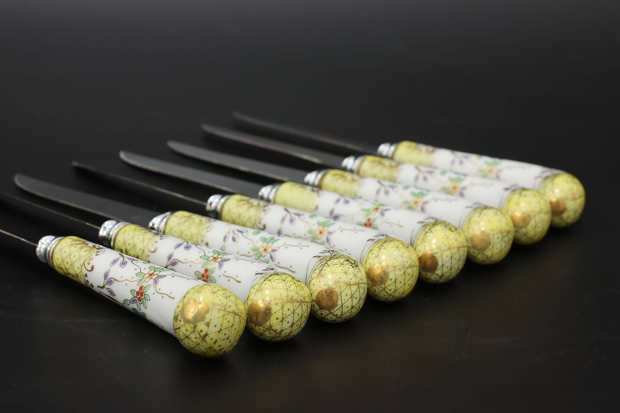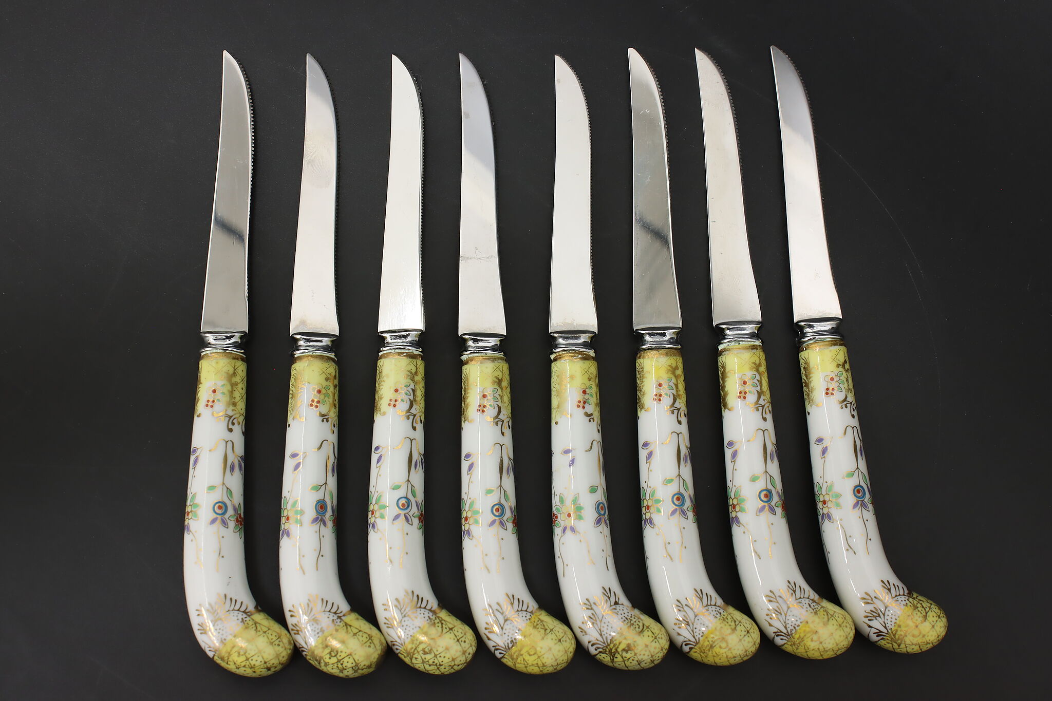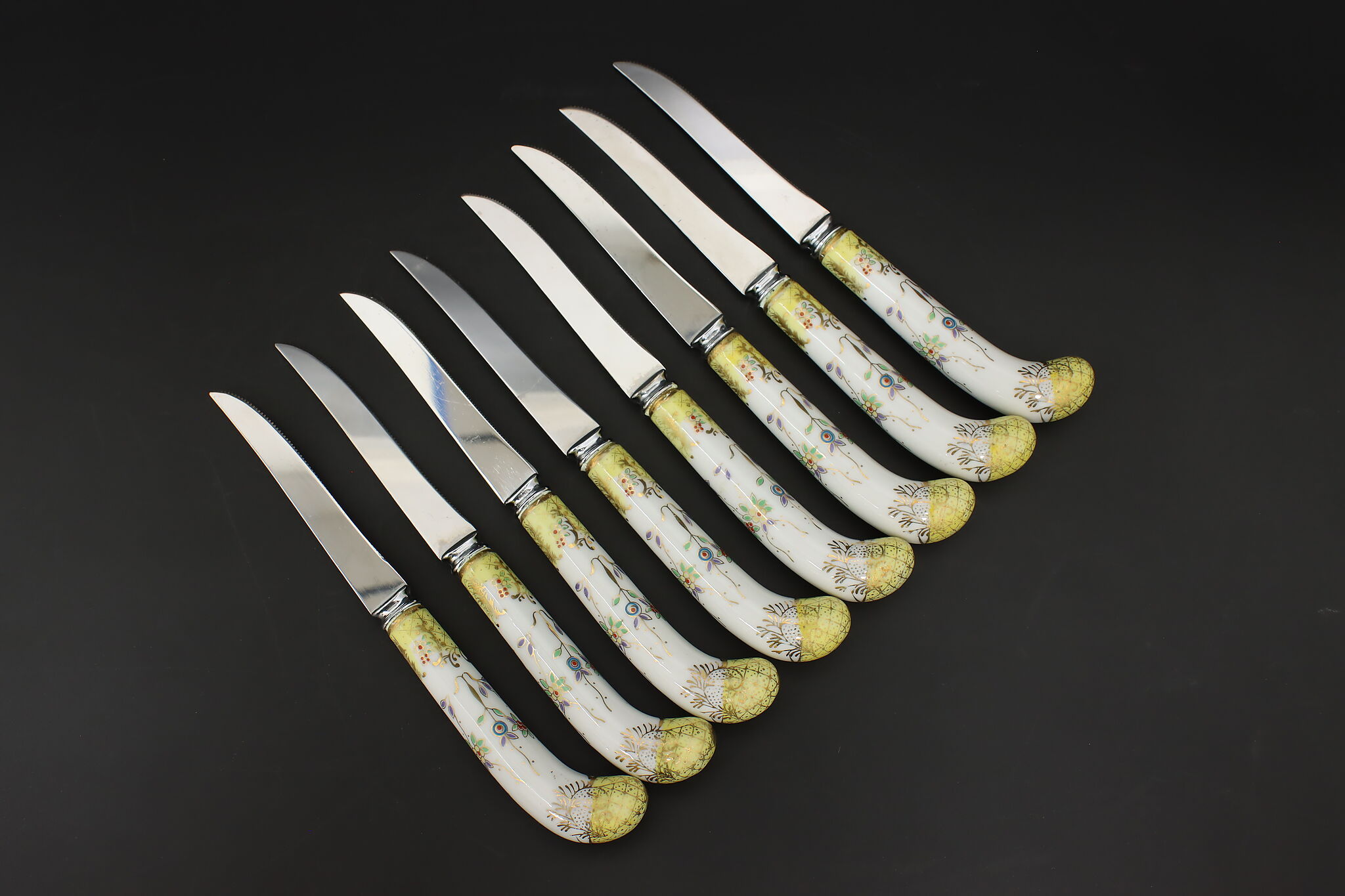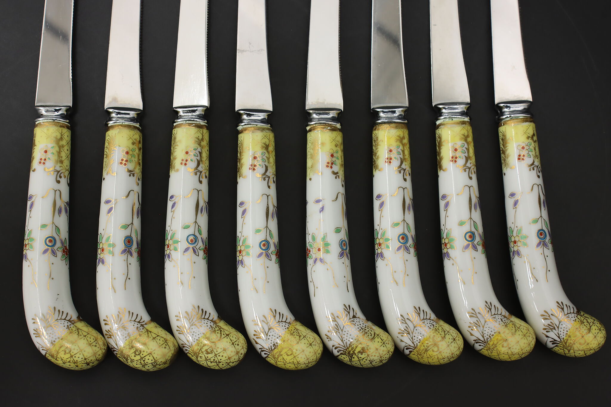 A set of eight dining knives have beautifully hand-painted porcelain handles.