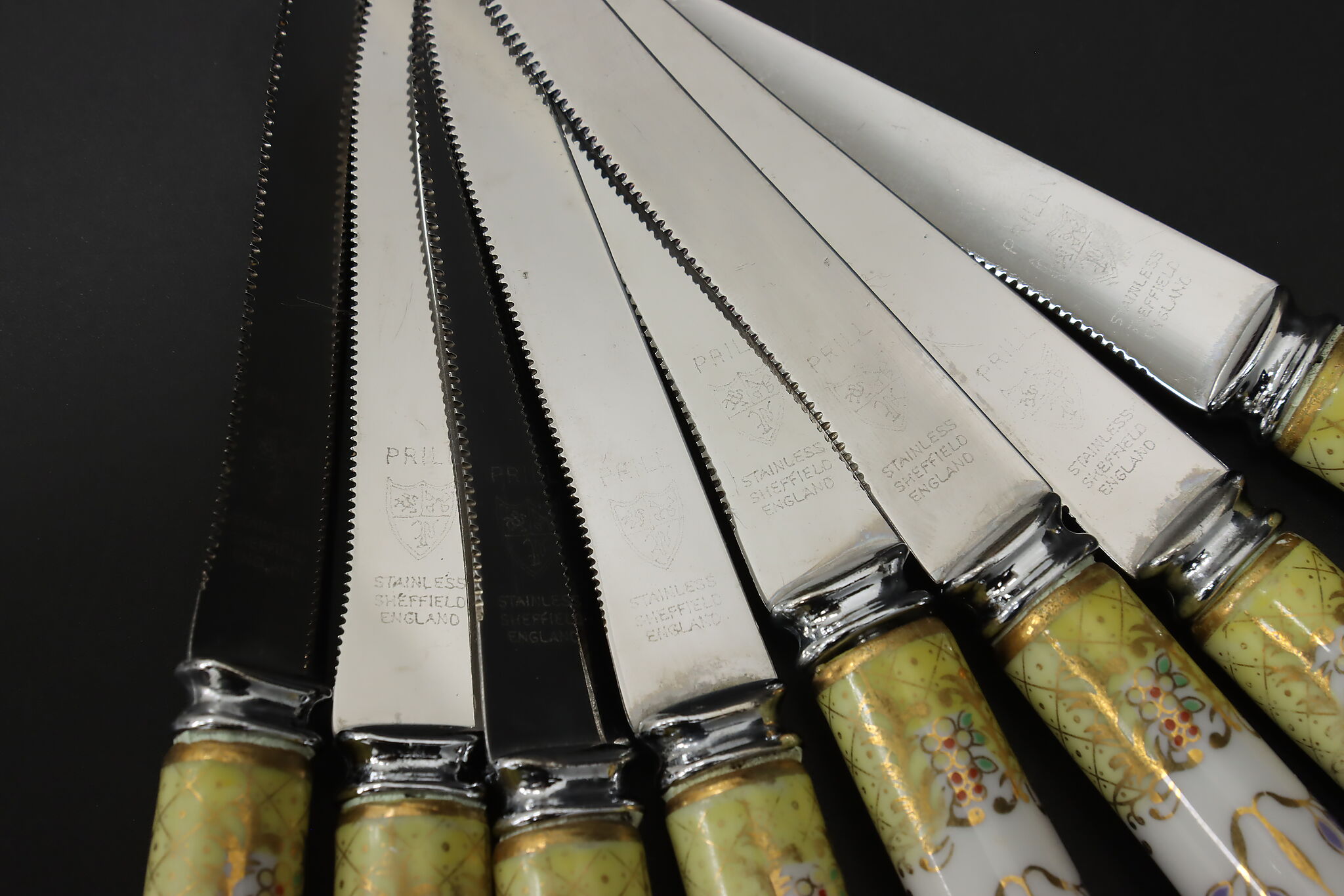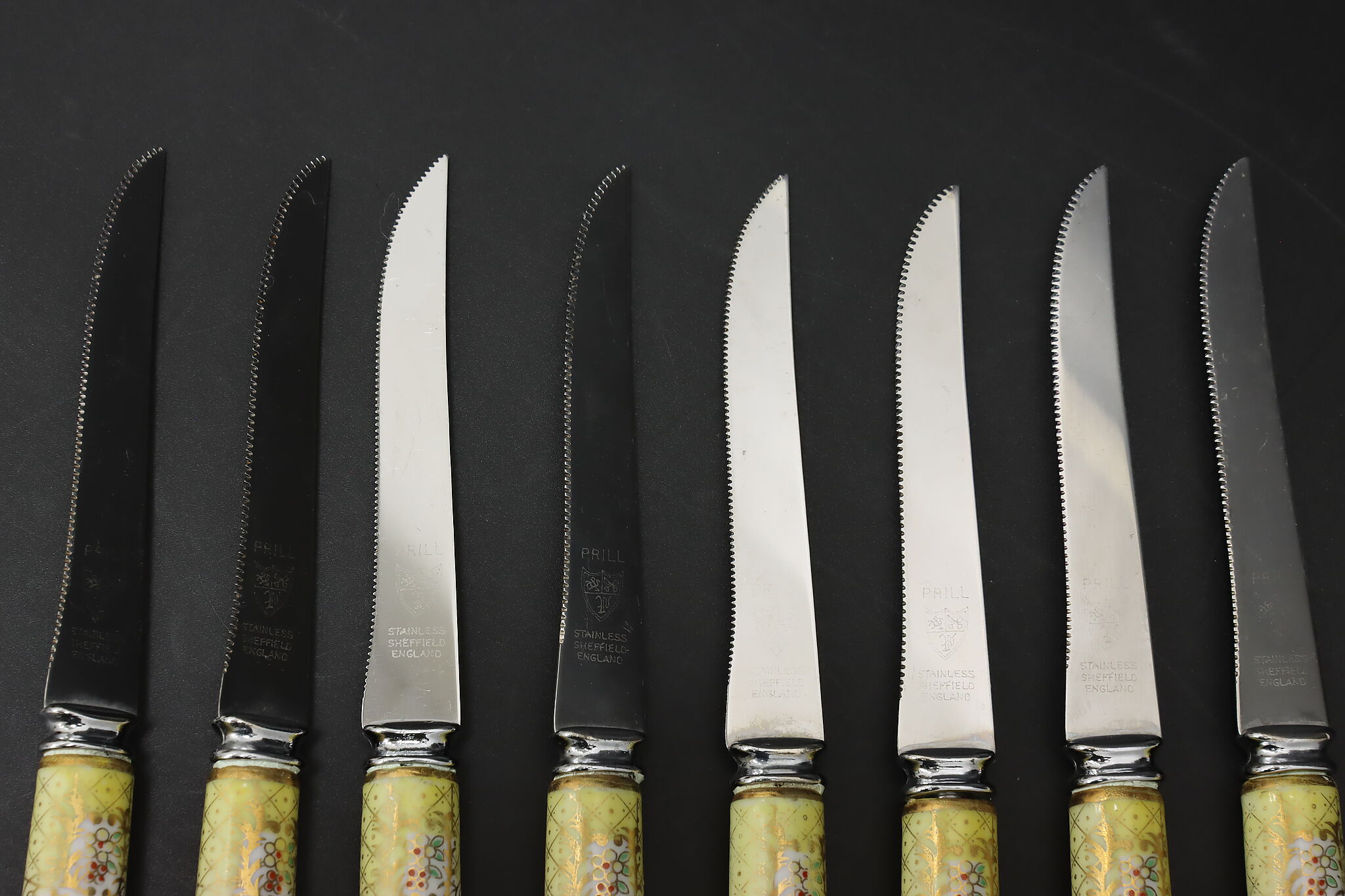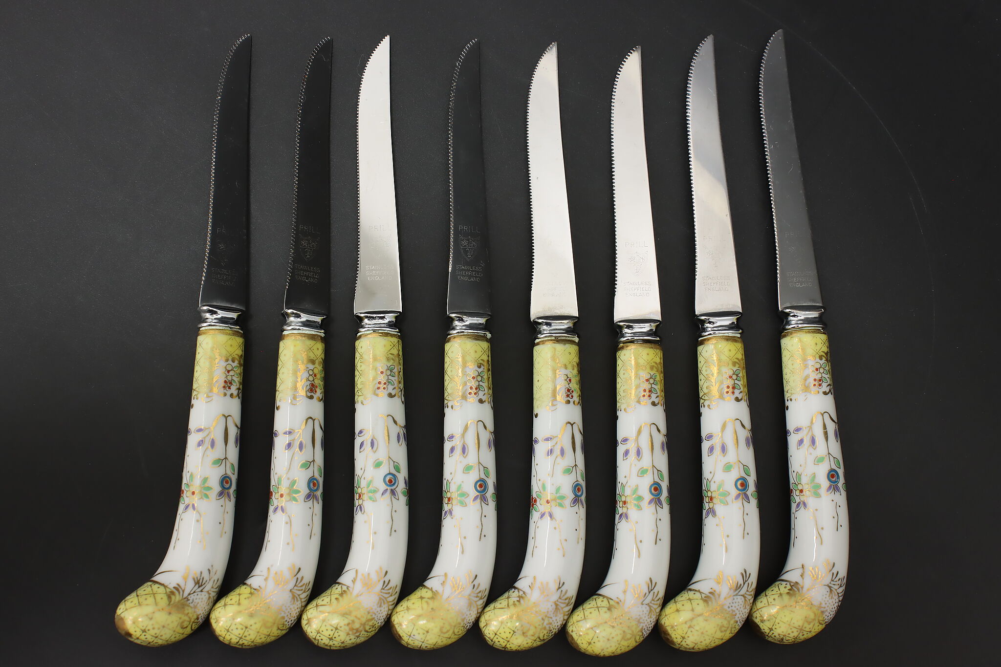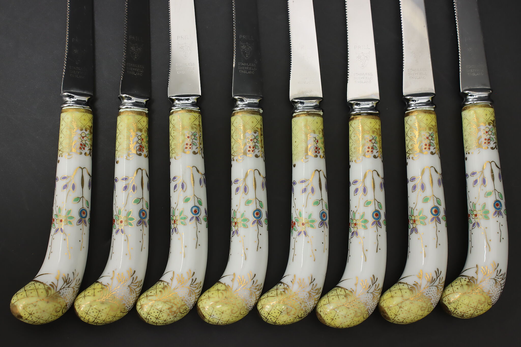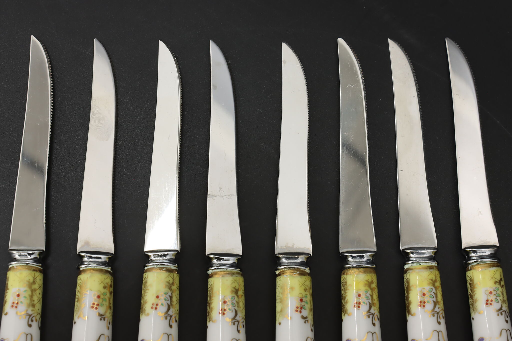 A set of eight dining knives have beautifully hand-painted porcelain handles.