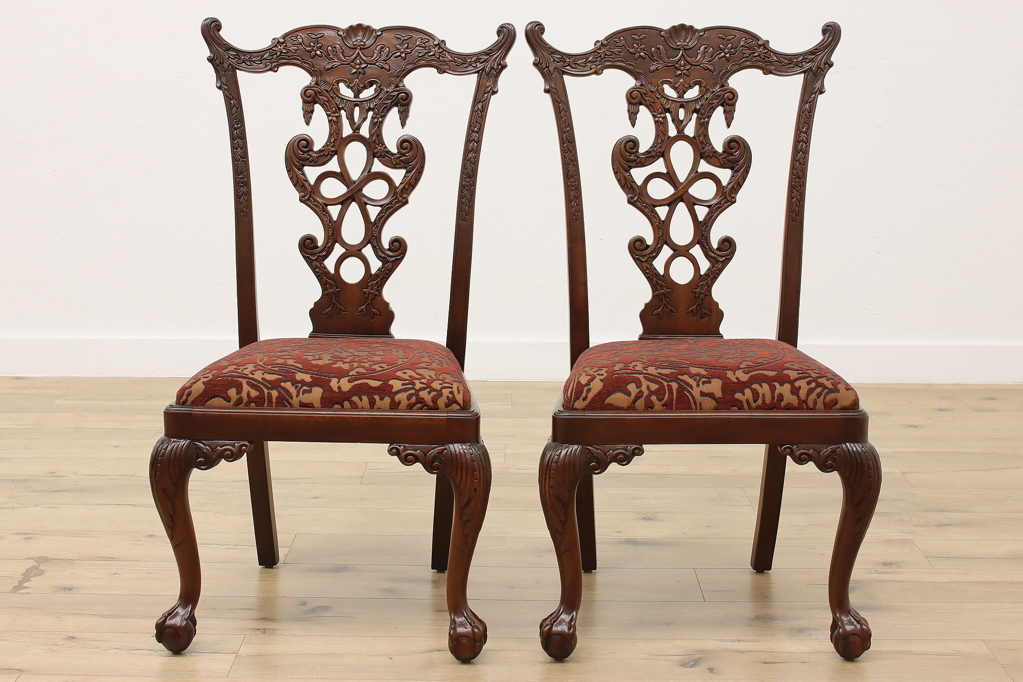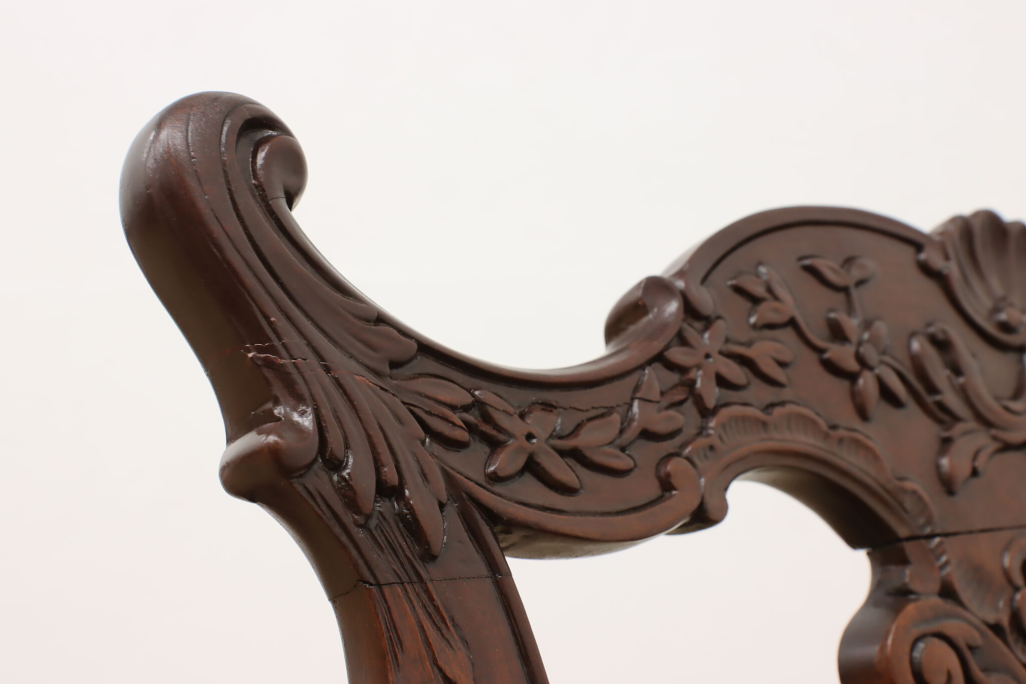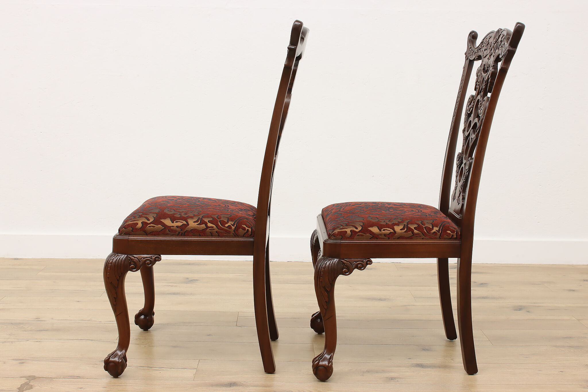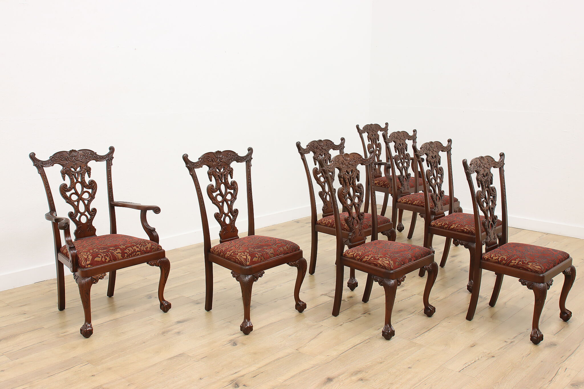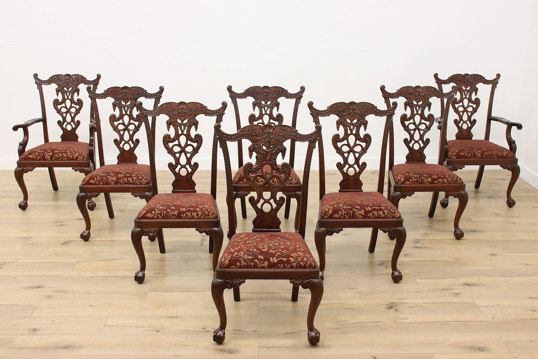 A gorgeously carved set of eight Georgian design dining chairs bring elegance and intricate craftsmanship.