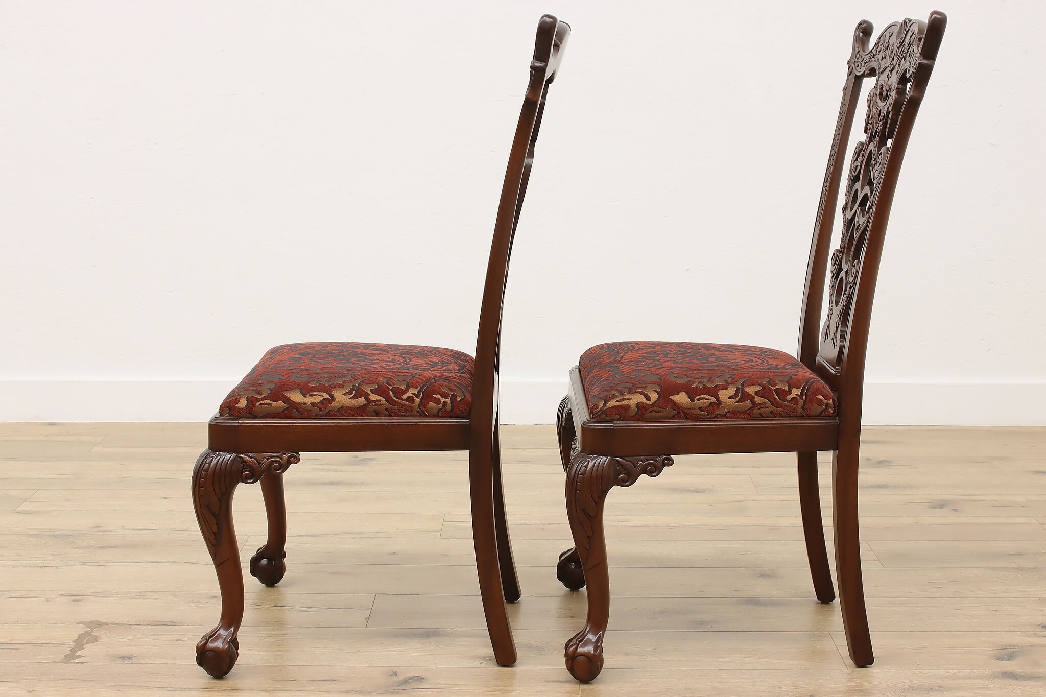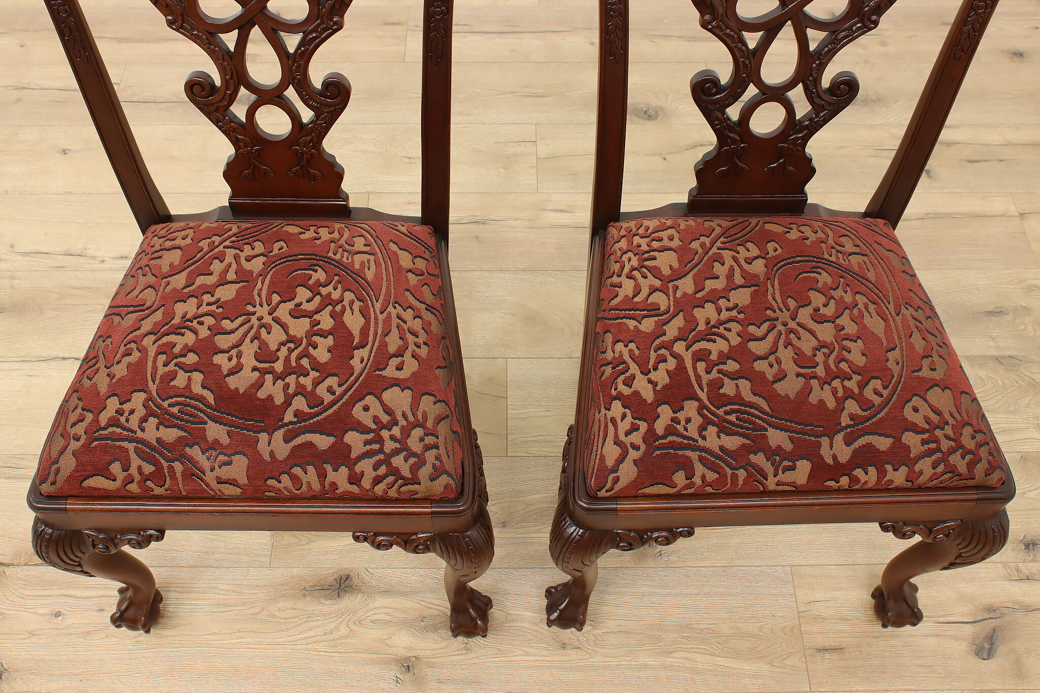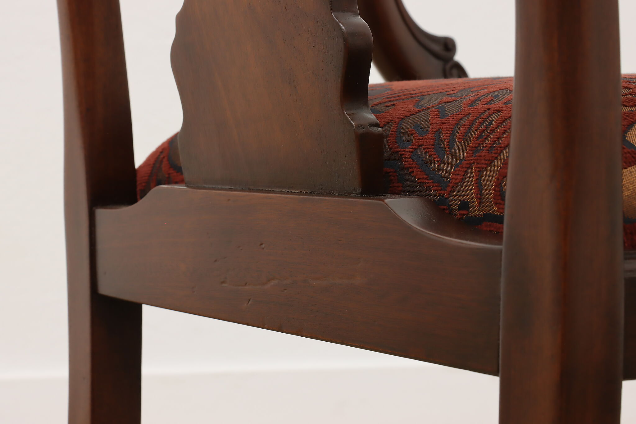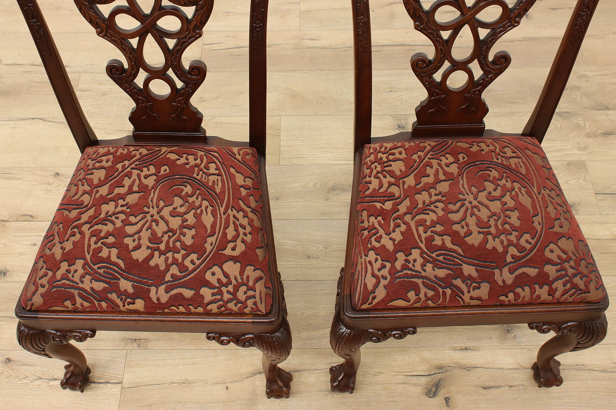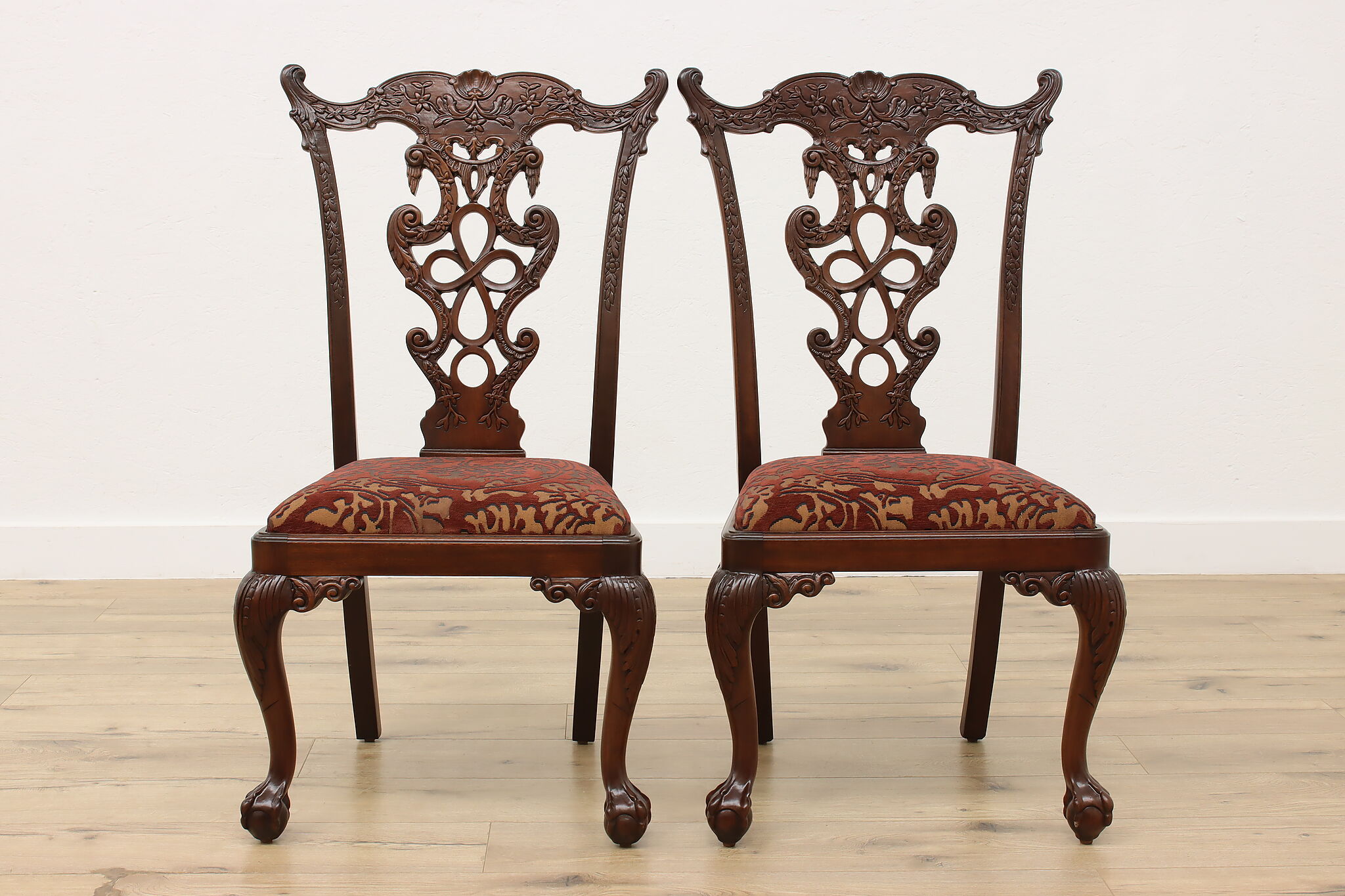 A gorgeously carved set of eight Georgian design dining chairs bring elegance and intricate craftsmanship.