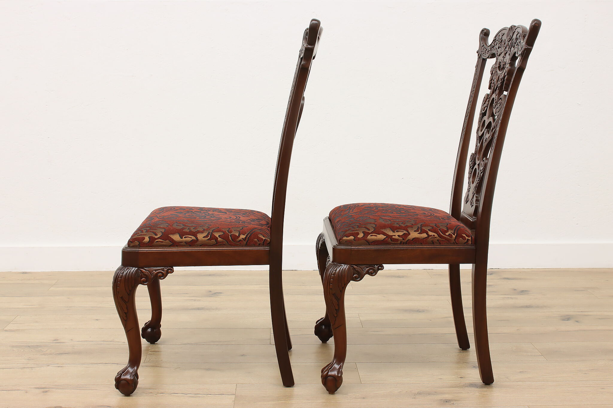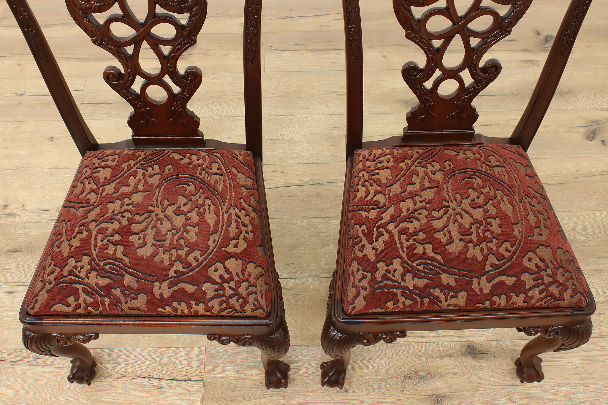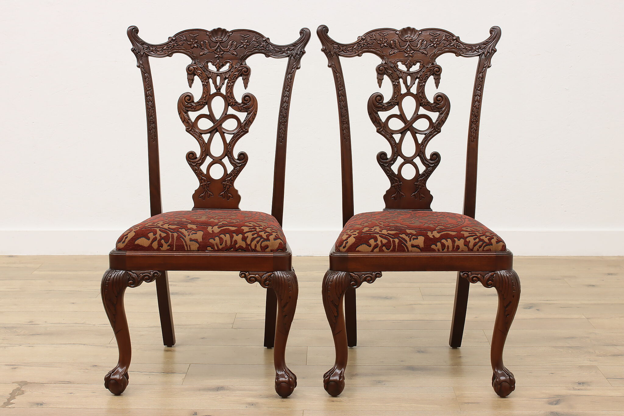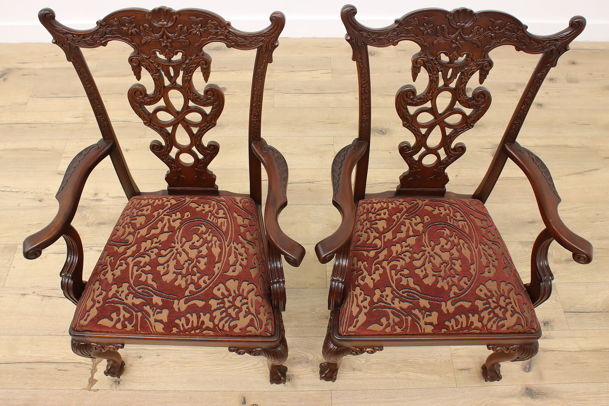 A gorgeously carved set of eight Georgian design dining chairs bring elegance and intricate craftsmanship.