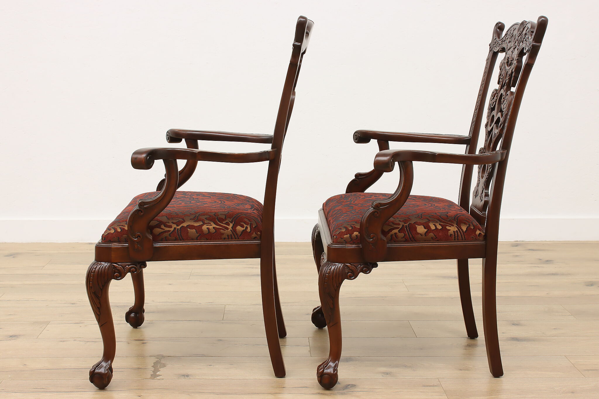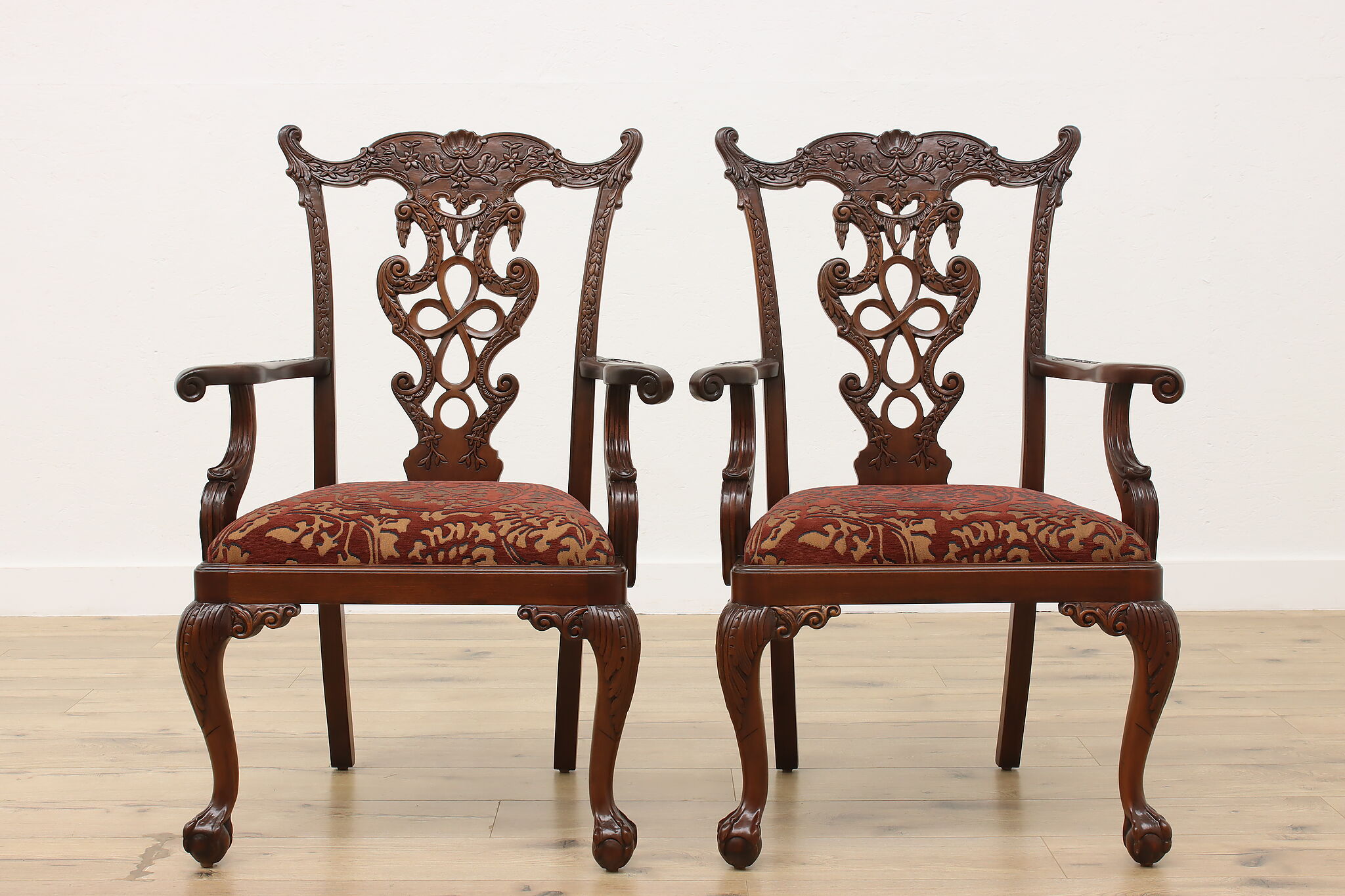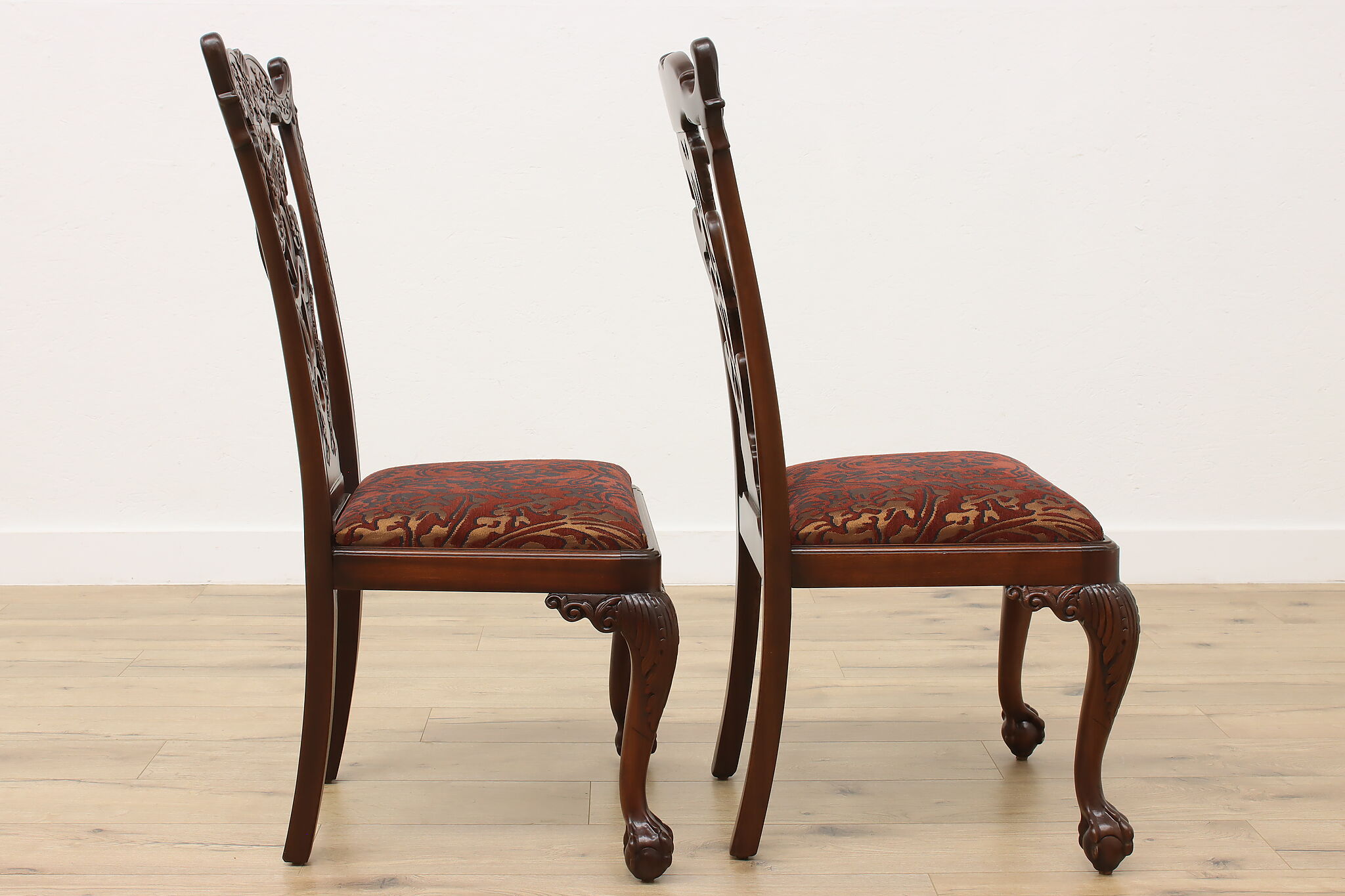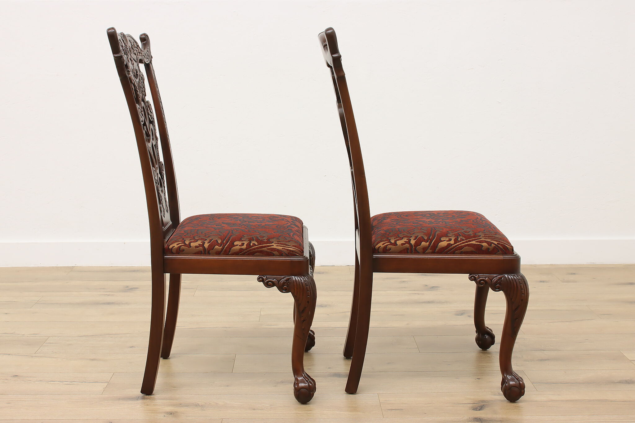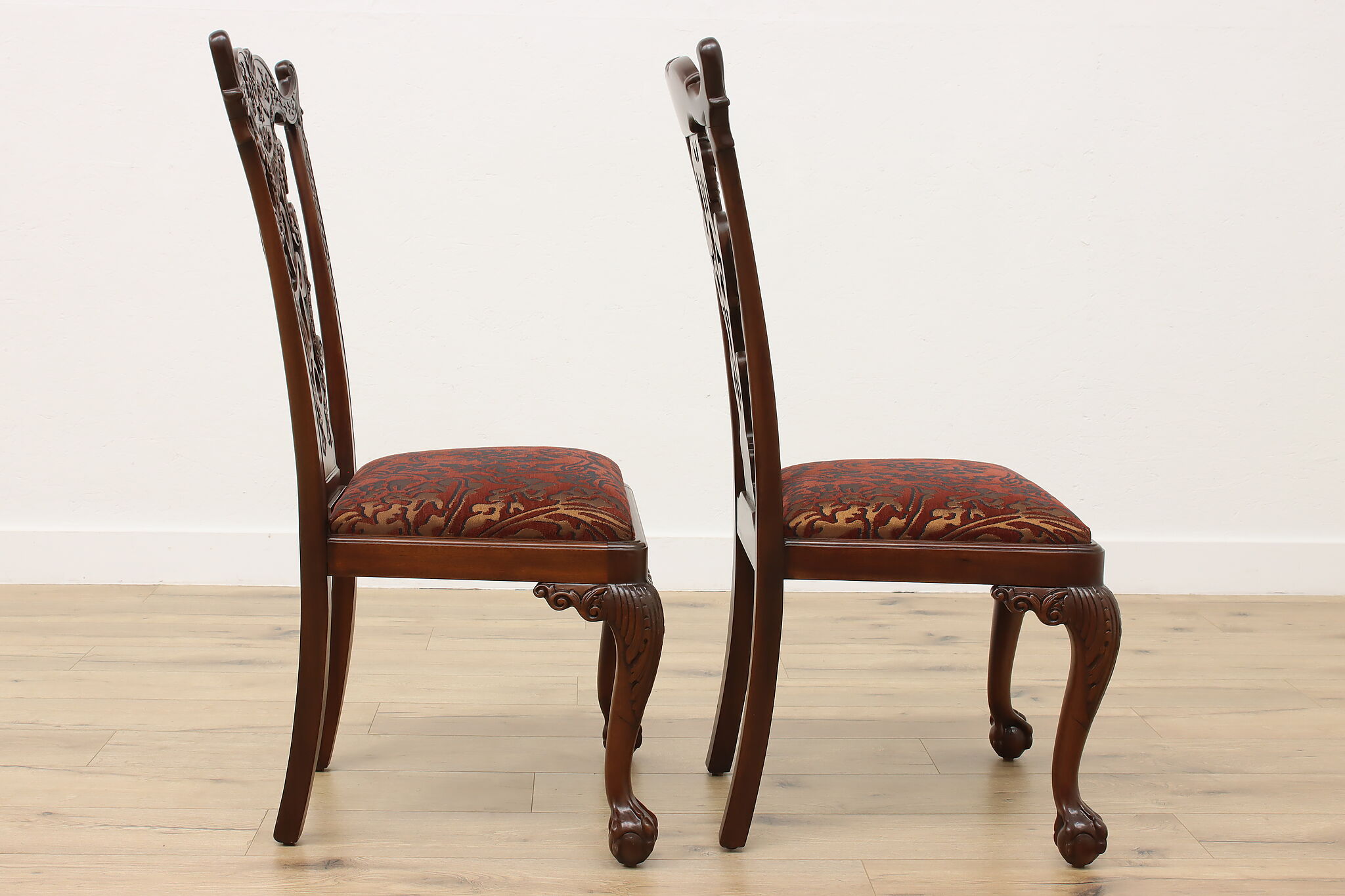 A gorgeously carved set of eight Georgian design dining chairs bring elegance and intricate craftsmanship.