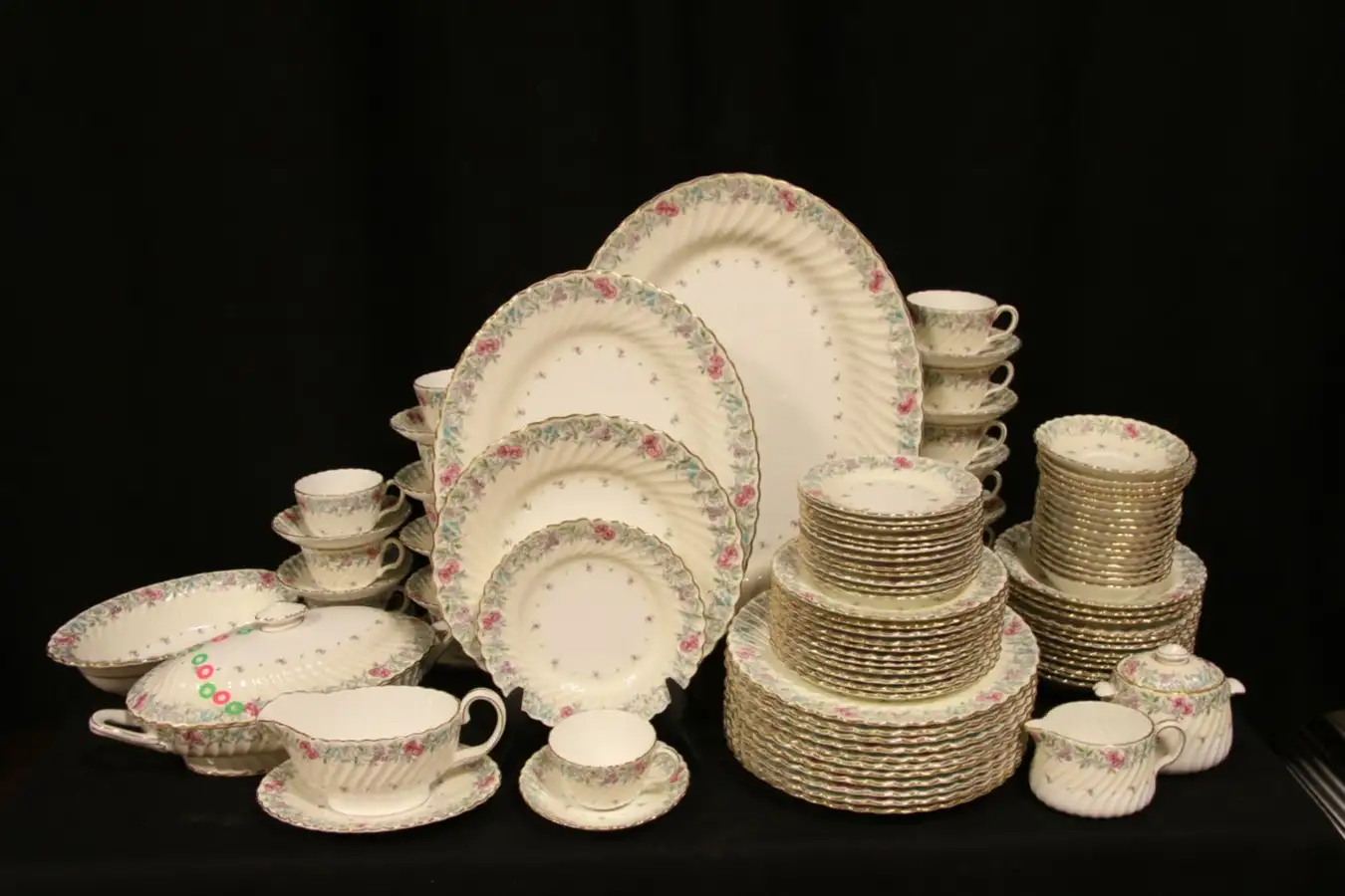 <ul><li>12 Dinner plates 10 1/2"<li>12 Salad plates 7 3/4"<li>12 Bread and butter plates 6"<li>12 Soup bowl 8"<li>11 Fruit bowls 5' (plus one with hairline crack)<li>15 Coffee or teacups 2 1/4" tall<li>19 Saucers 5 1/2" tall<li>Platter 15" x 11 1/2<li>Platter 17 1/2" x 14"<li>Oval serving bowl 10"<li>Sauce or gravy boat & underplate 8 1/2" long<li>Oval casserole 10 1/2" long, hairline crack to lid<li>Creamer 3" tall<li>Covered sugar 3 1/2" tall