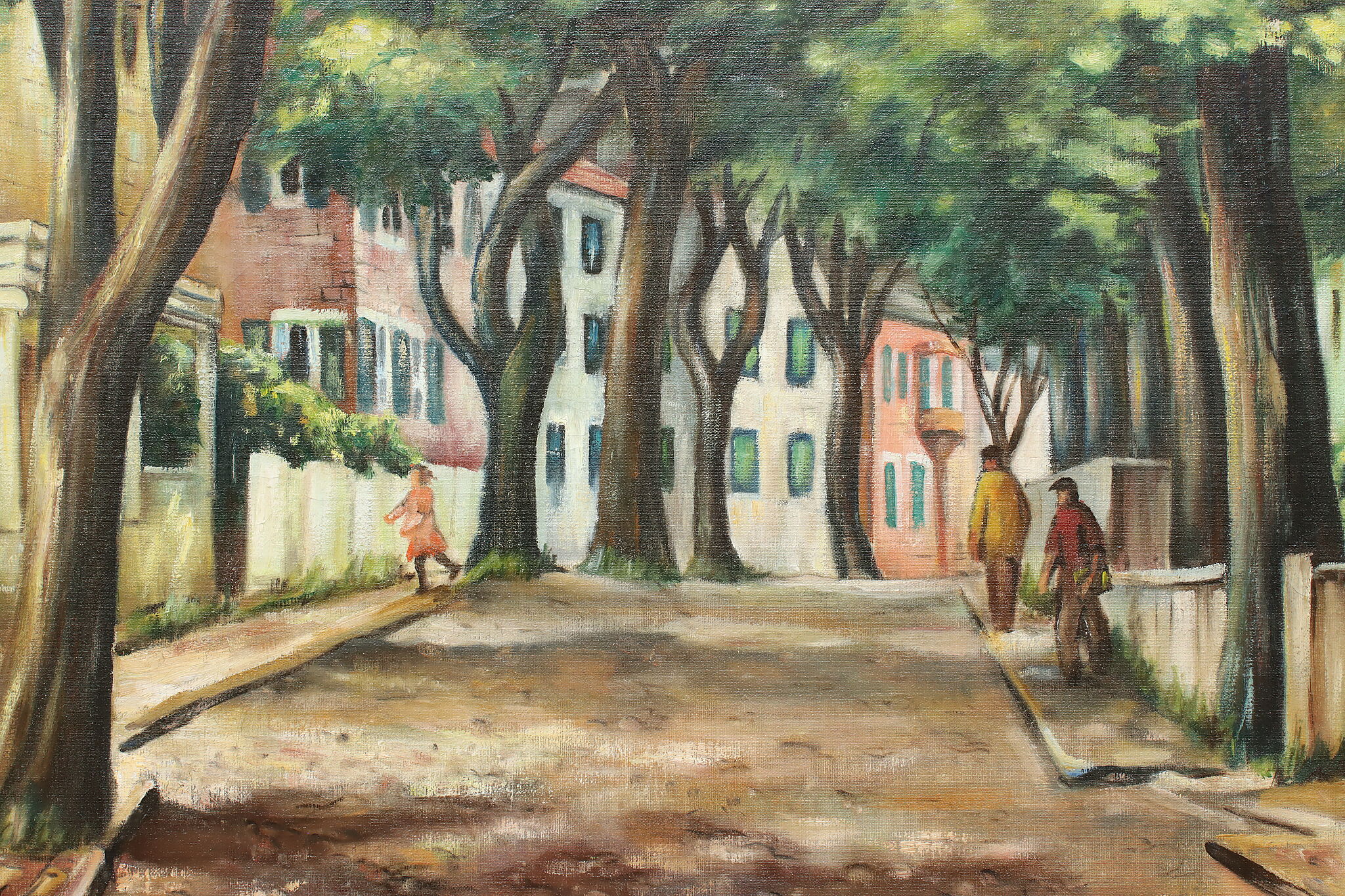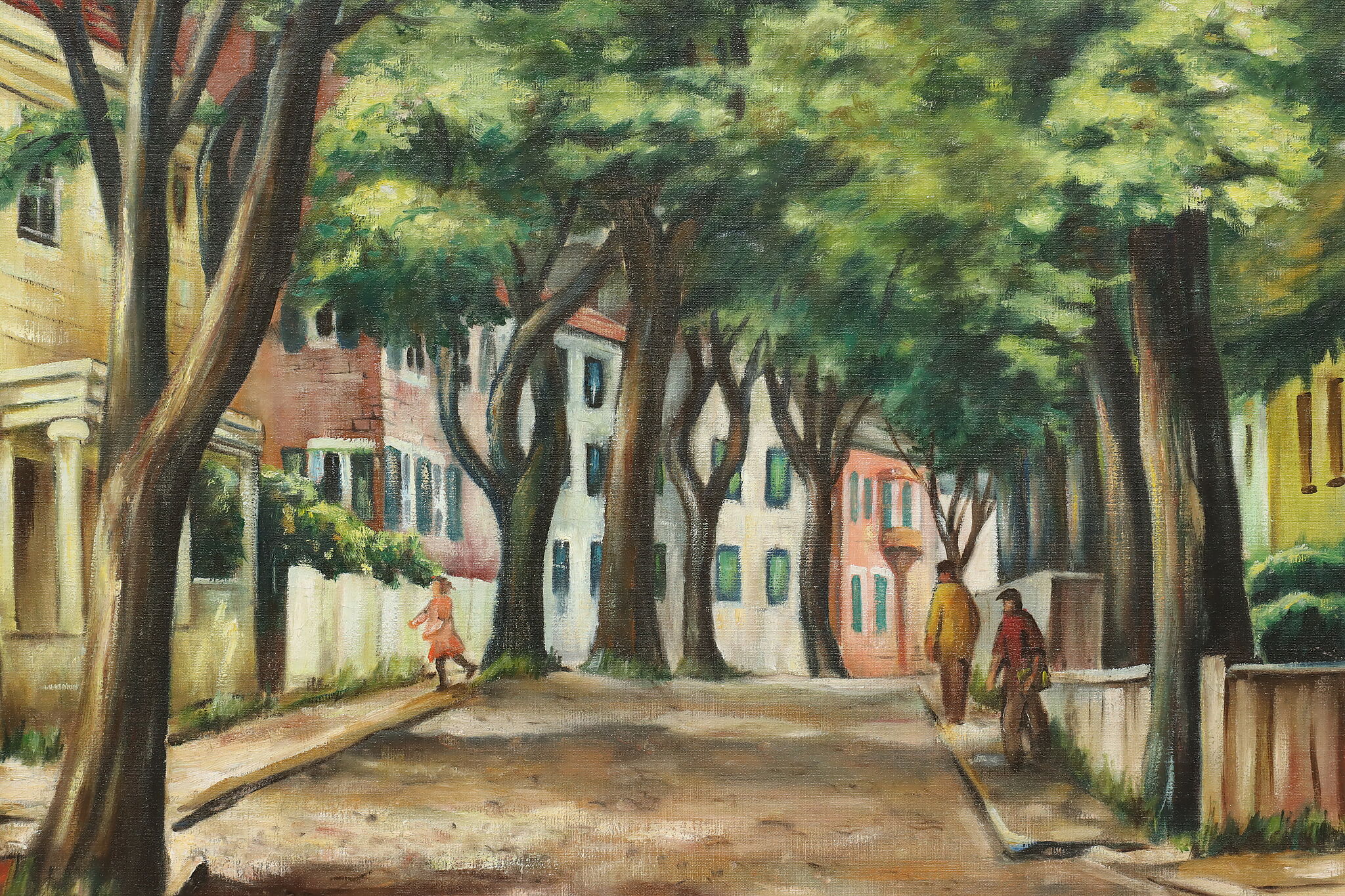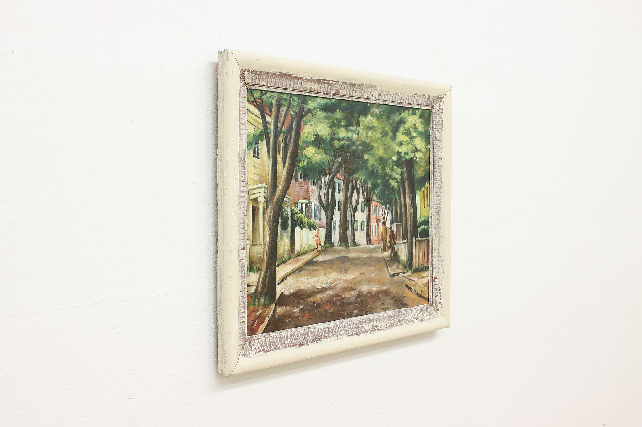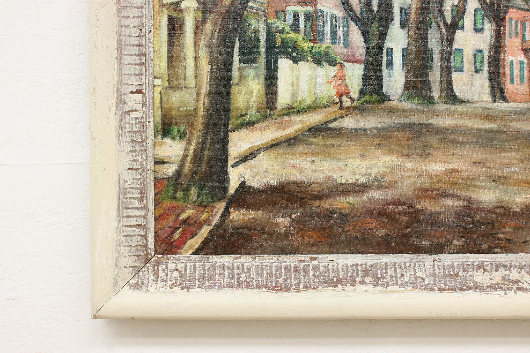 The artist of this painting gives us a view of a quiet neighborhood where a young girl plays on the shaded sidewalk.
