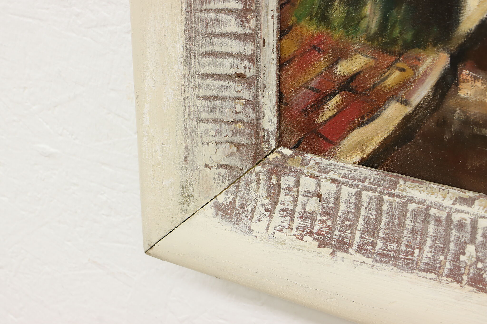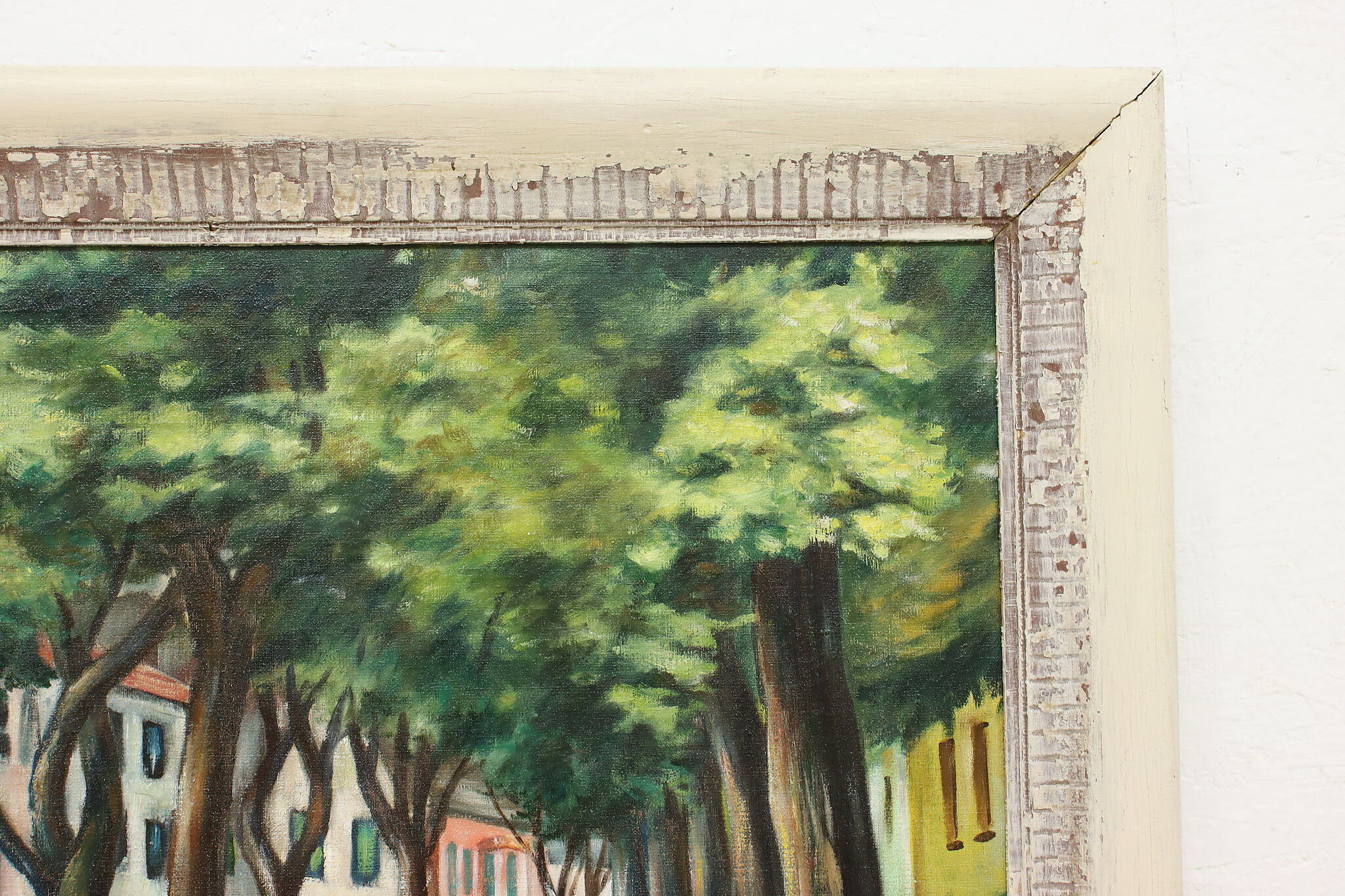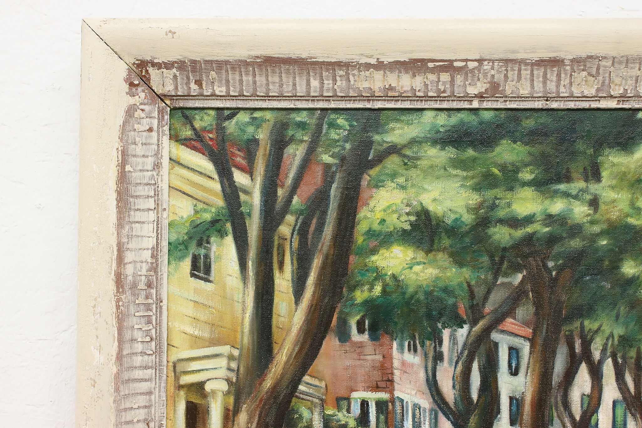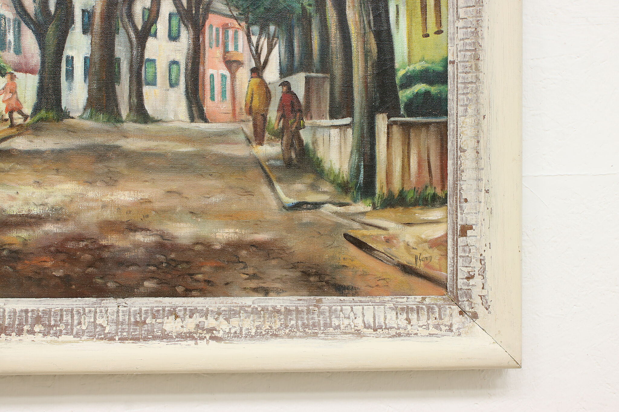 The artist of this painting gives us a view of a quiet neighborhood where a young girl plays on the shaded sidewalk.