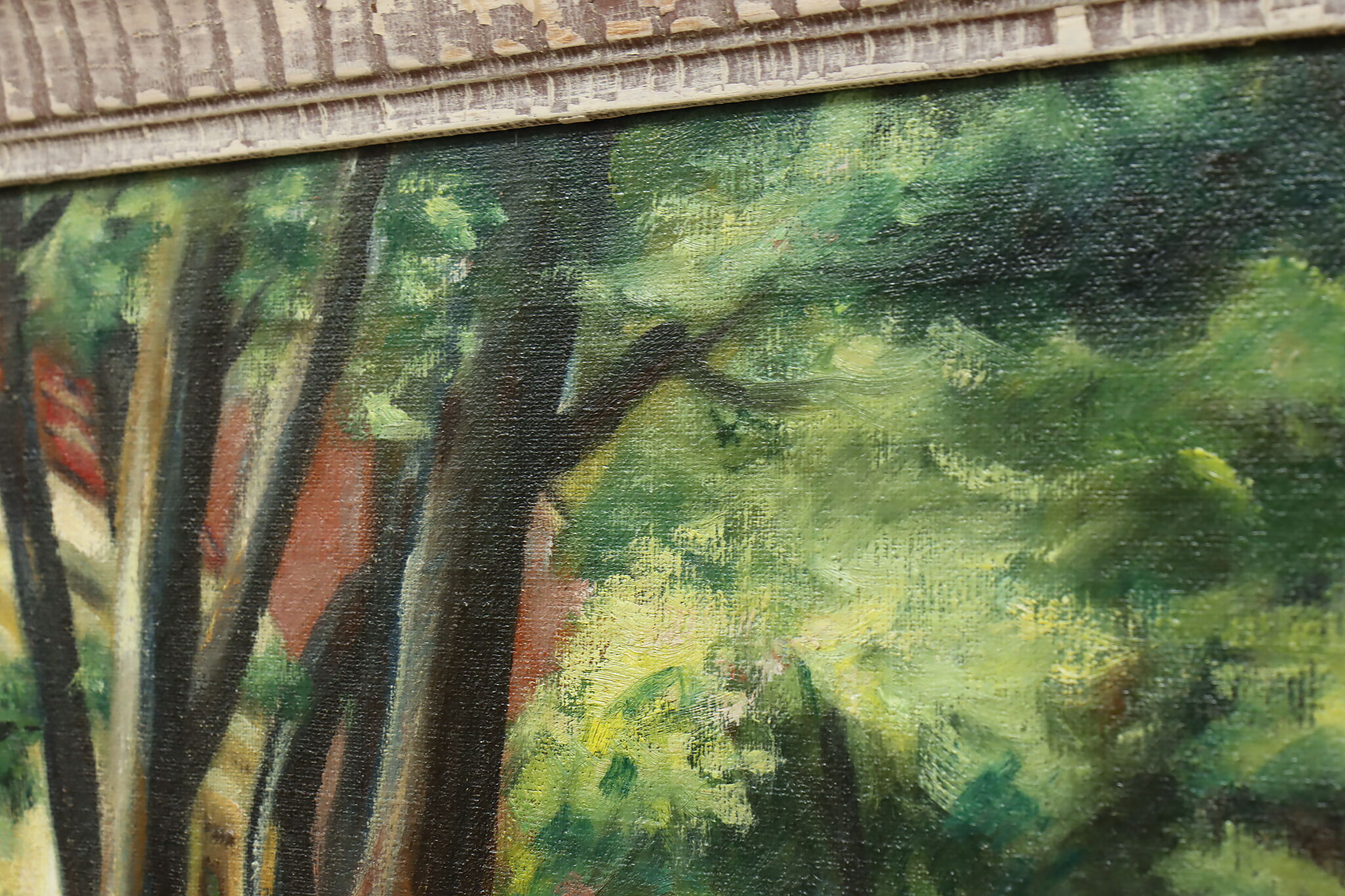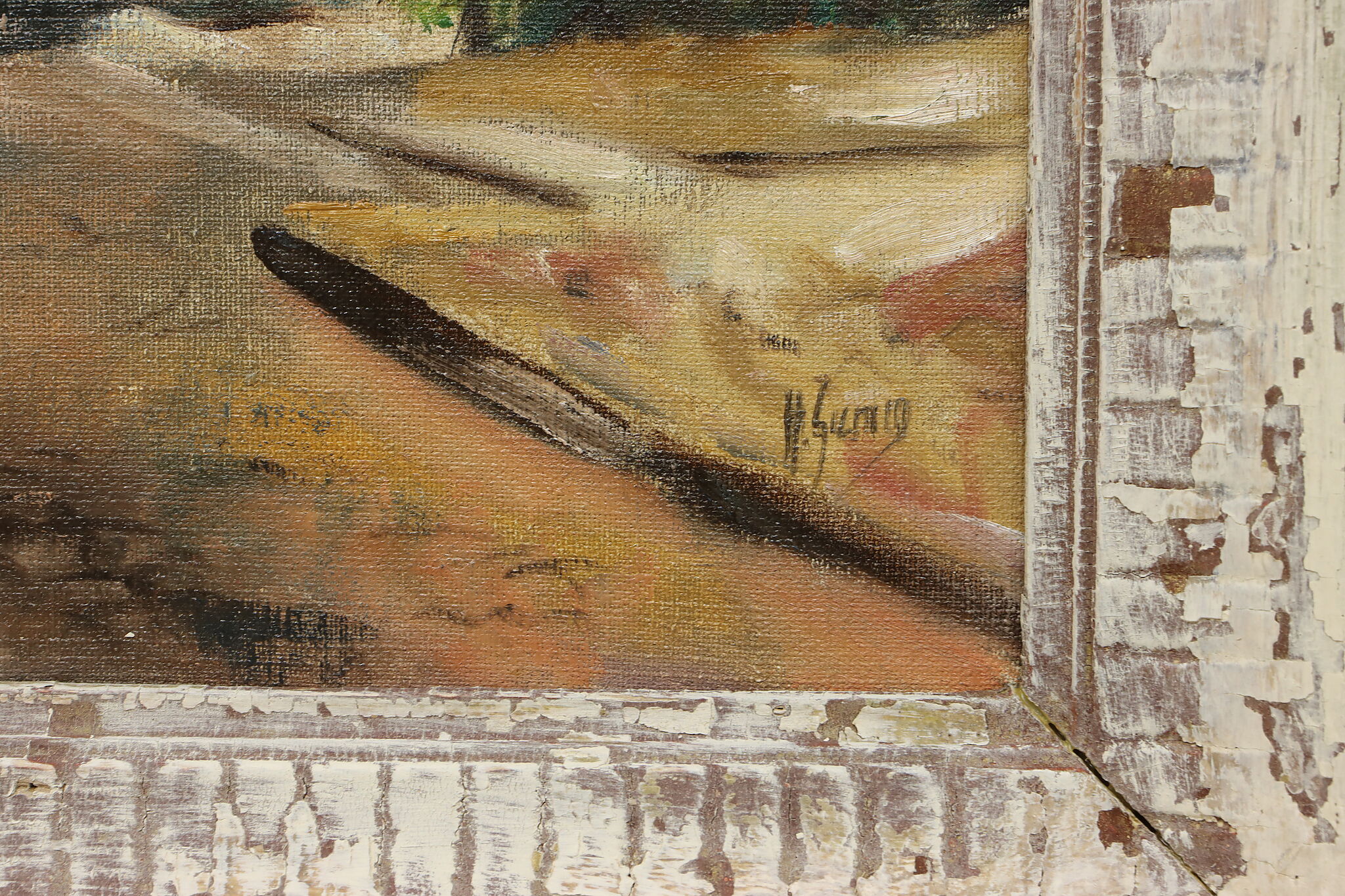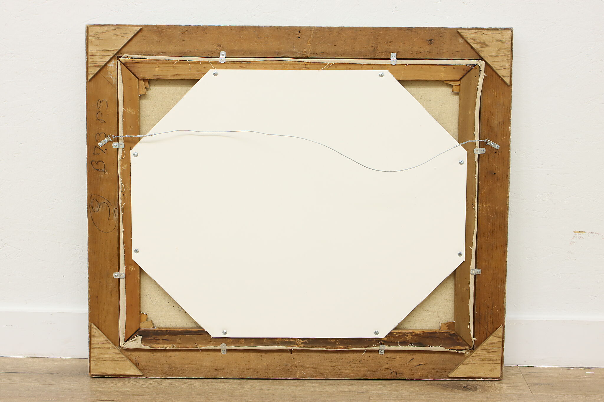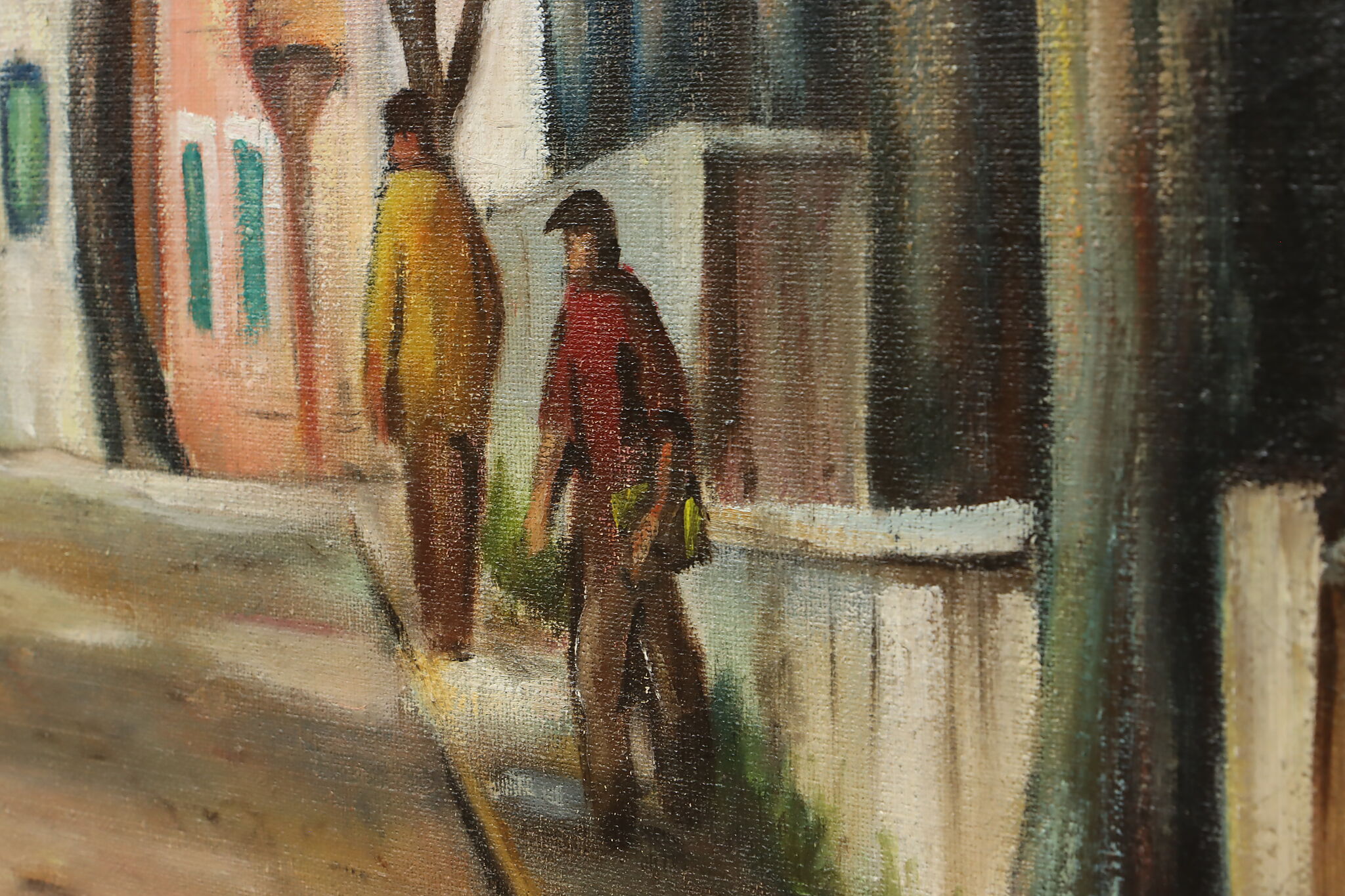 The artist of this painting gives us a view of a quiet neighborhood where a young girl plays on the shaded sidewalk.