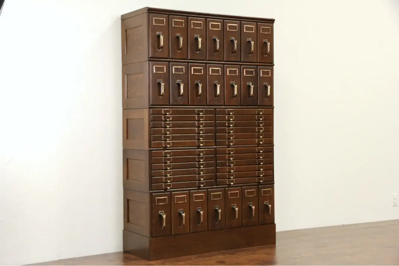 A splendid stacking file cabinet from about 1900 with 45 drawers is signed "Shaw Walker, Chicago, Muskegon & NY."