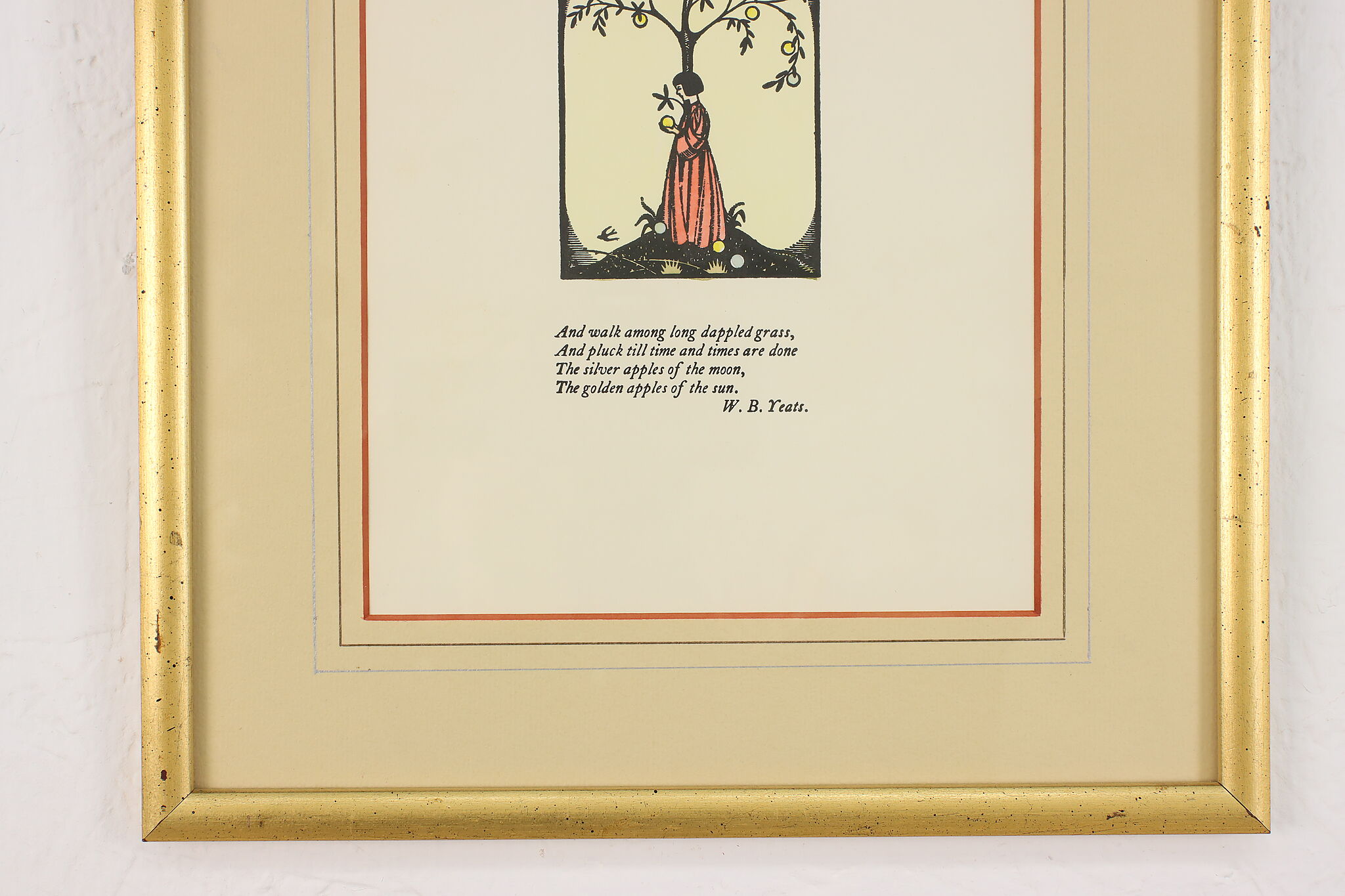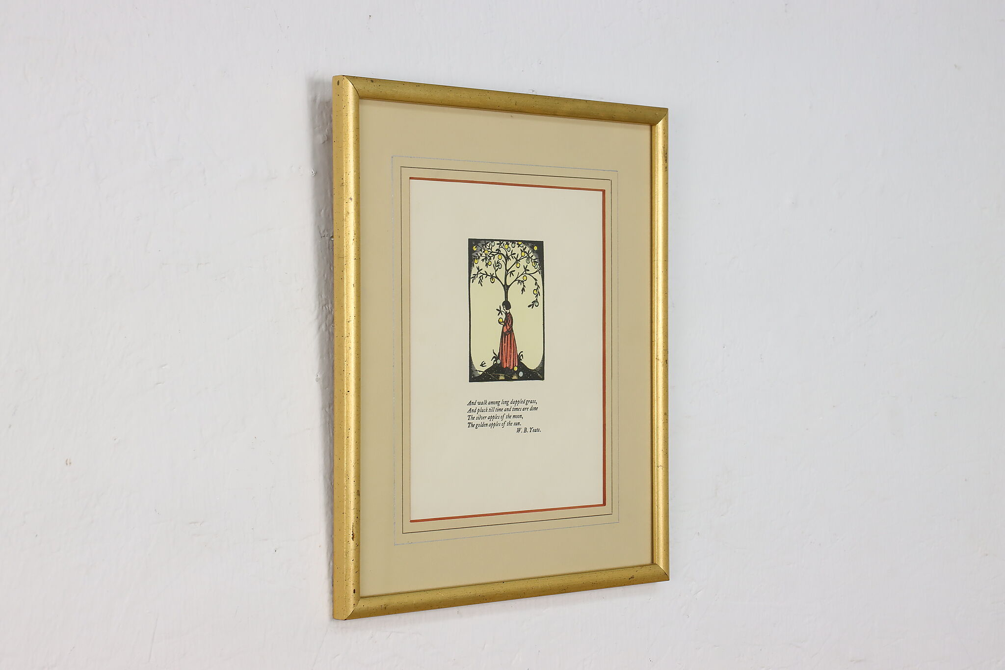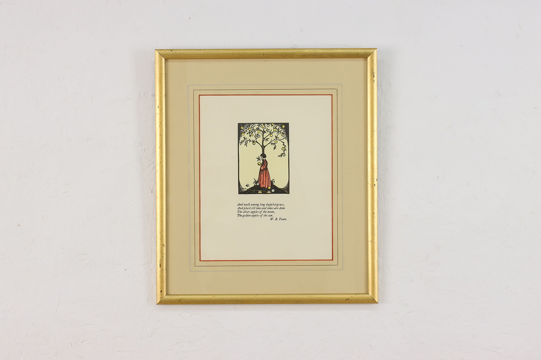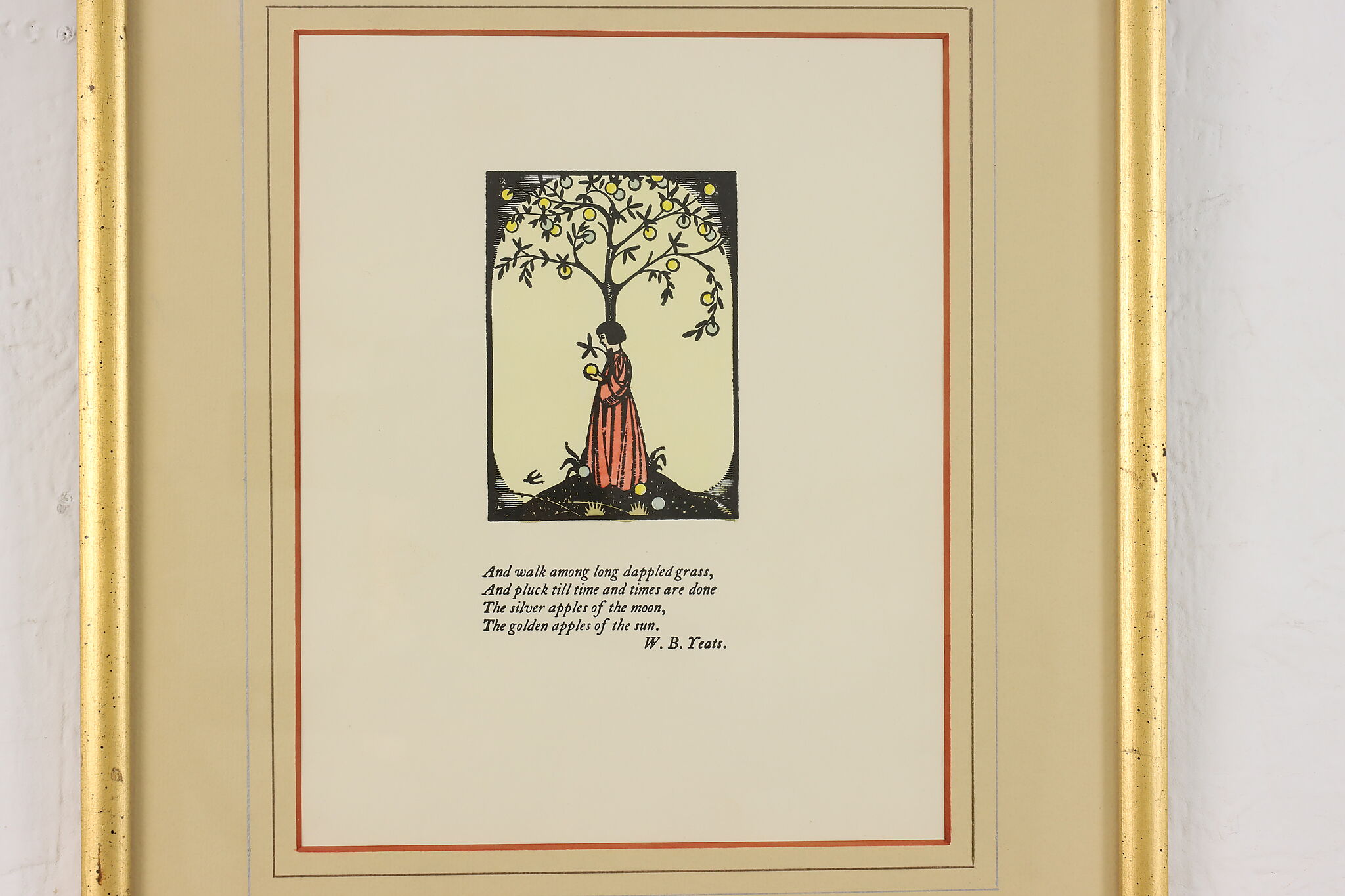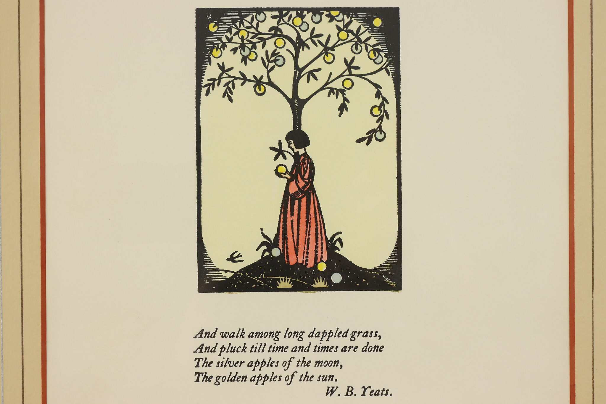 Published by Cuala Press, this print is of William Butler Yeats's last four lines of "The Song of the Wandering Aengus" poem with a lovely illustration.