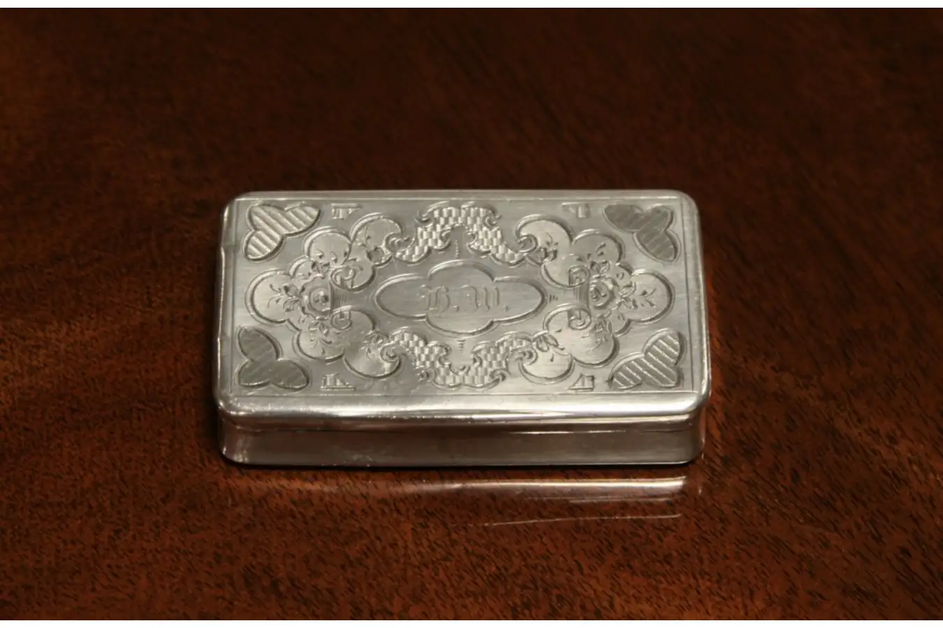 There is a monogram on this antique, plus dings, mars and wear as shown. The gold wash inside was to prevent chemical reactions with the matches.