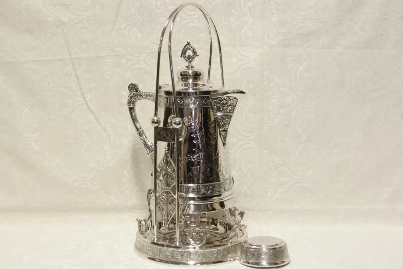 A lavish Victorian tilting water pitcher has its original stand, hand engraved by famous silversmith "Pairpoint Quadruple Plate" of Massachusetts.