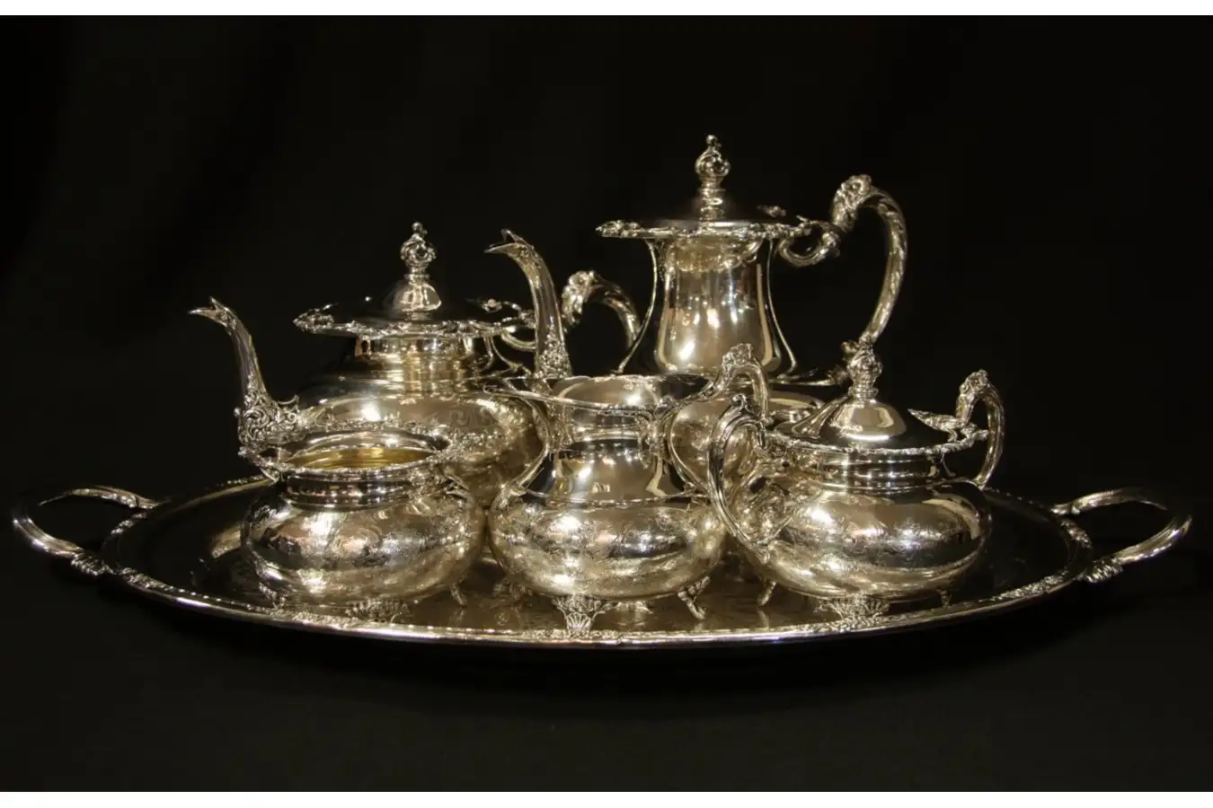 These are 1940's era replicas of an English classic 18th Century design. The oval tray is similar but not matching, it is signed "Camille" pattern by "International Silver." There are small scratches and pitting, in the center of the delicate engraving is a monogram, see photos.