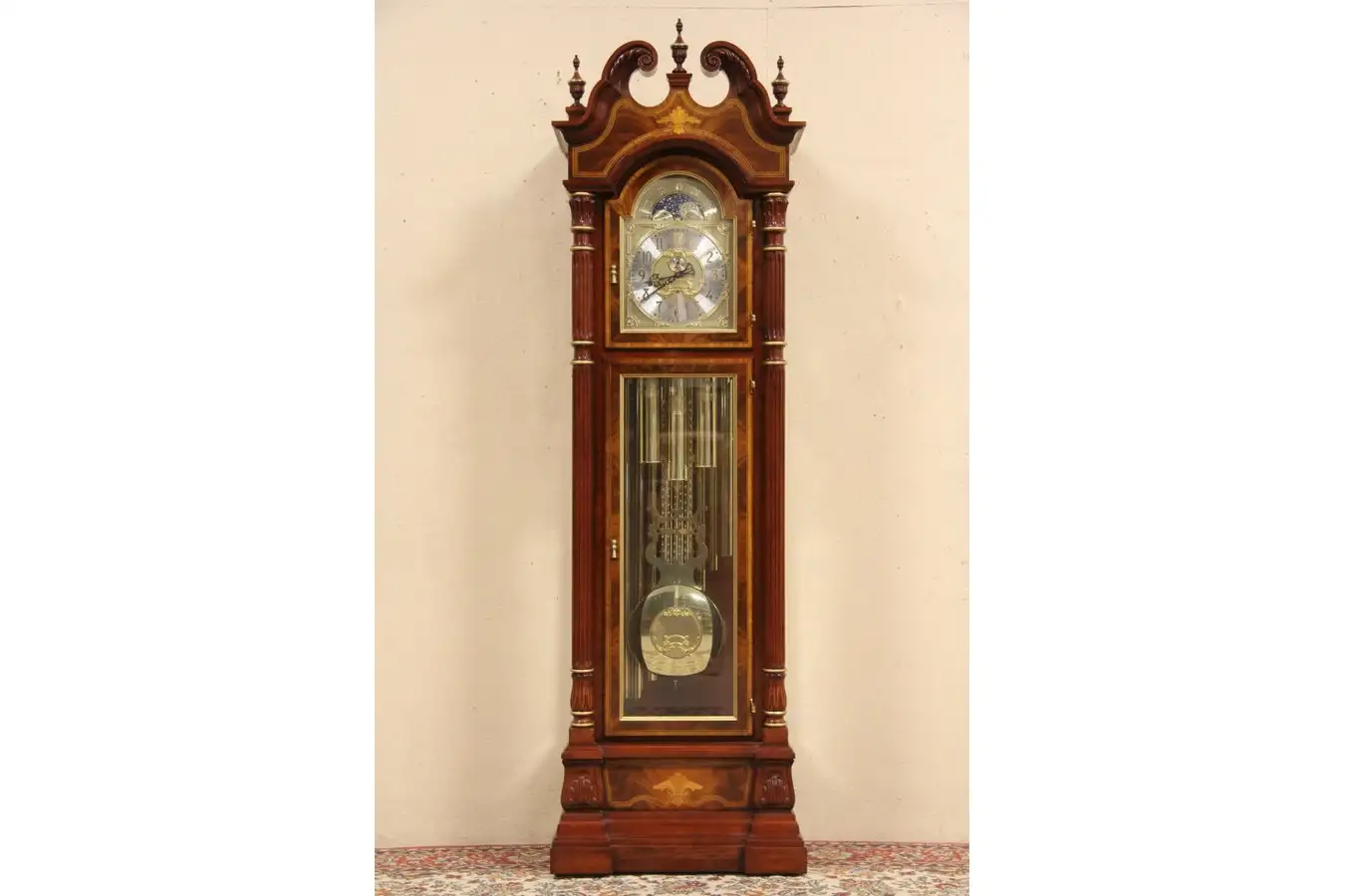 Signed by famous clockmaker, "Charles R. Sligh, Limited Edition, #322 of 1000," a spectacular tall case or grandfather clock is about 20 years old.