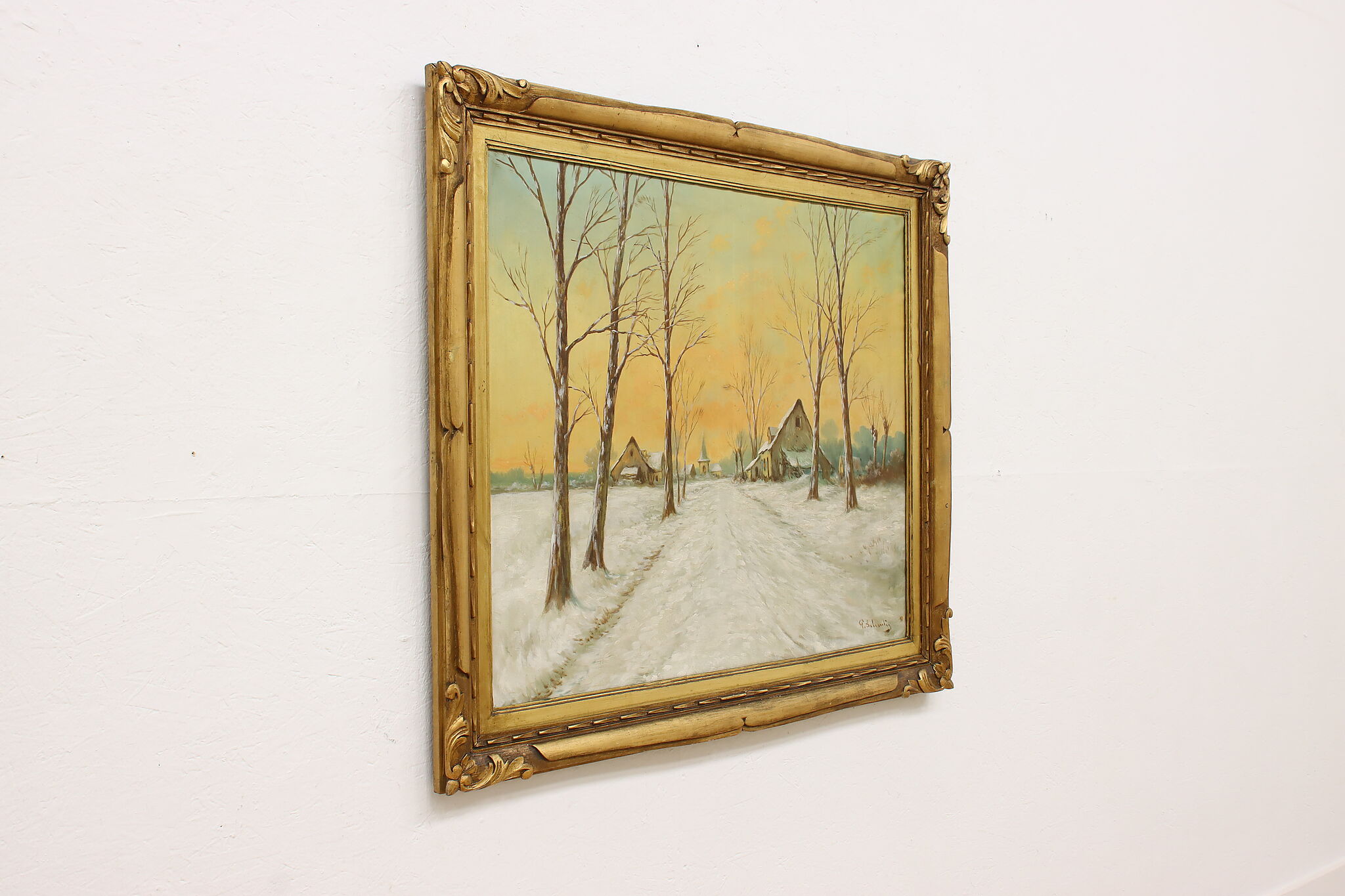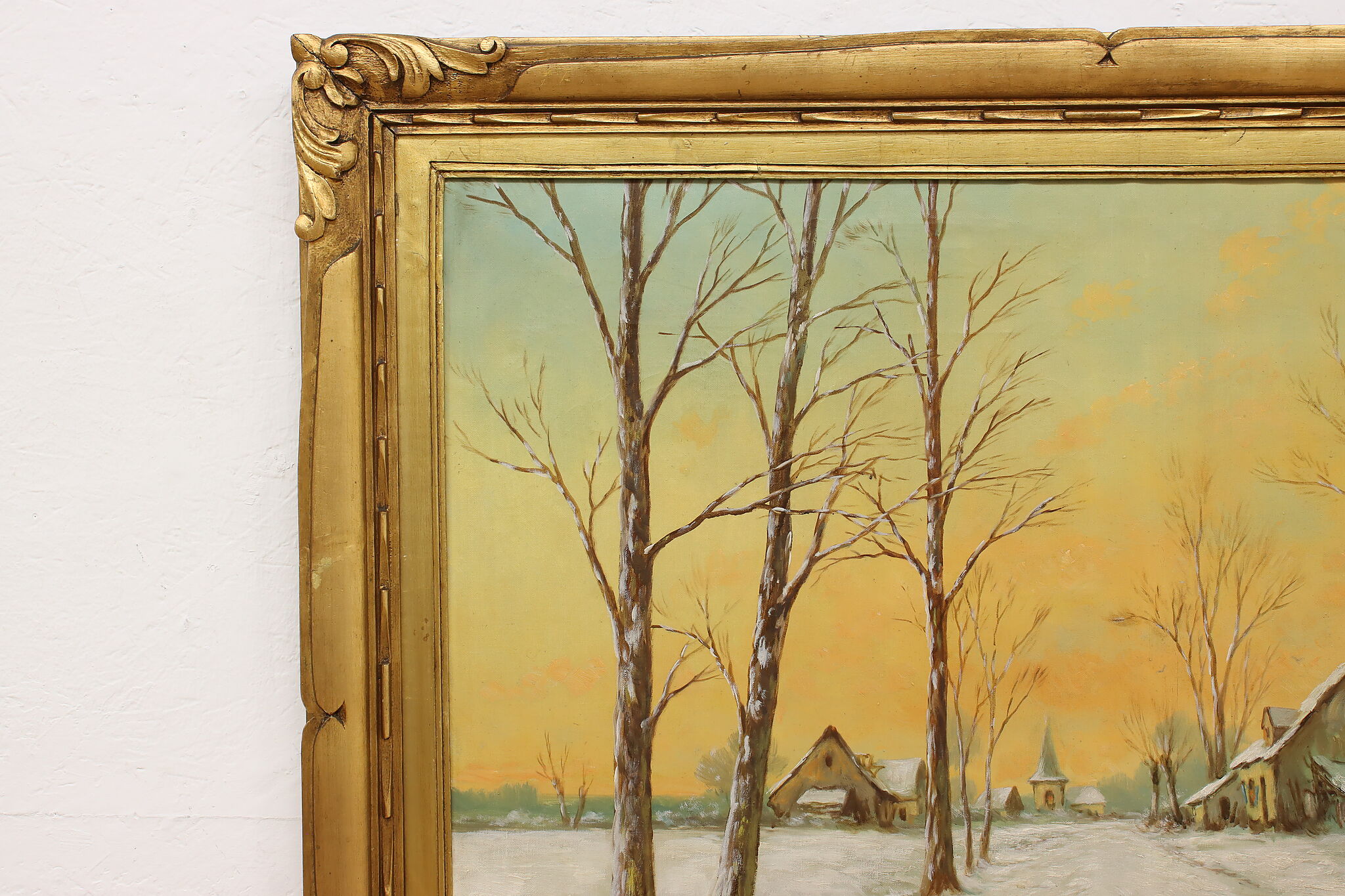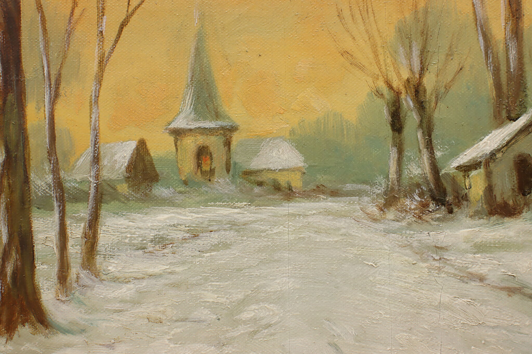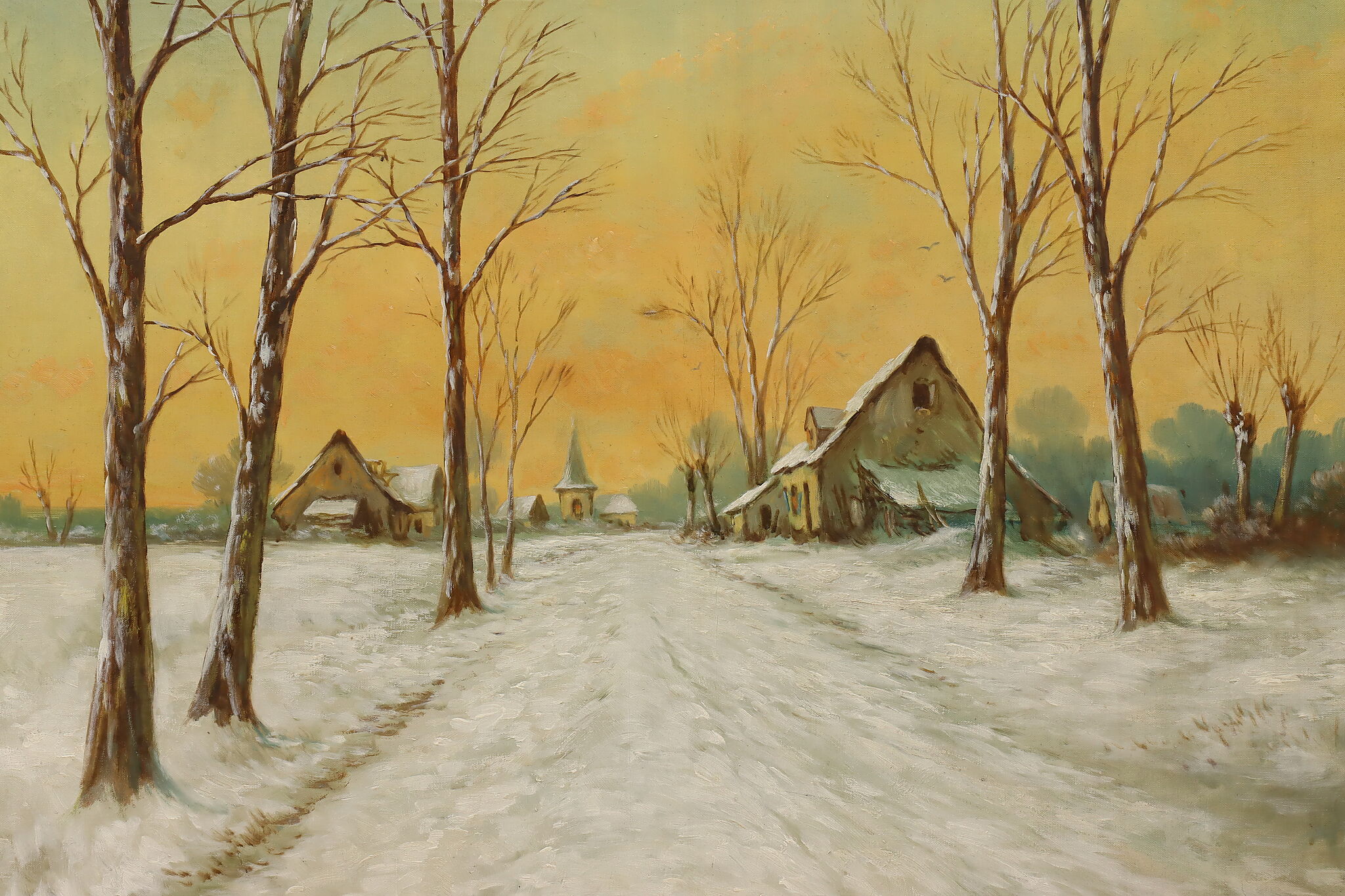The artist of this painting gives the viewer his view of a road leading home to a snow-covered village with its tall church steeple.