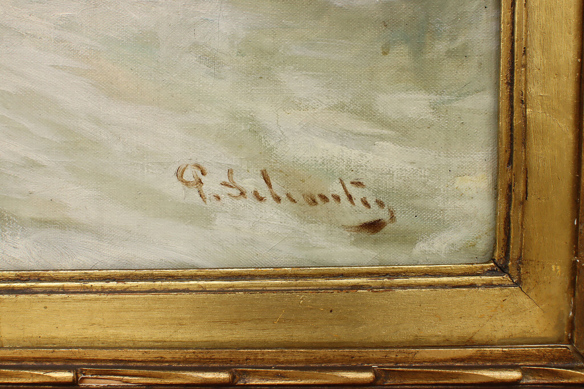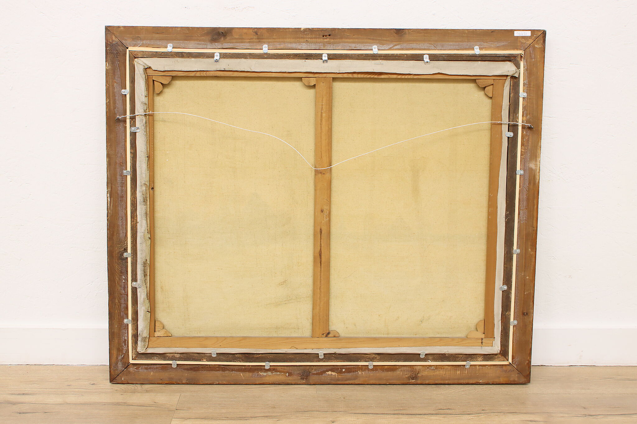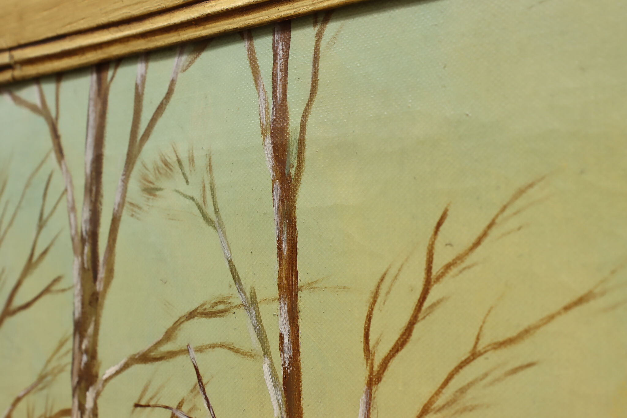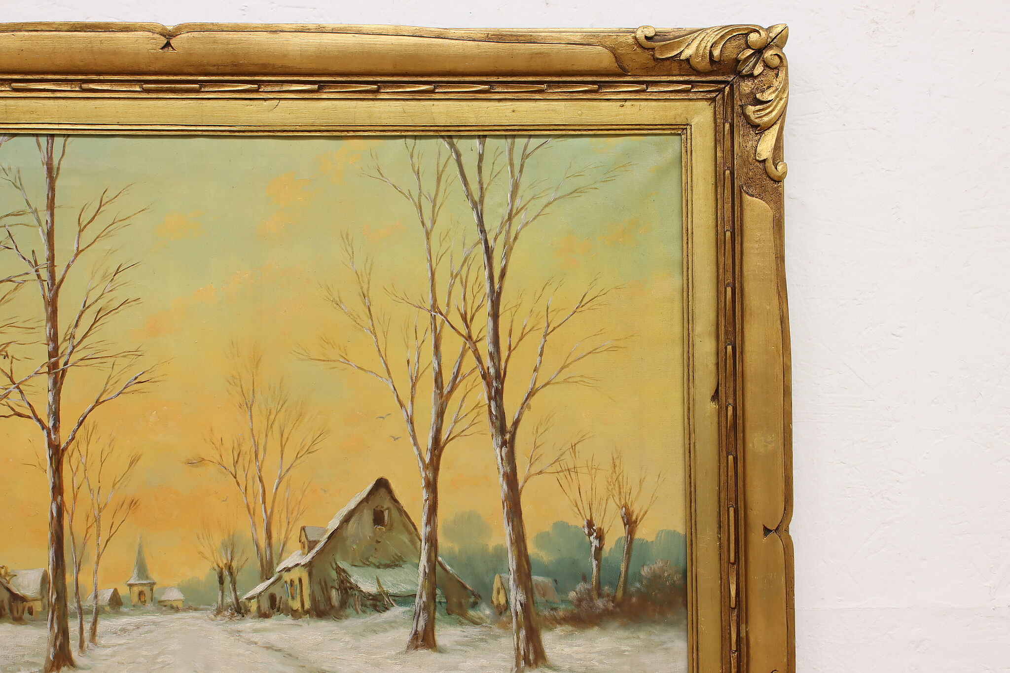The artist of this painting gives the viewer his view of a road leading home to a snow-covered village with its tall church steeple.