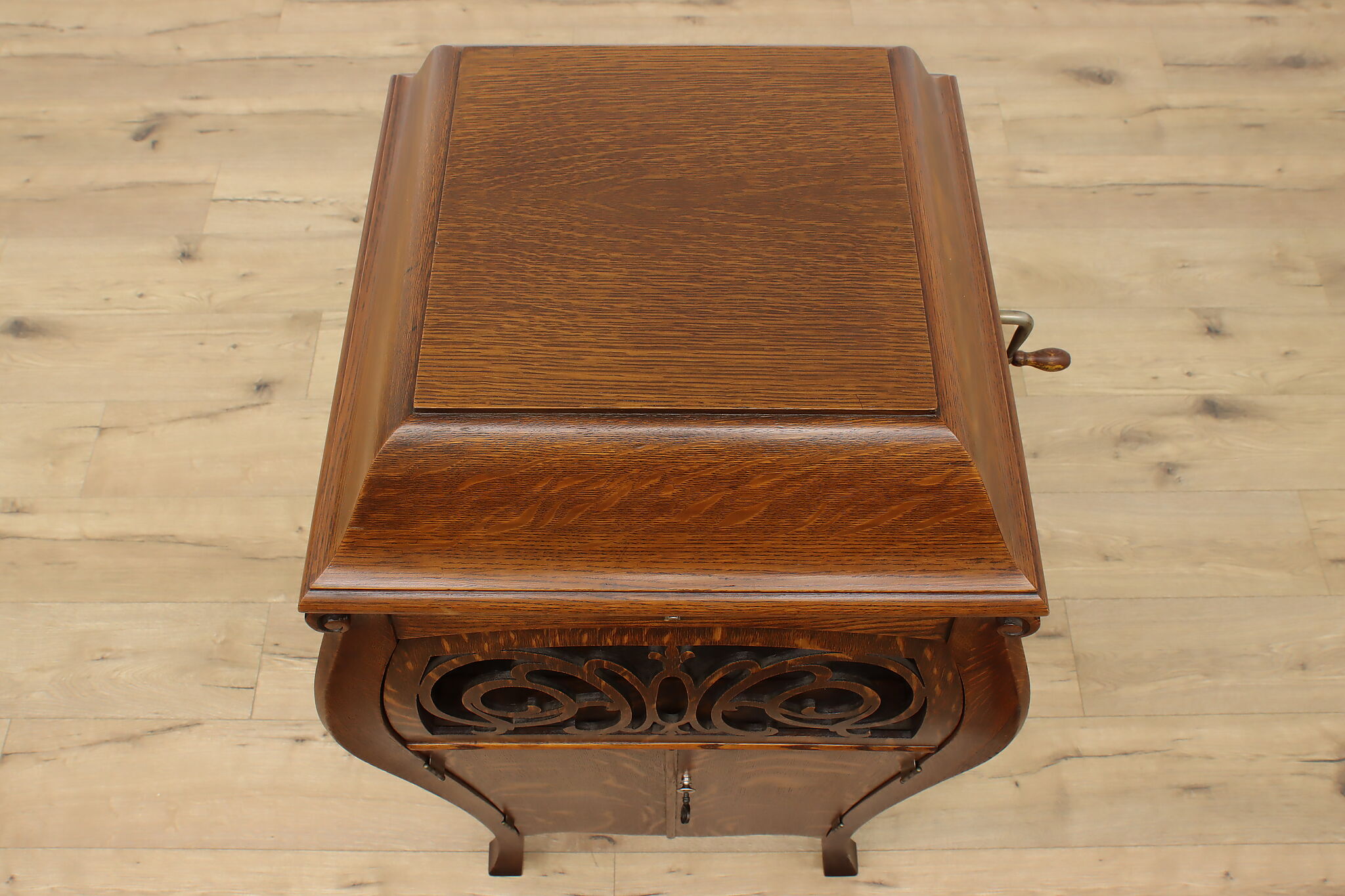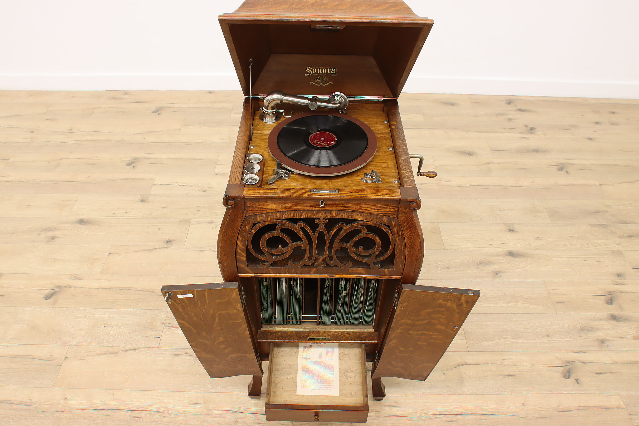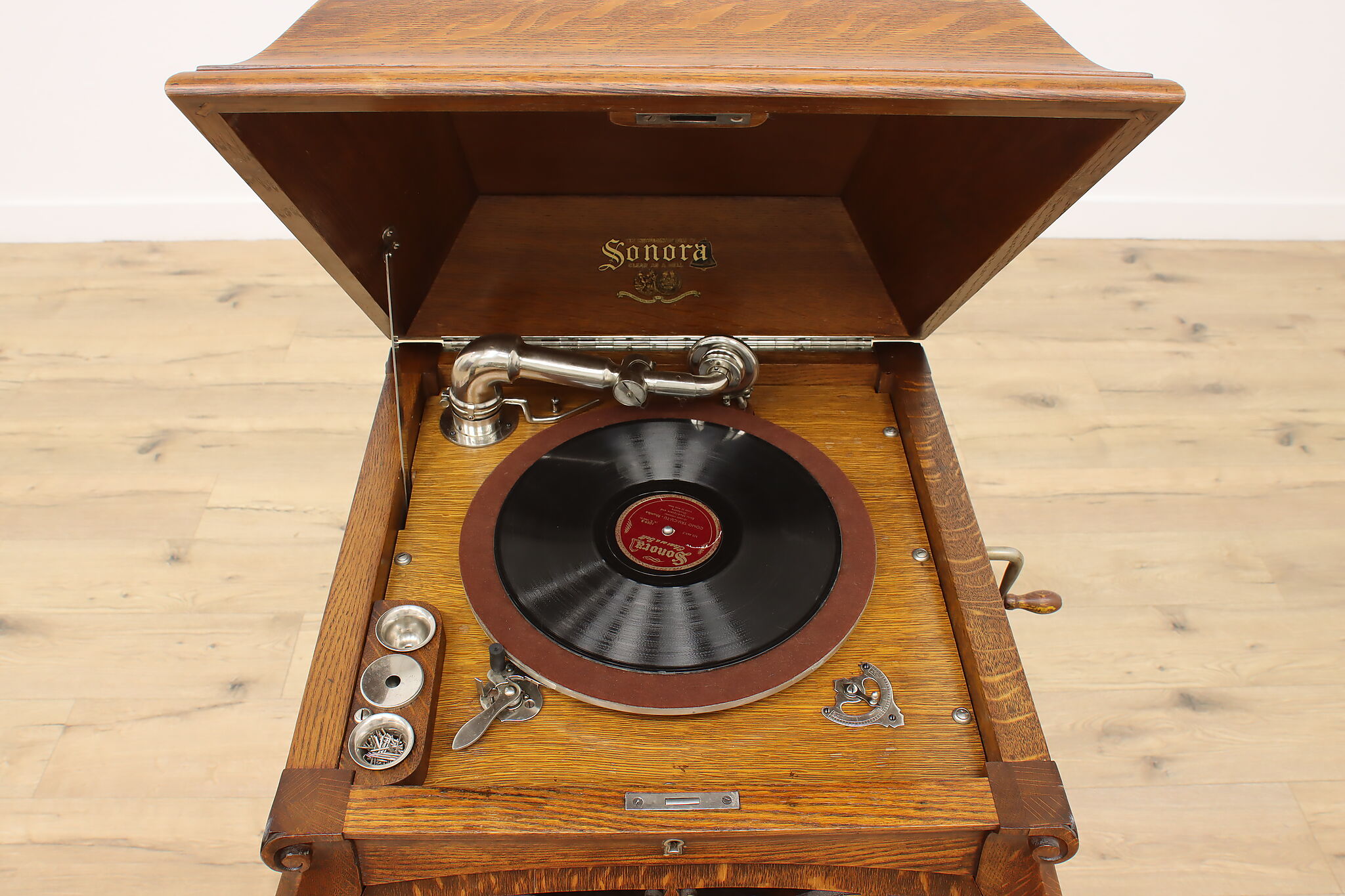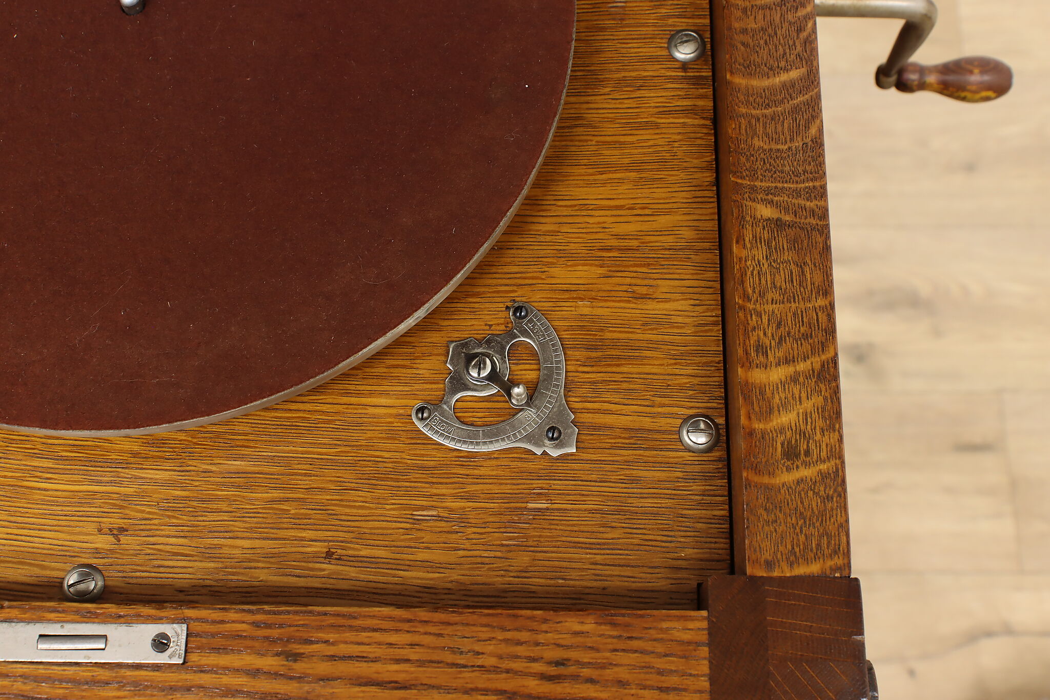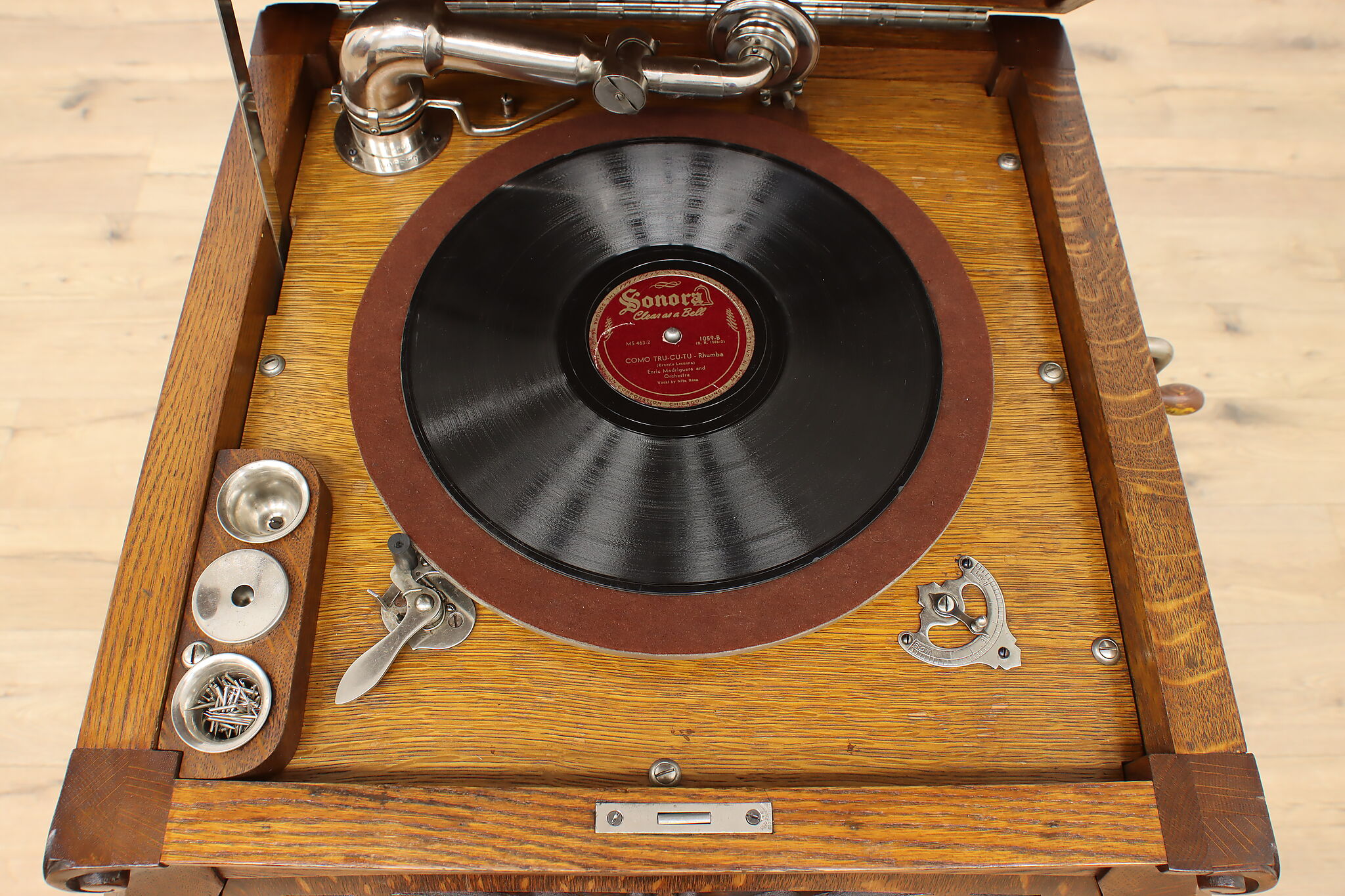 Often called a "talking machine", this record player or phonograph was a popular choice for in-home music that only required winding to play.