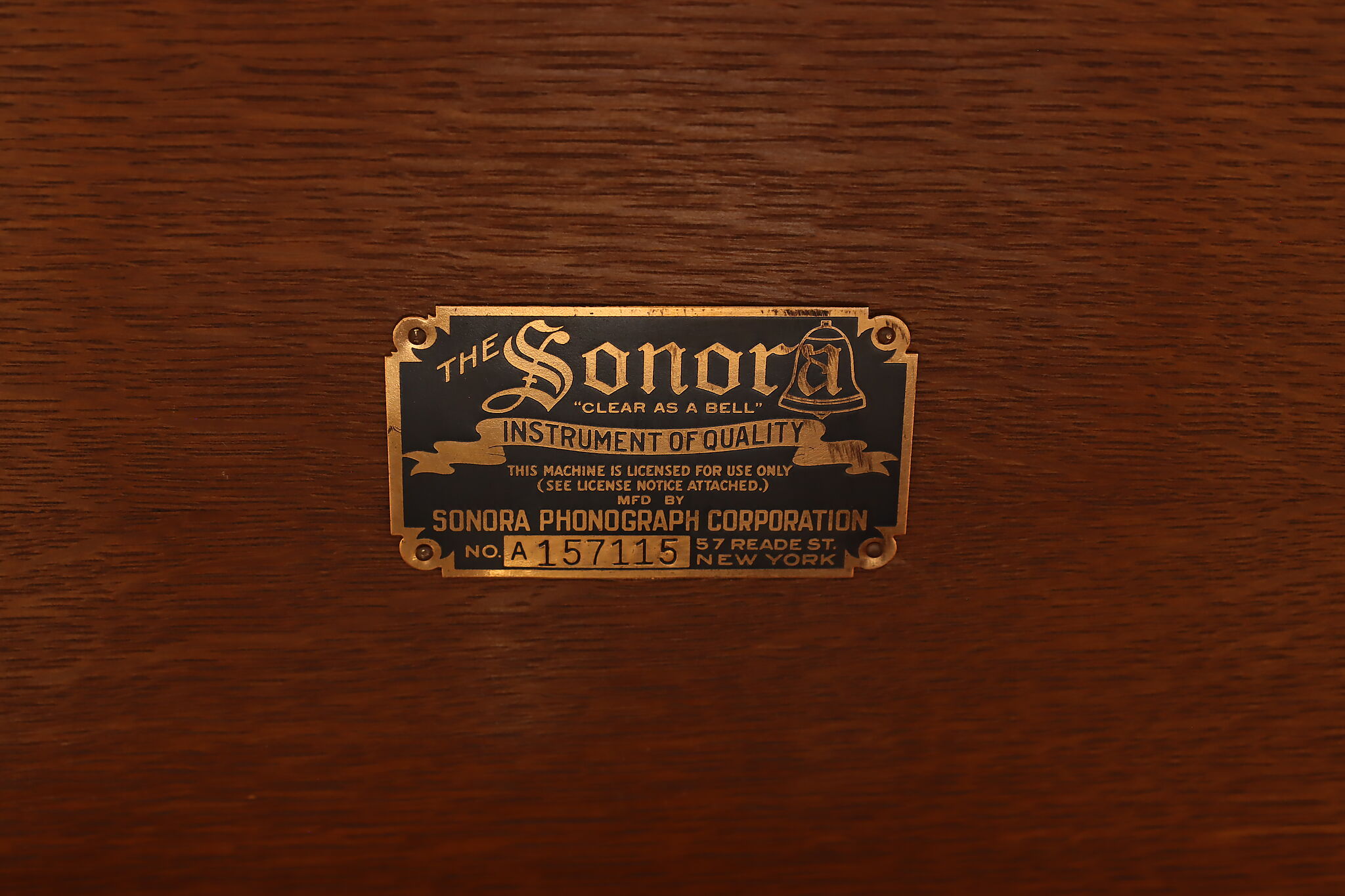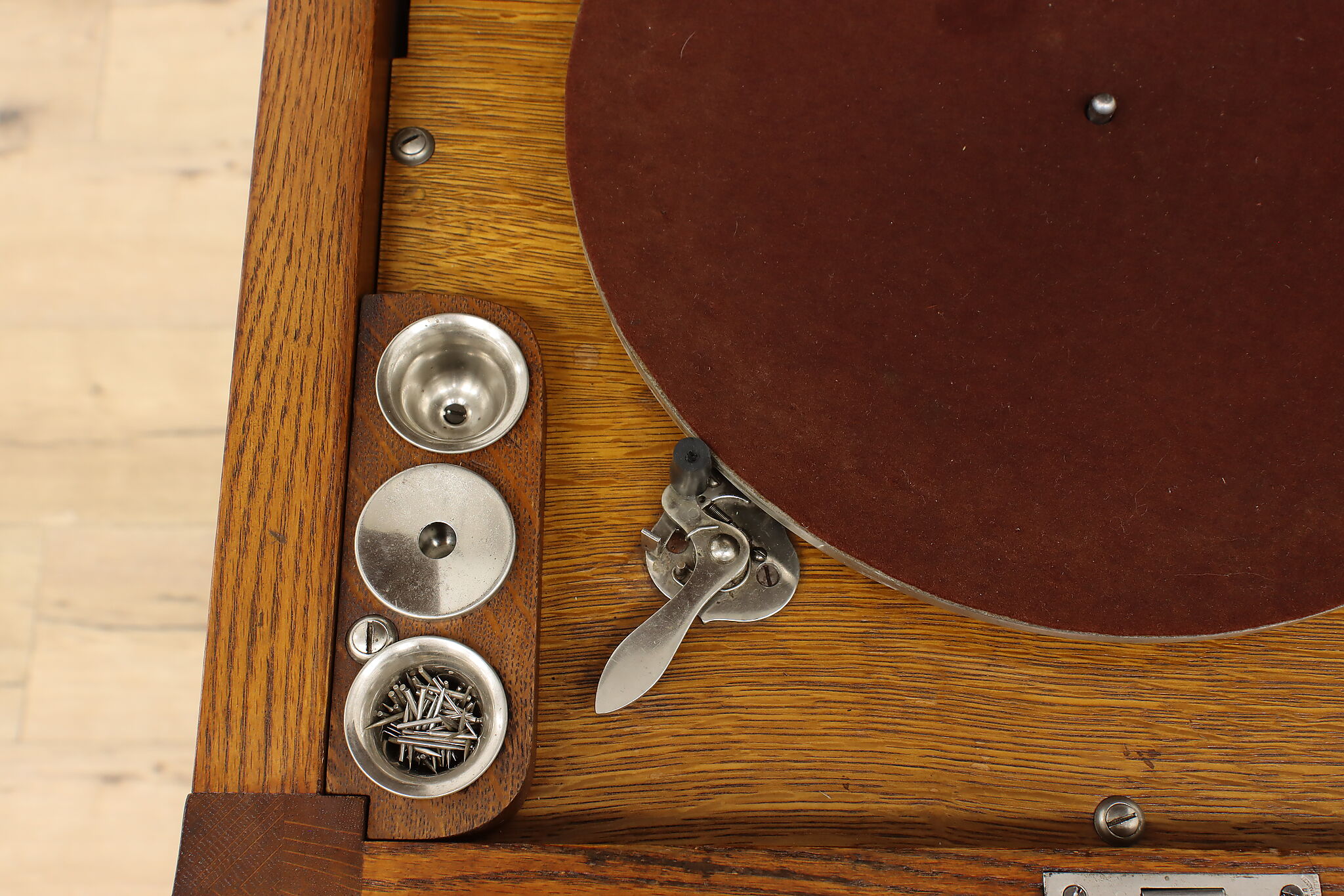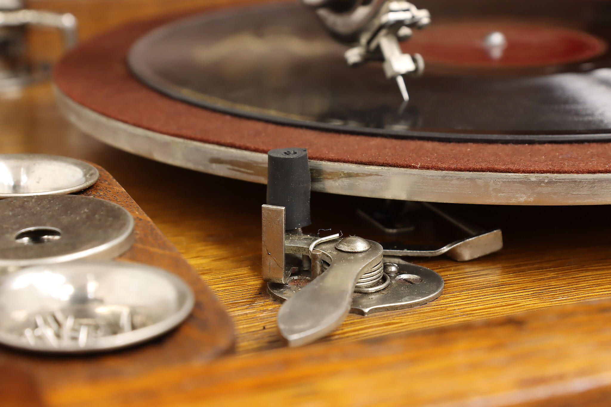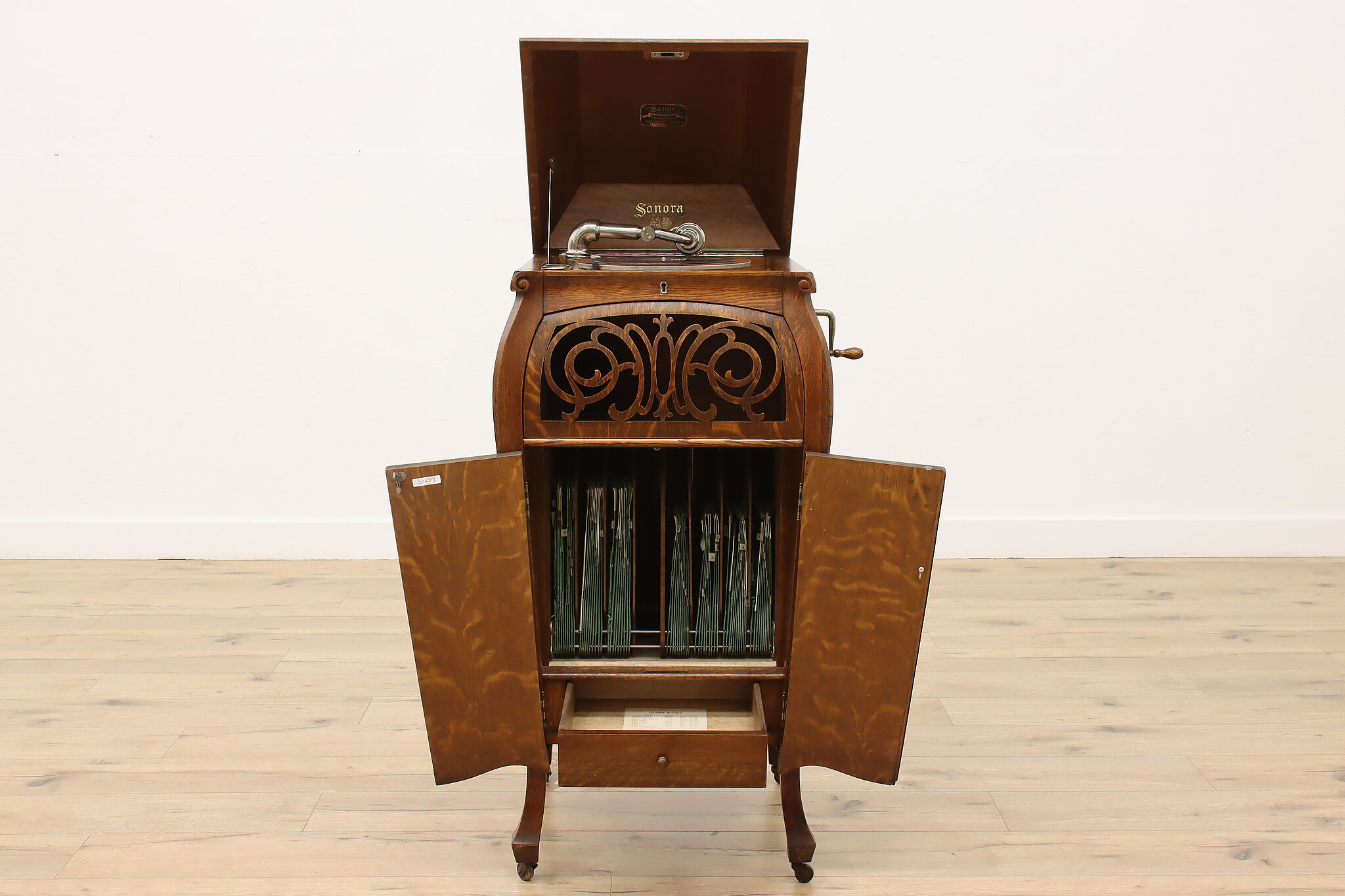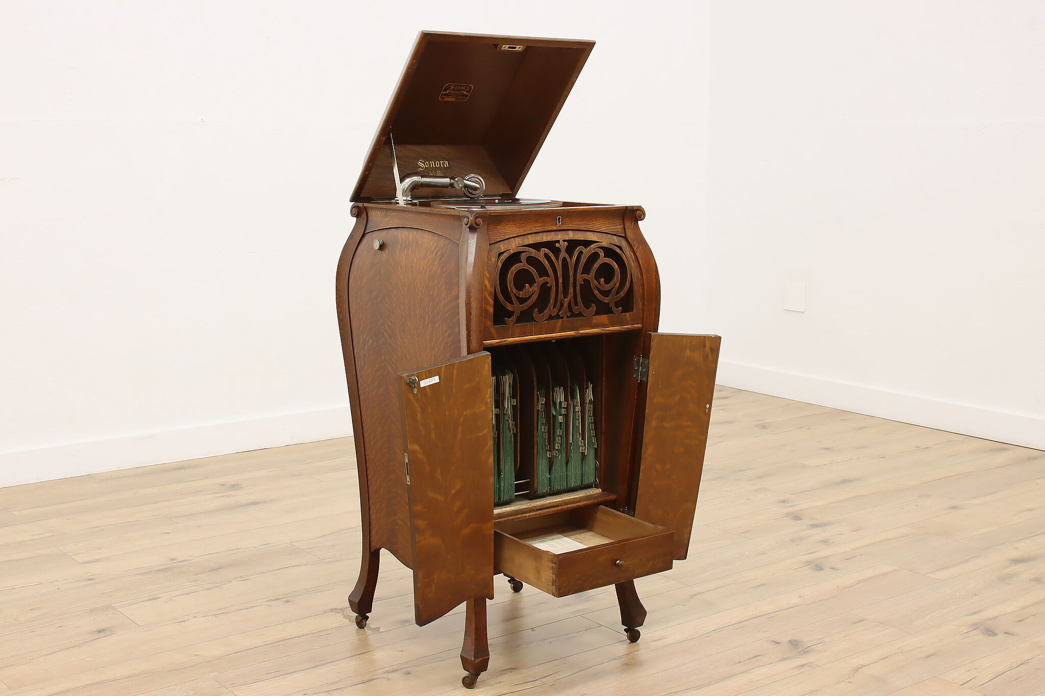Often called a "talking machine", this record player or phonograph was a popular choice for in-home music that only required winding to play.