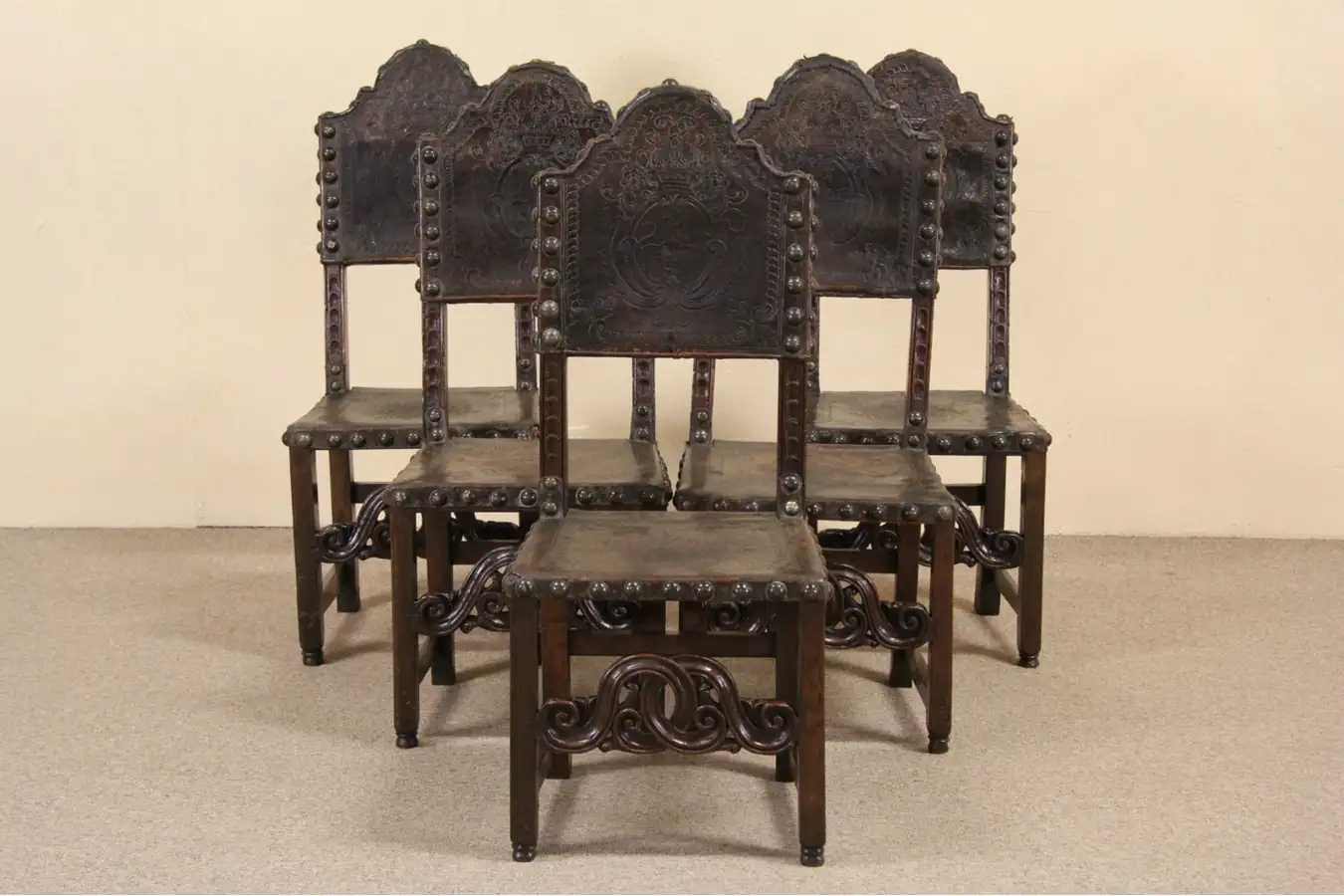 A set of five Spanish carved walnut dining chairs with tooled leather upholstery date from the early 1700's.