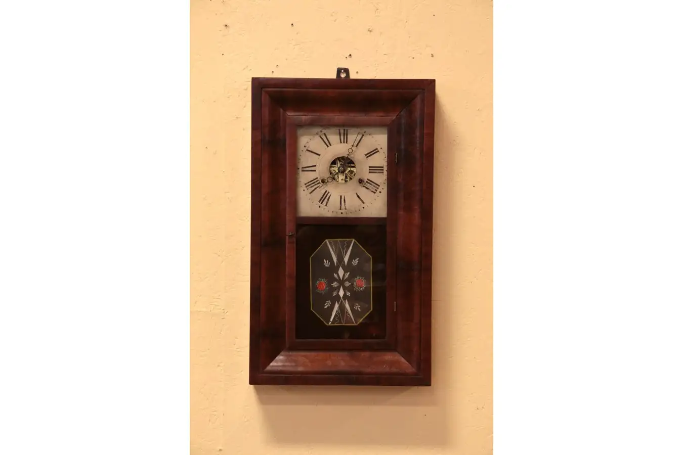 The original 30 hour brass movement strikes the hour, and is driven by weights that hang on pulleys right and left of the movement. The worn original paper label is visible in the case, and wavy glass in the doors is also original, the reverse painting in the lower glass is remarkably well preserved.
