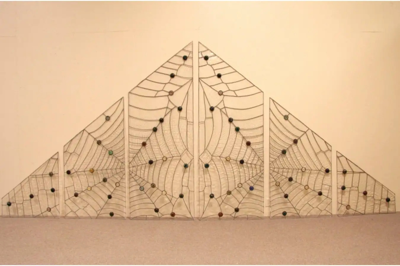 Commissioned in the 1970's for a northern Wisconsin lake lodge, this wall of hand leaded stained glass windows was built in. The spider web design includes transparent crackled clear "ice" pattern glass, with multi colored rough cut jewels.