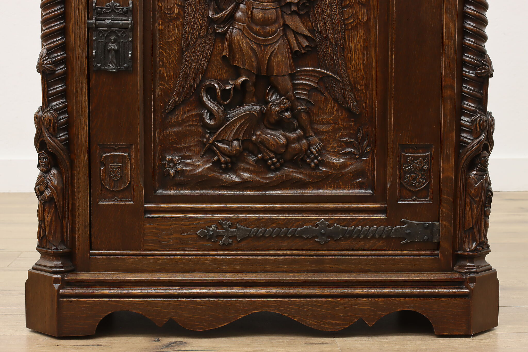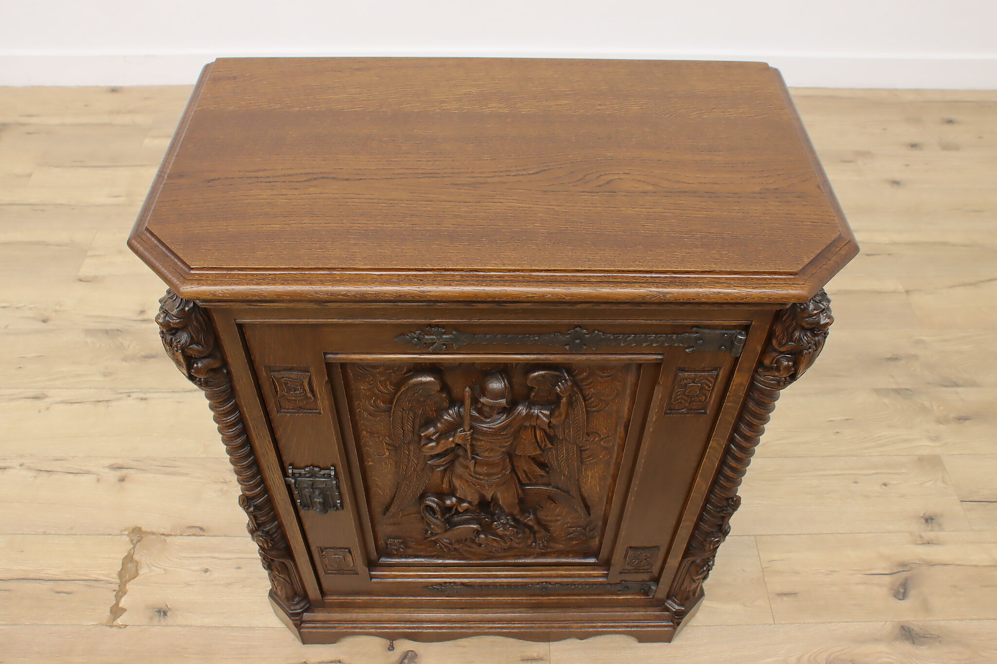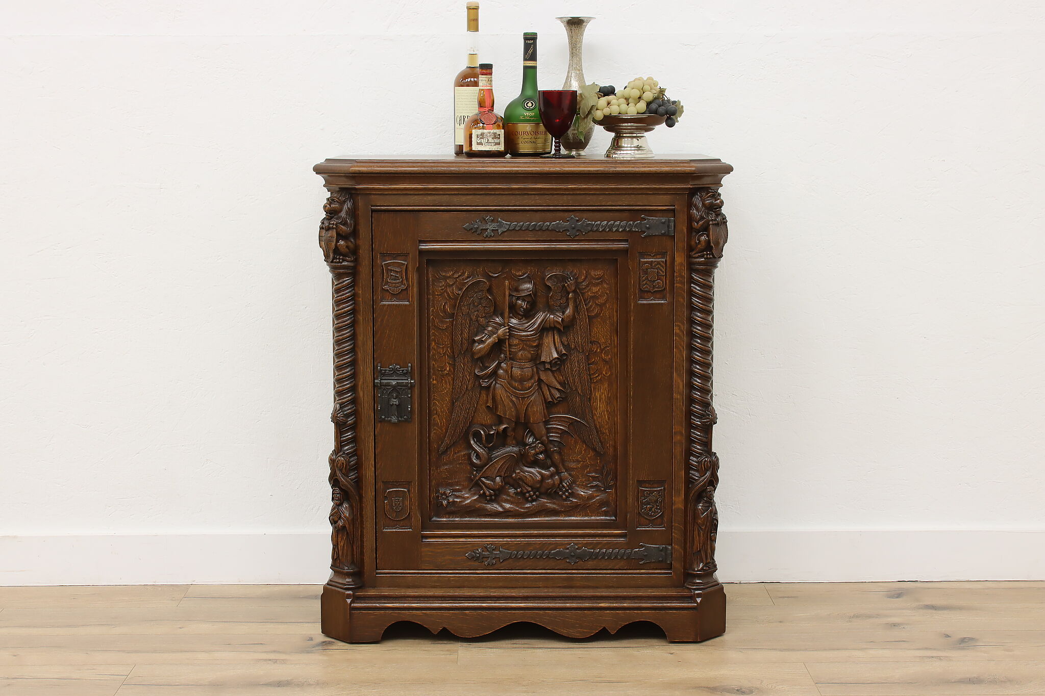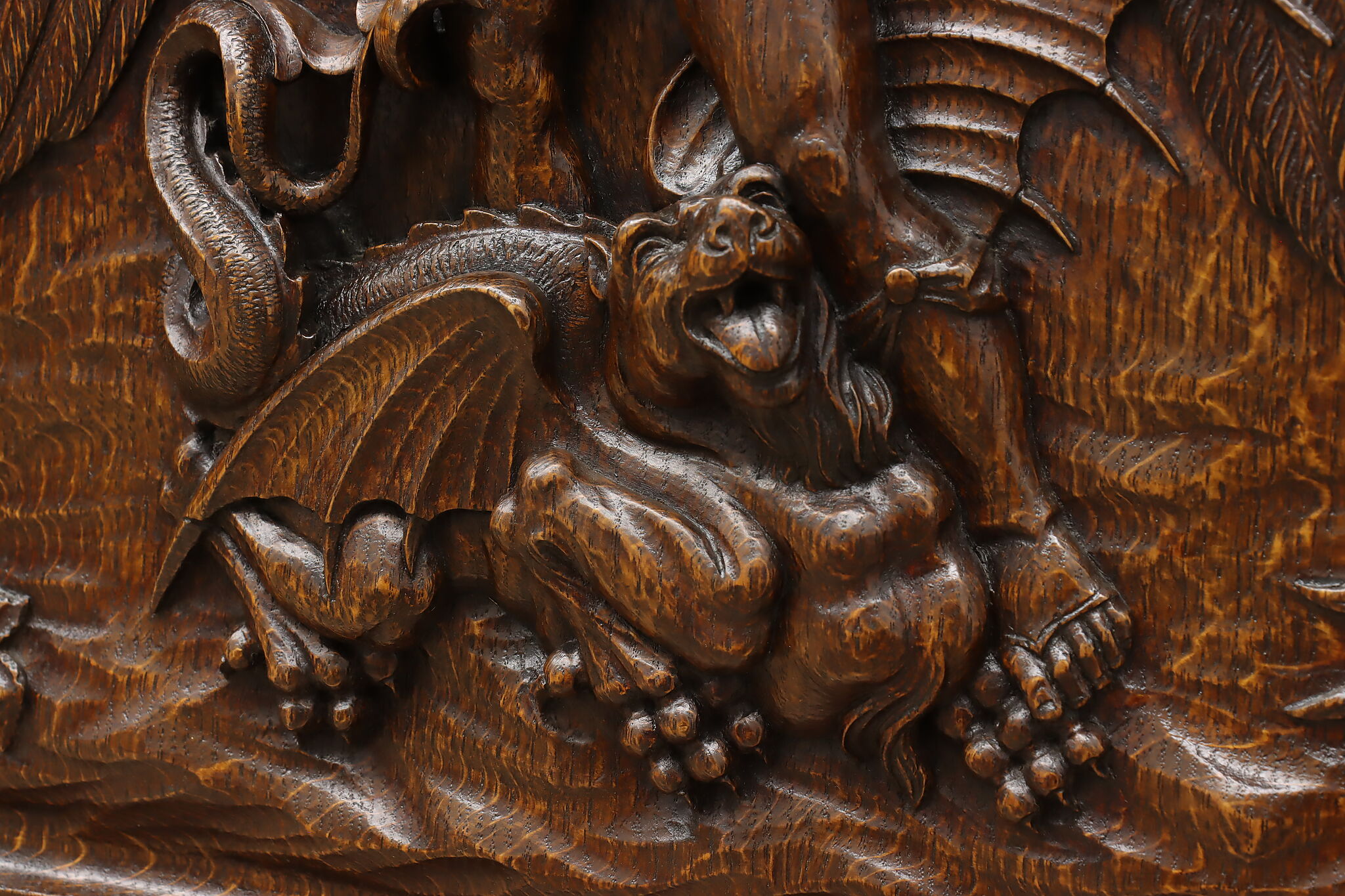 The famous story of St. George slaying the dragon is carved in beautiful high relief on this bar or hall cabinet!