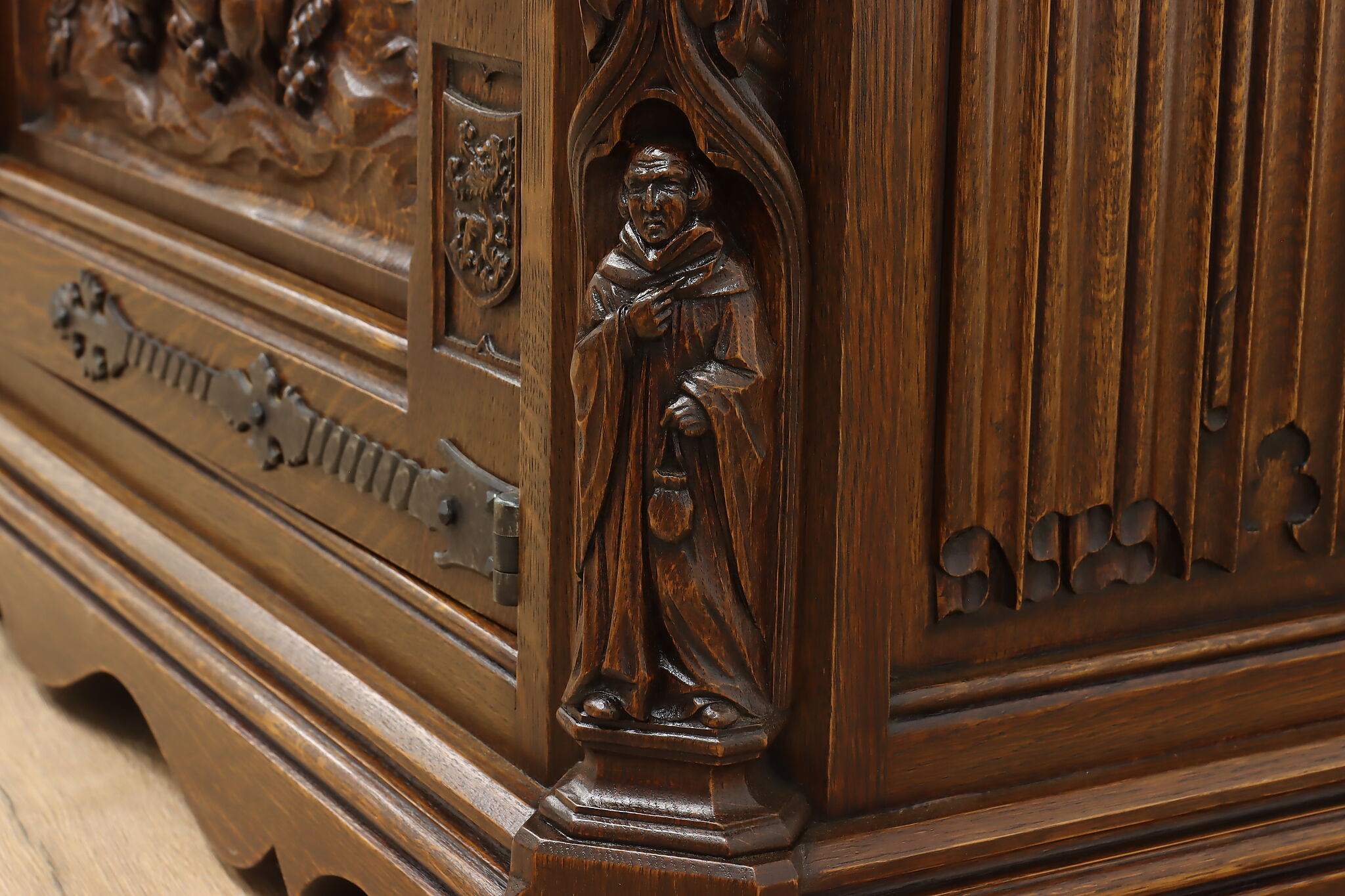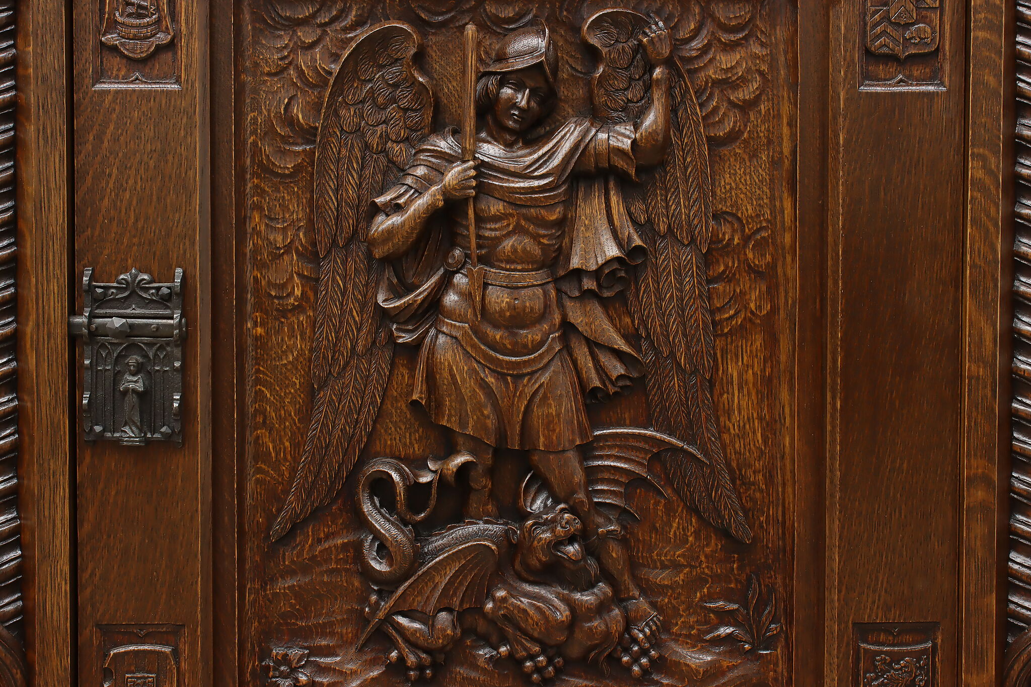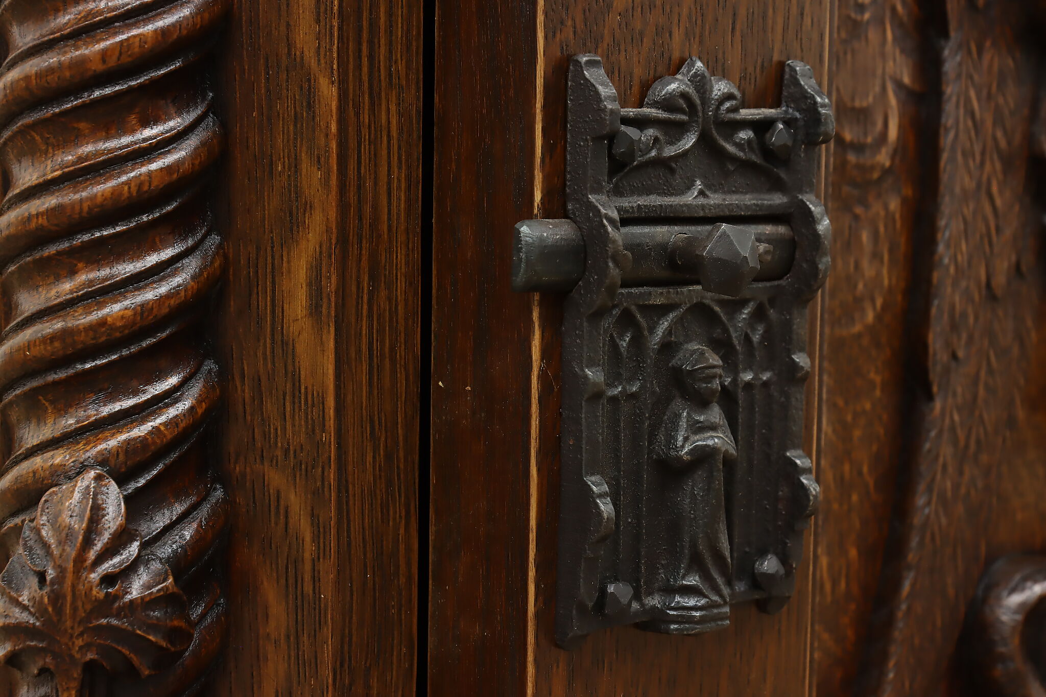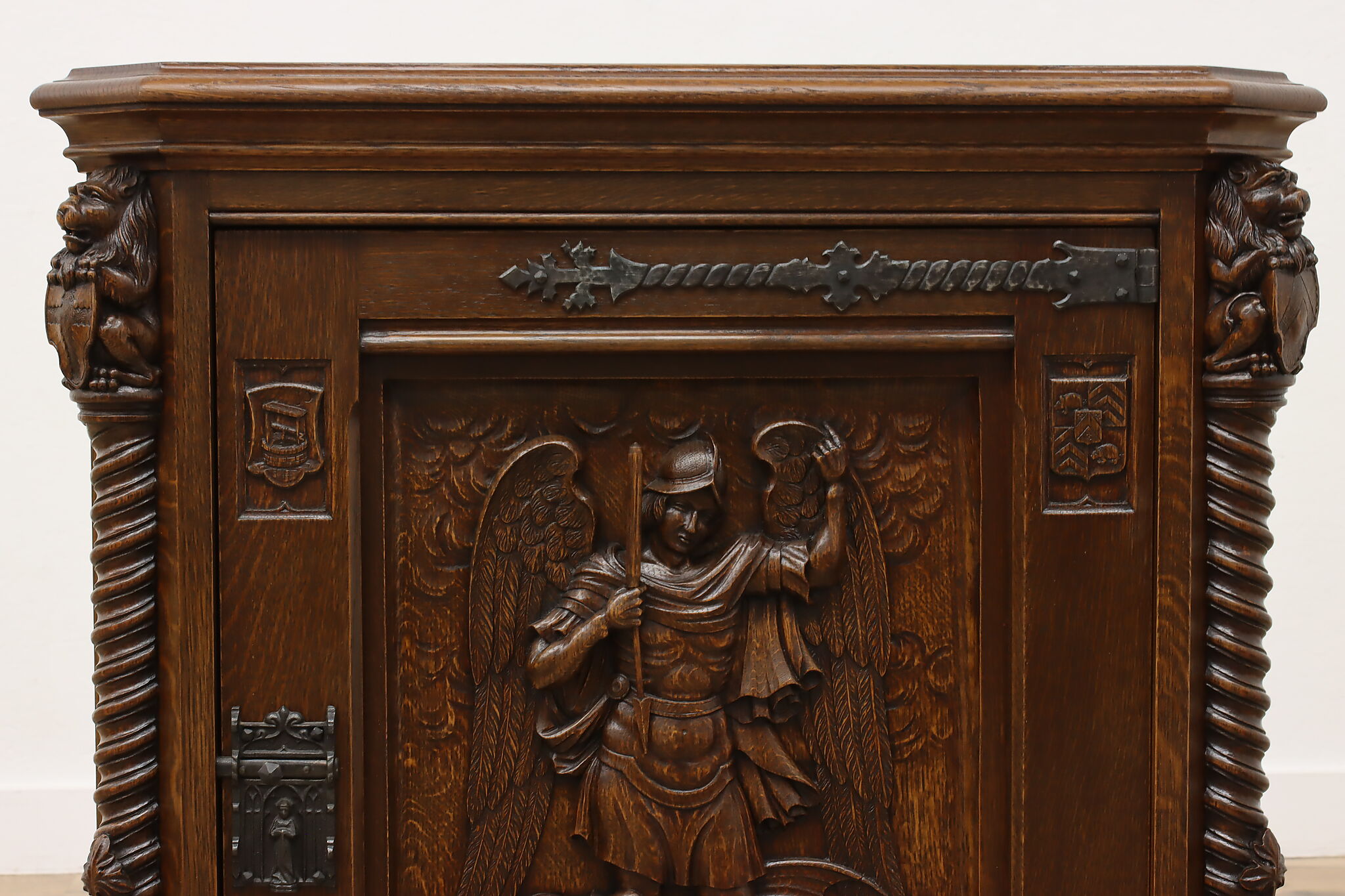 The famous story of St. George slaying the dragon is carved in beautiful high relief on this bar or hall cabinet!