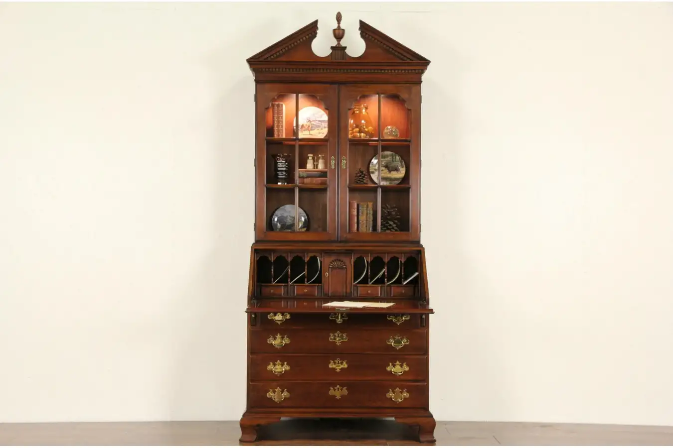 The drop front rests on pull out supports, inside are cubicles and drawers for documents. Lower dovetailed drawers have original heavy brass pulls and solid cherry sides. Upper glass shelves are grooved to display plates if desired. Locks and keys work on this superior quality desk. The bookcase is removable for easier moving.