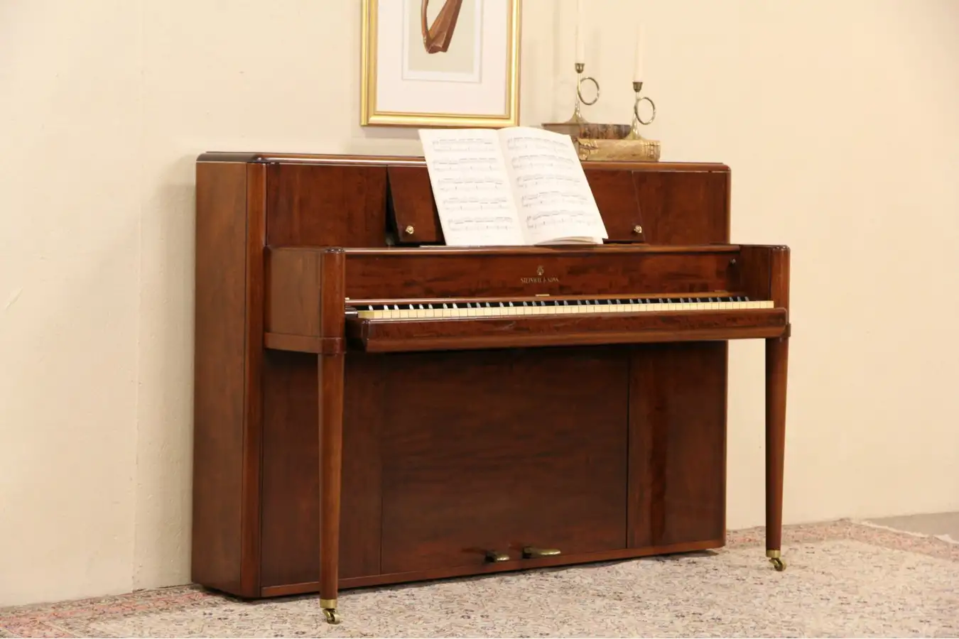 A signed "Steinway and Sons, New York" Midcentury Modern console size upright piano was made in 1942. The original glossy finish on figured mahogany is in very fine condition with only minor mars at the edges, see photos.