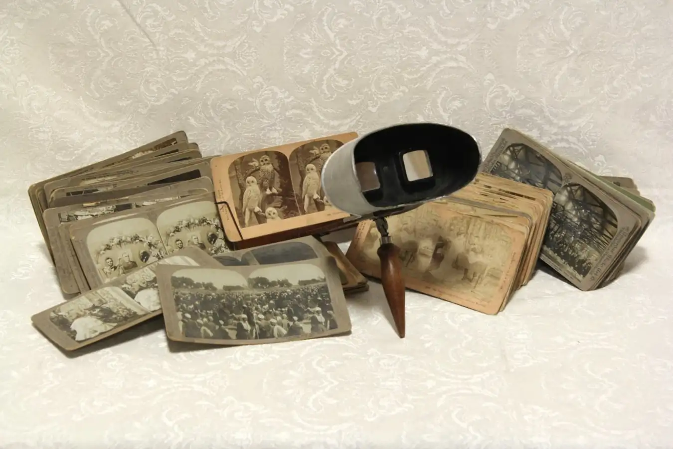 Over 100 antique stereo photo cards have fascinating subjects, humorous husband with the French cook, Spanish American and Philippine wars, travel sights in America and around the world. Many of the cards are worn, dirty or faded, see photos.