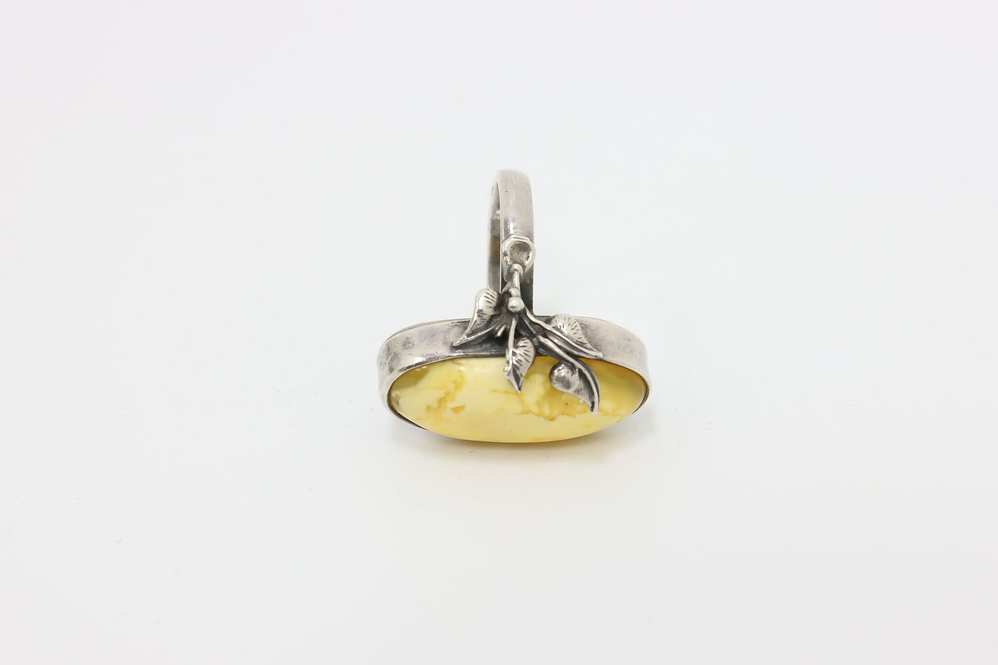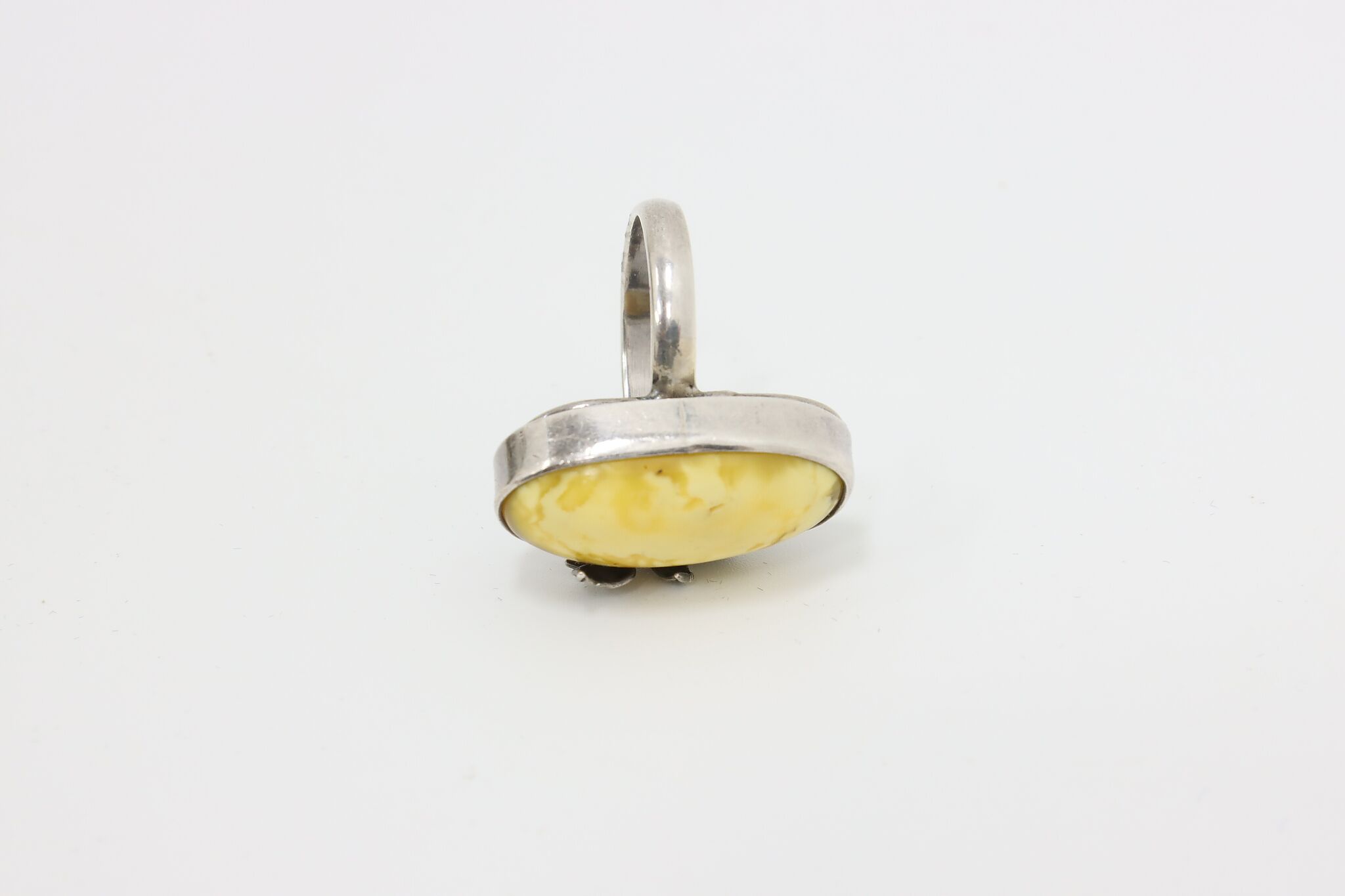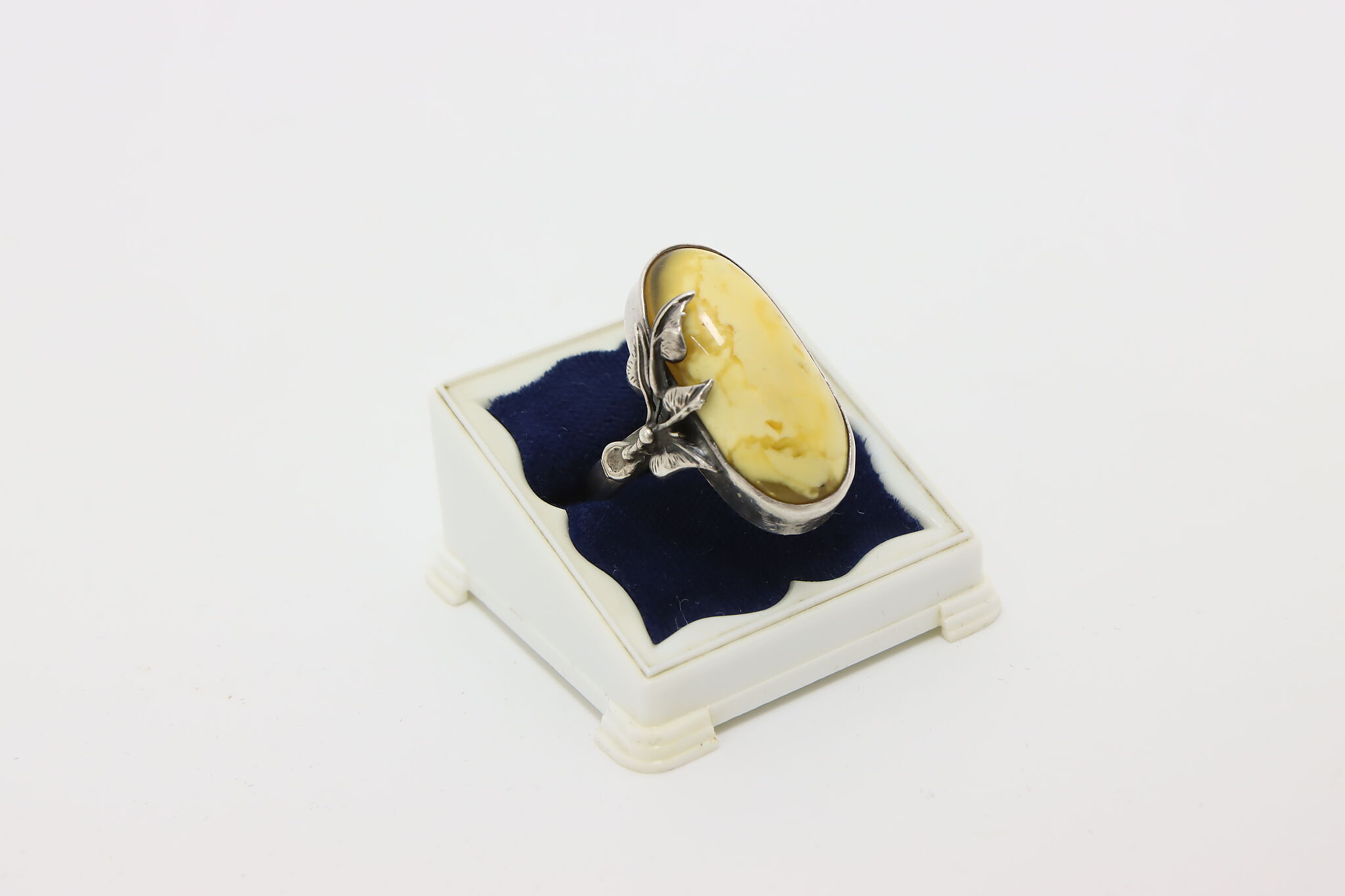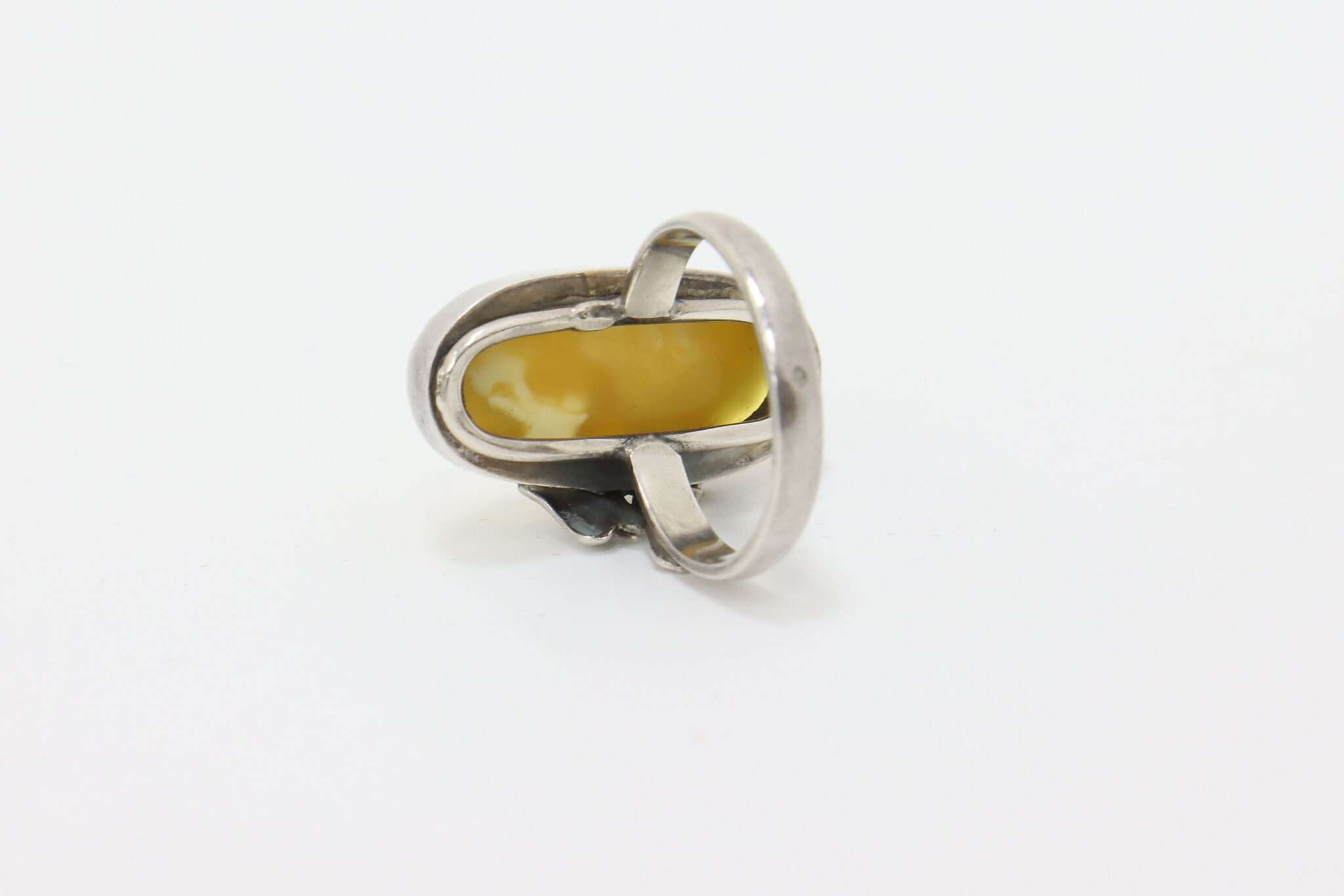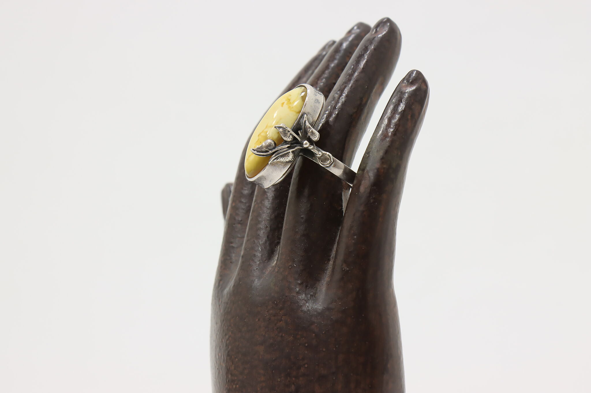 A striking sterling silver ring featuring a marbled honey-yellow amber cabochon set in an ornate floral mounting. The elongated stone and flowing leaf accents create a bold, vintage-inspired design with natural warmth and character.
