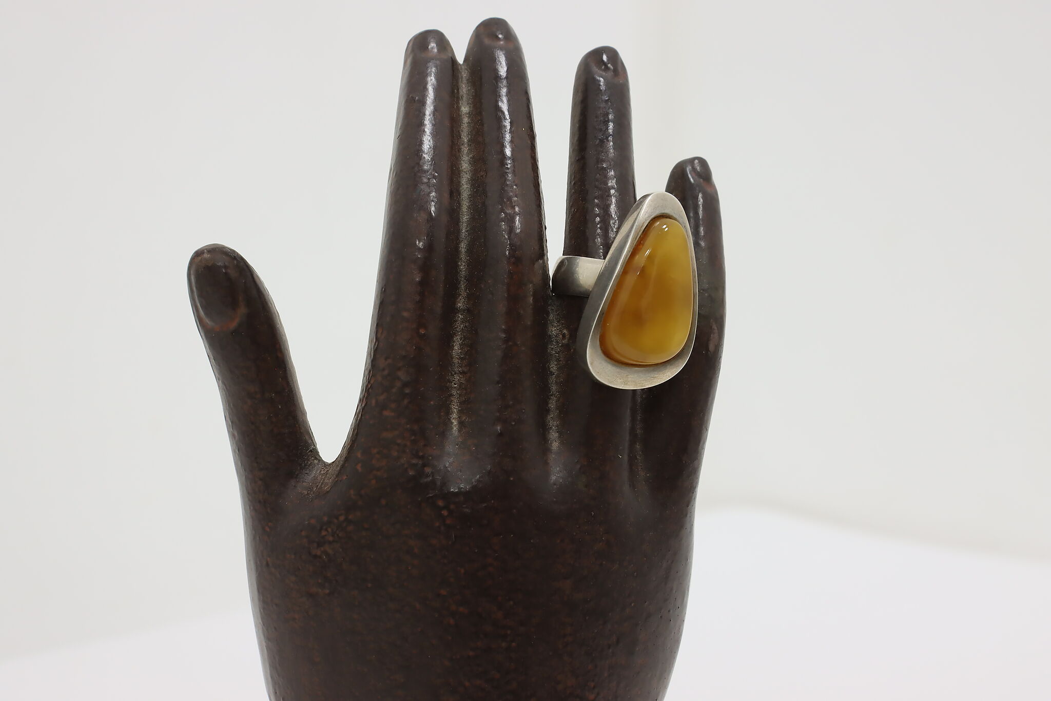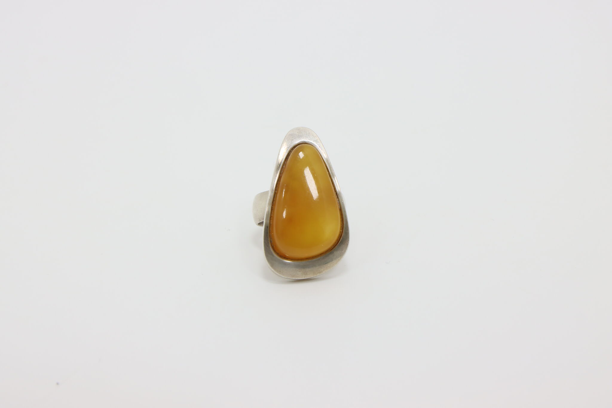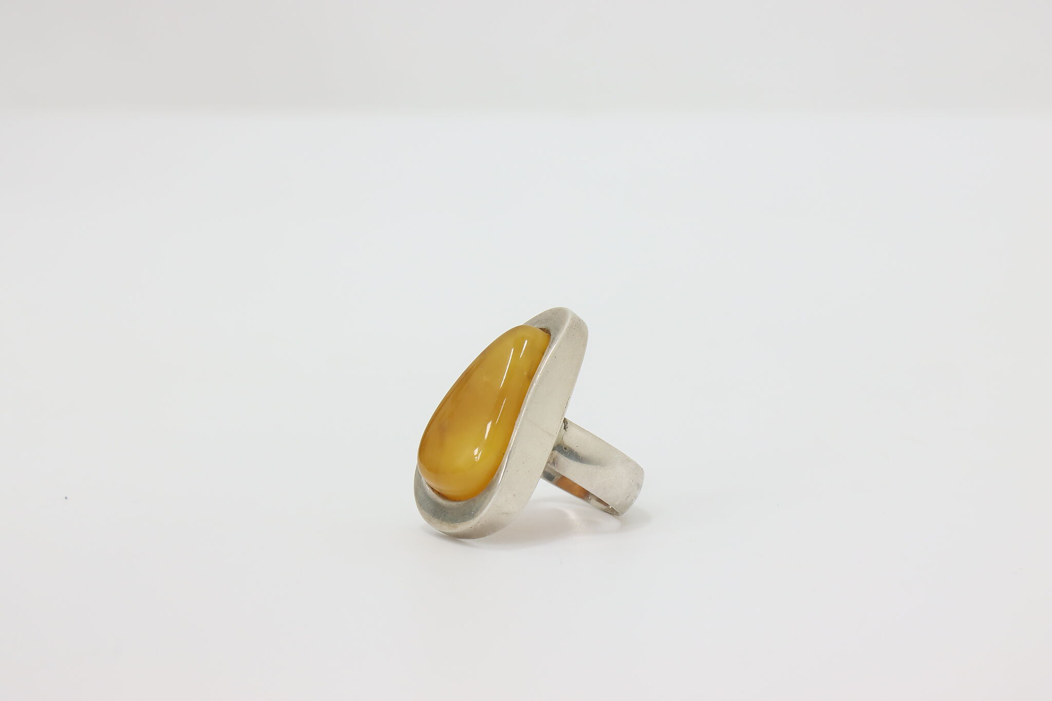 A unique sterling silver ring featuring a smooth, teardrop-shaped amber cabochon in warm honey tones, set in a modern bezel with clean, sculptural lines.