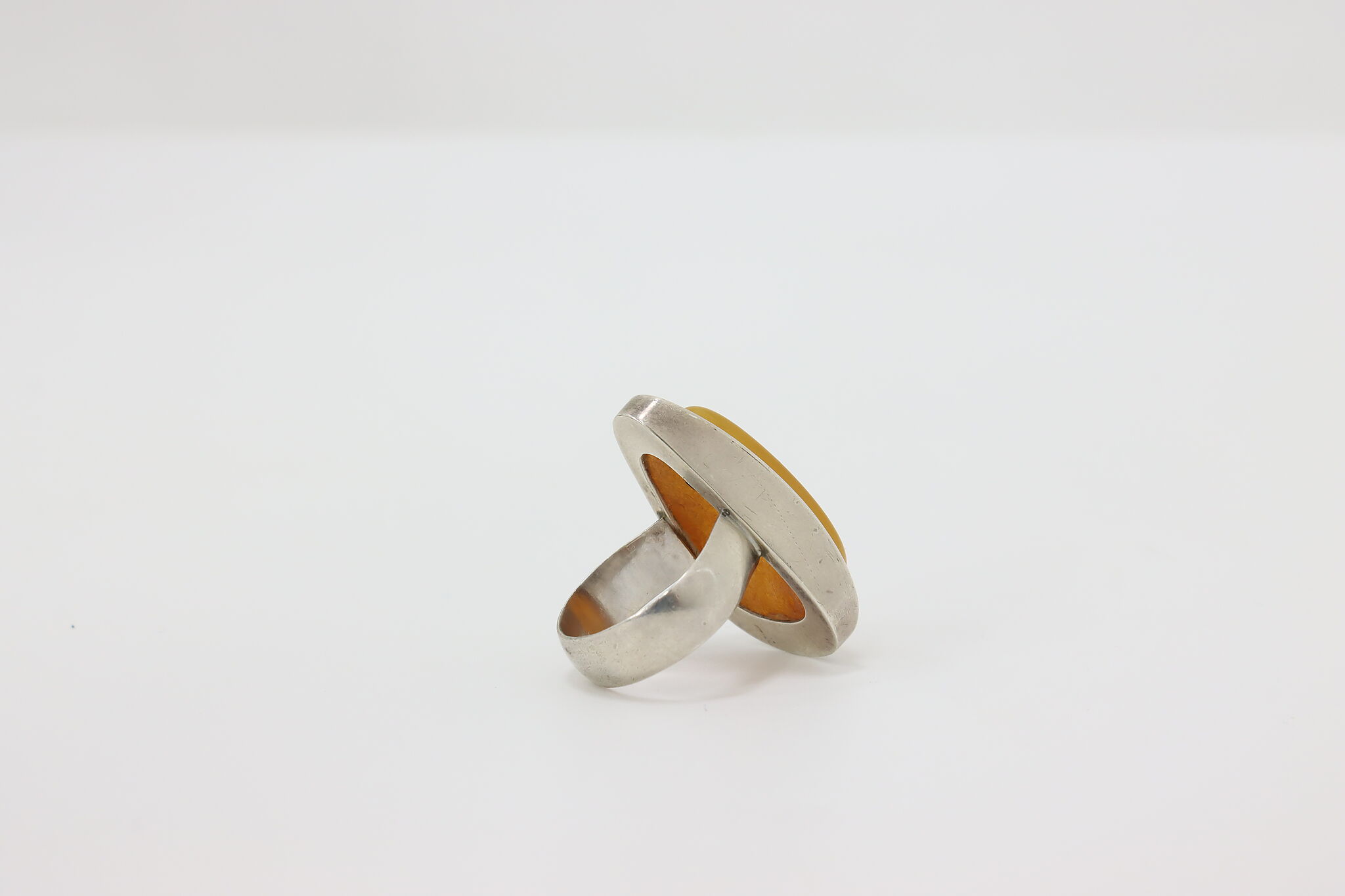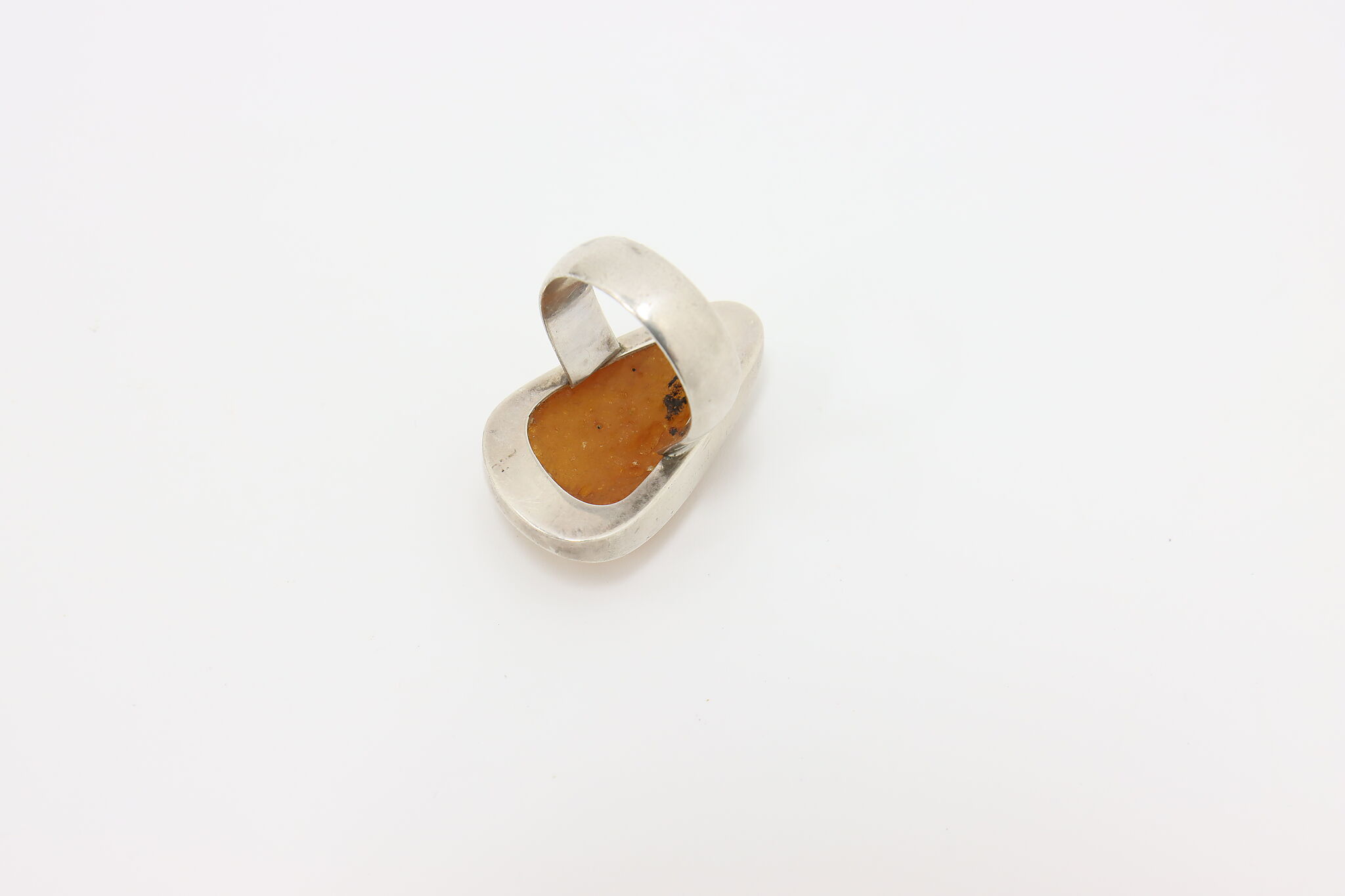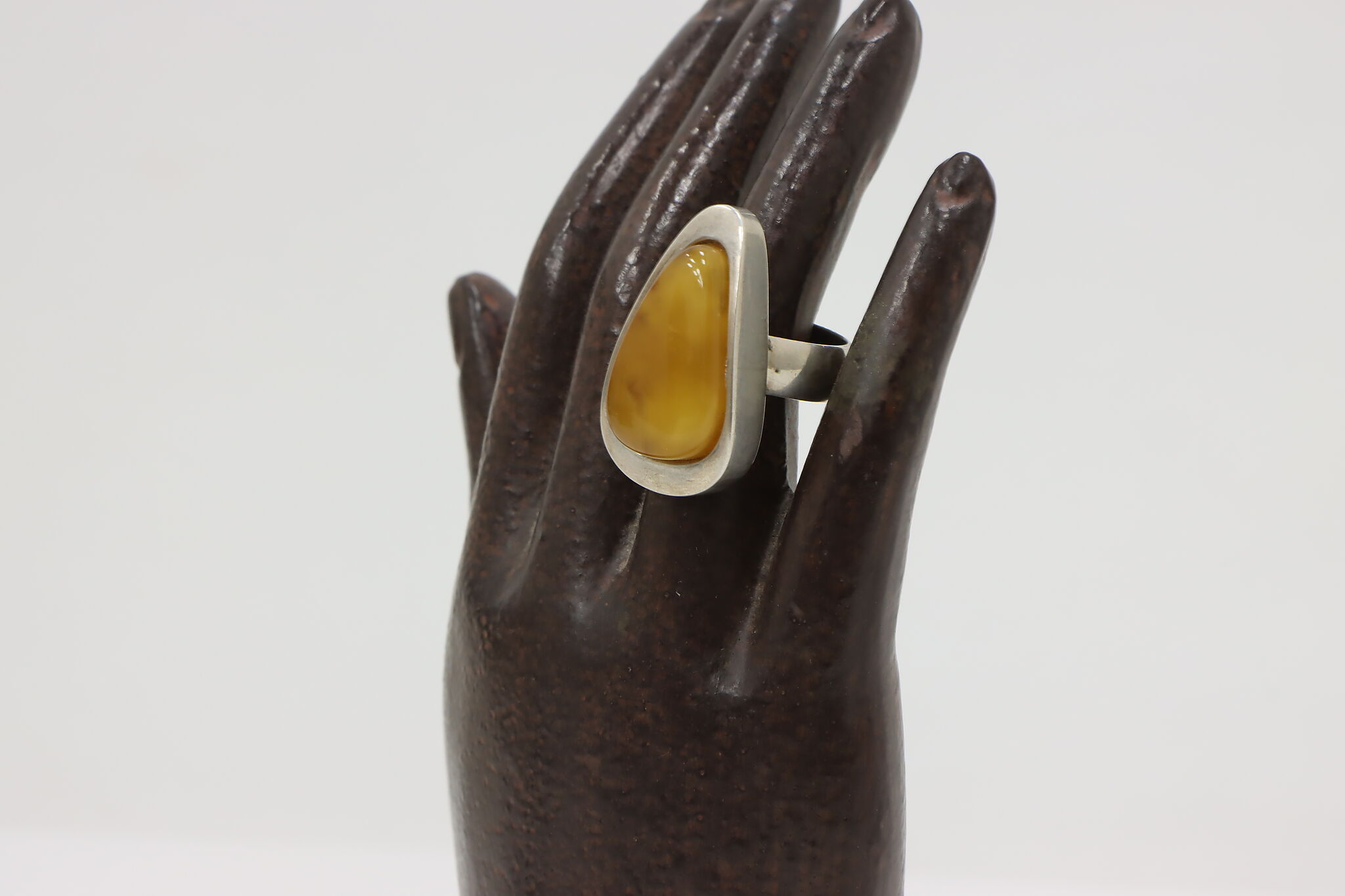 A unique sterling silver ring featuring a smooth, teardrop-shaped amber cabochon in warm honey tones, set in a modern bezel with clean, sculptural lines.