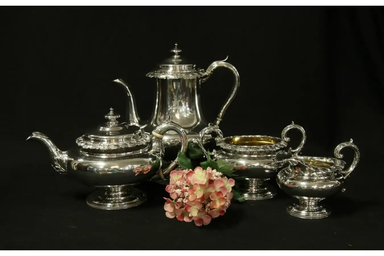 This antique set weighs approx. 78 troy ounces. Height measurements of this elegant service are as follows: coffee pot 10 3/4," tea pot 6 1/4," sugar bowl 5 1/4" and creamer 4 3/4."