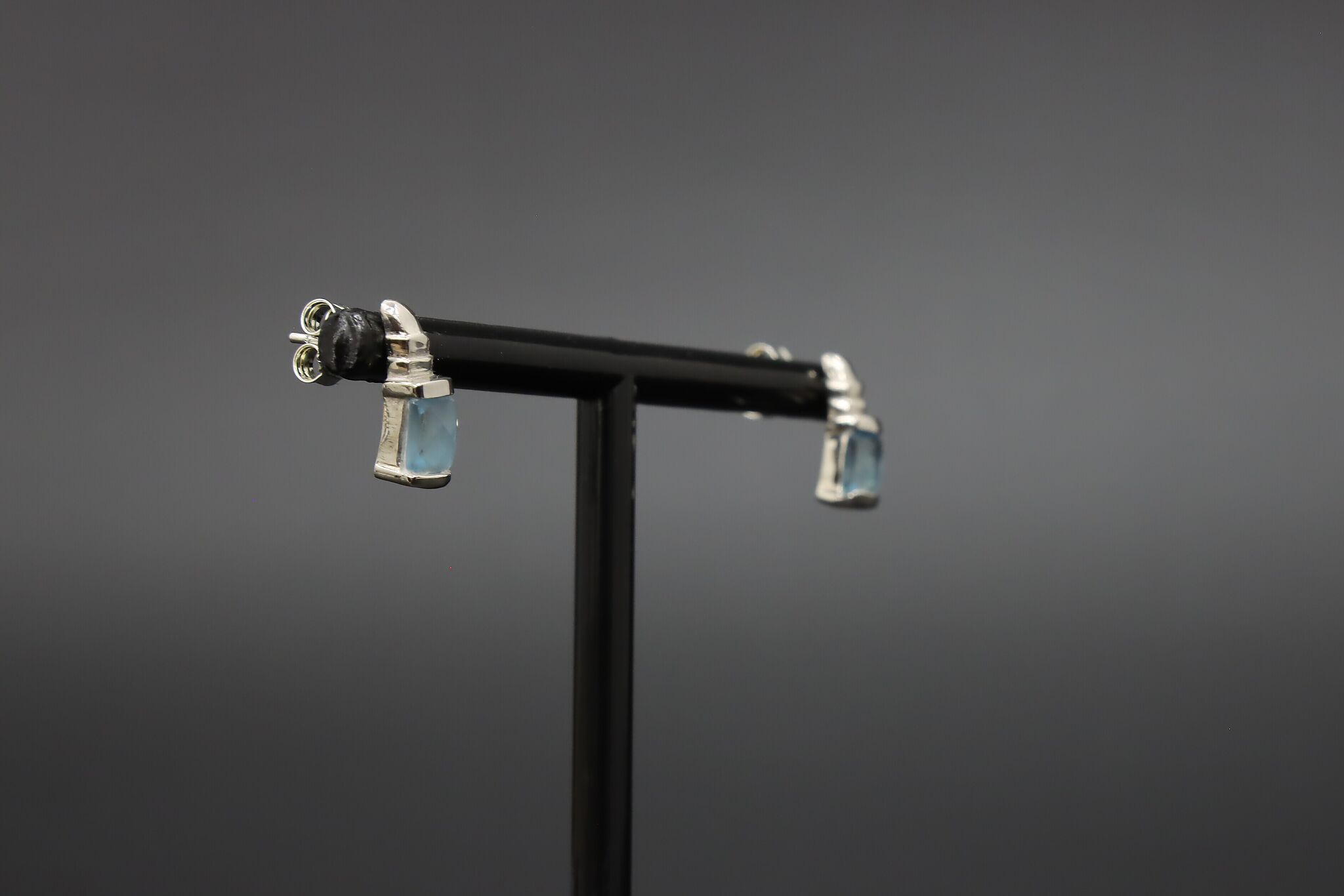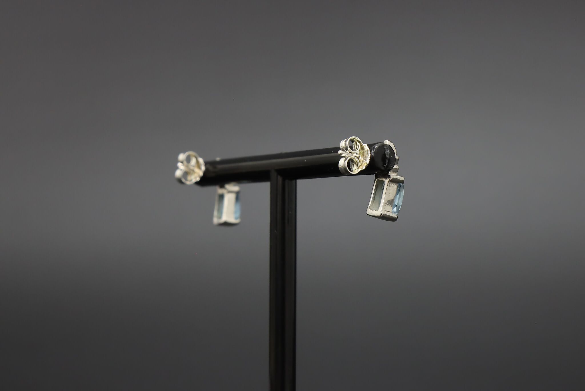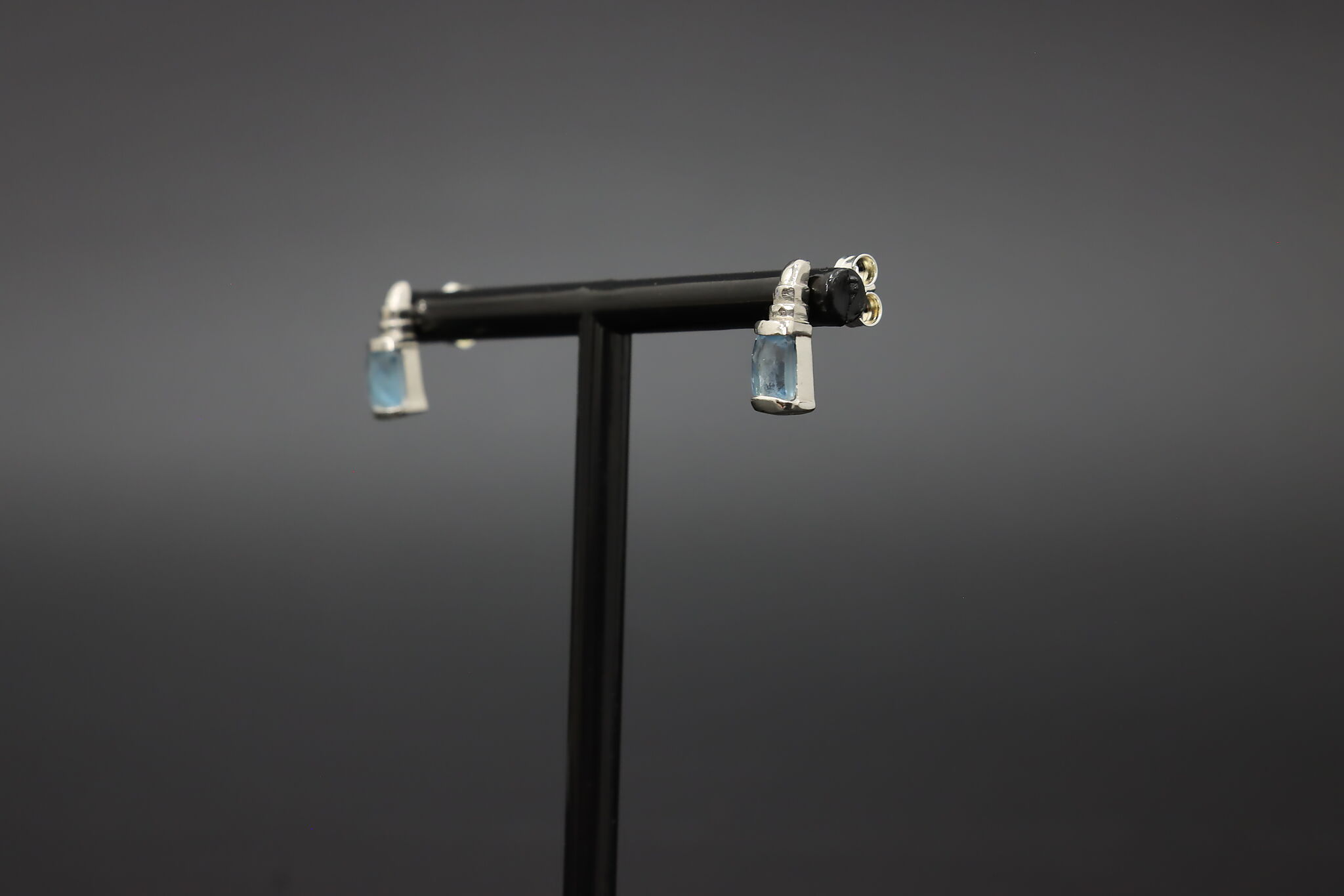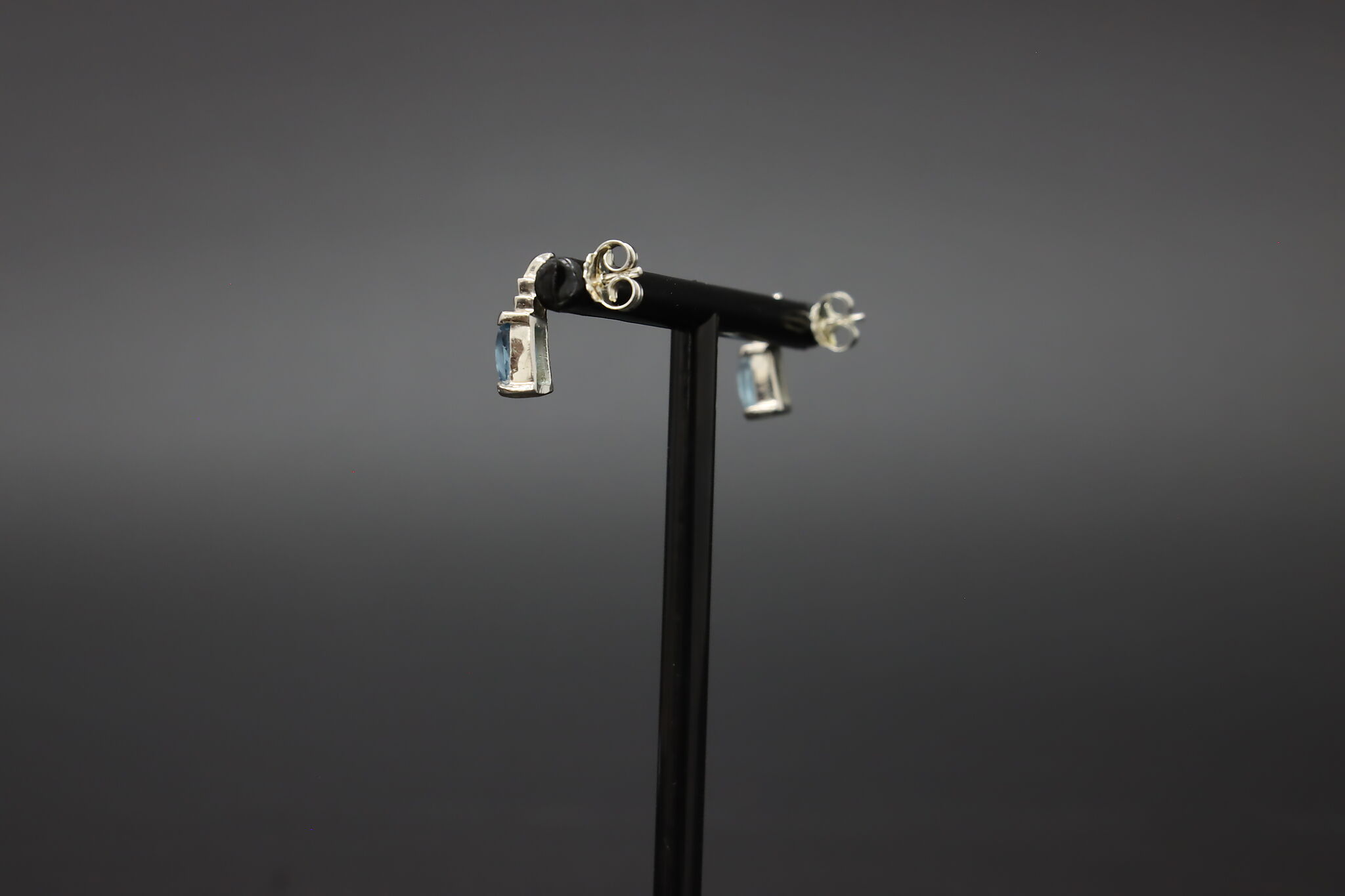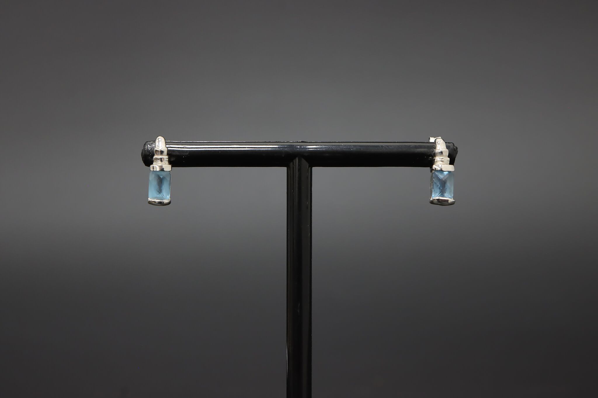 Elegant sterling silver stud earrings featuring rectangular blue CZ stones accented with sparkling cubic zirconia for a refined, eye-catching look.