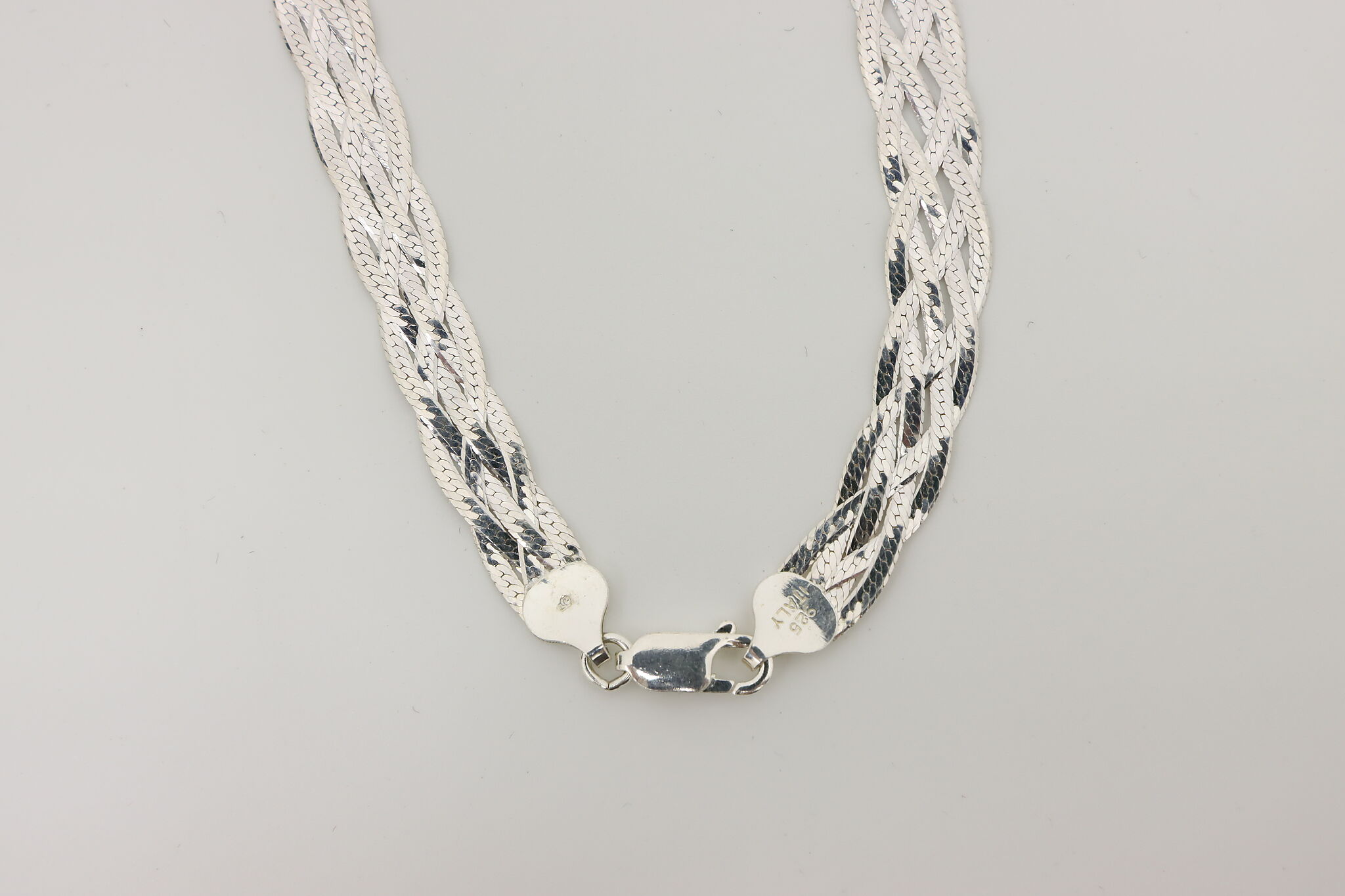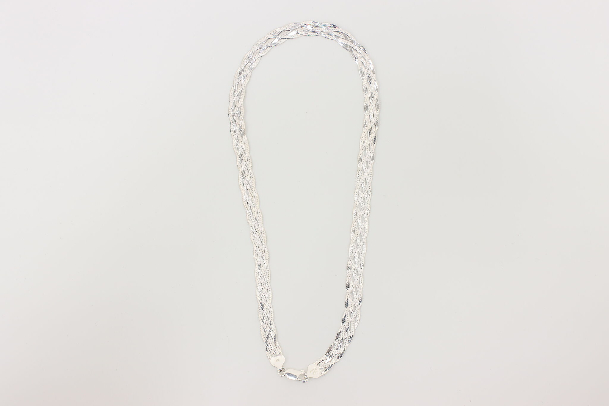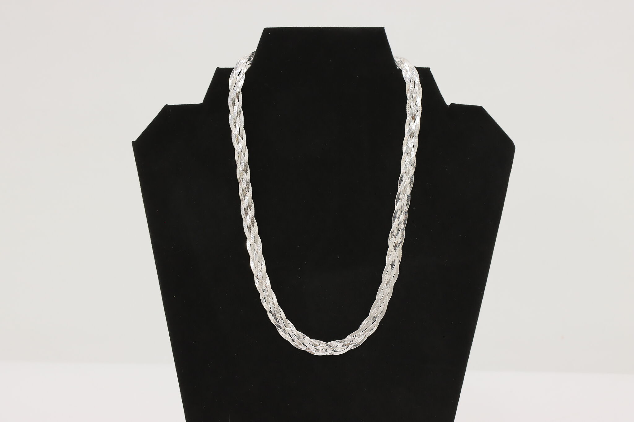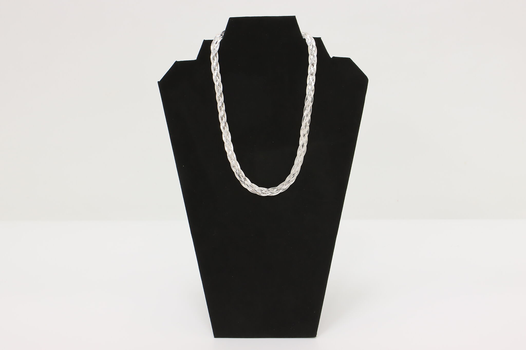 A bold sterling silver braided mesh necklace featuring intertwined textured strands for a bright, eye-catching finish.