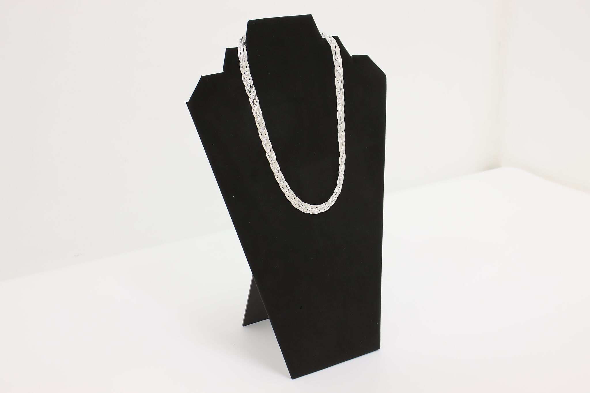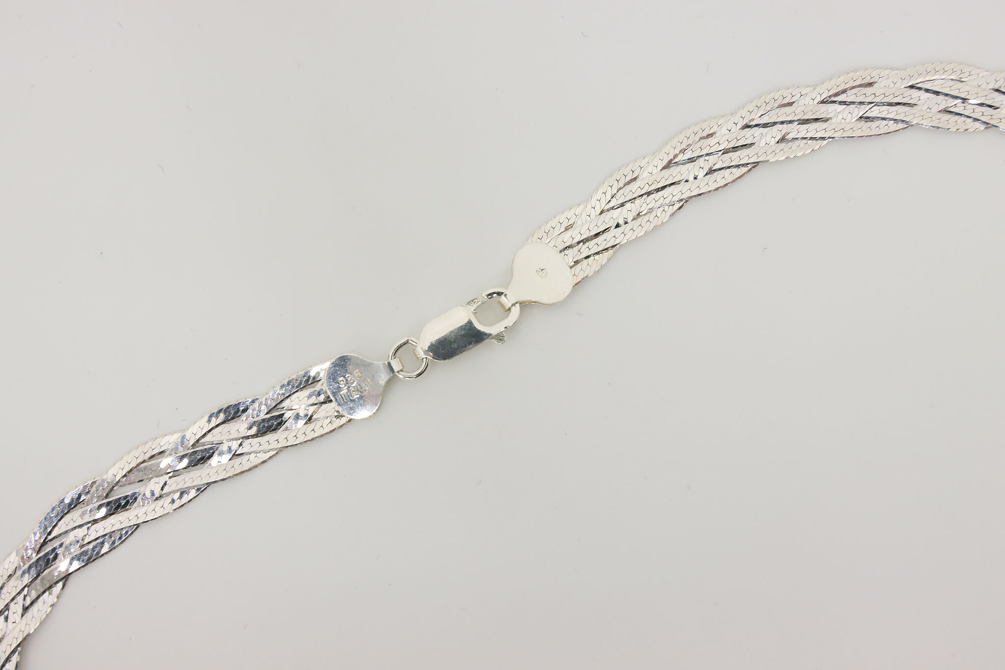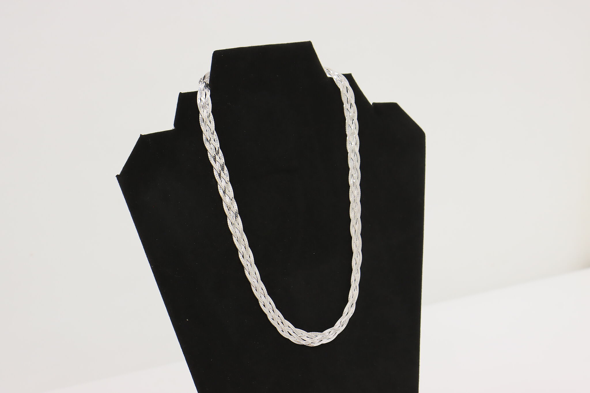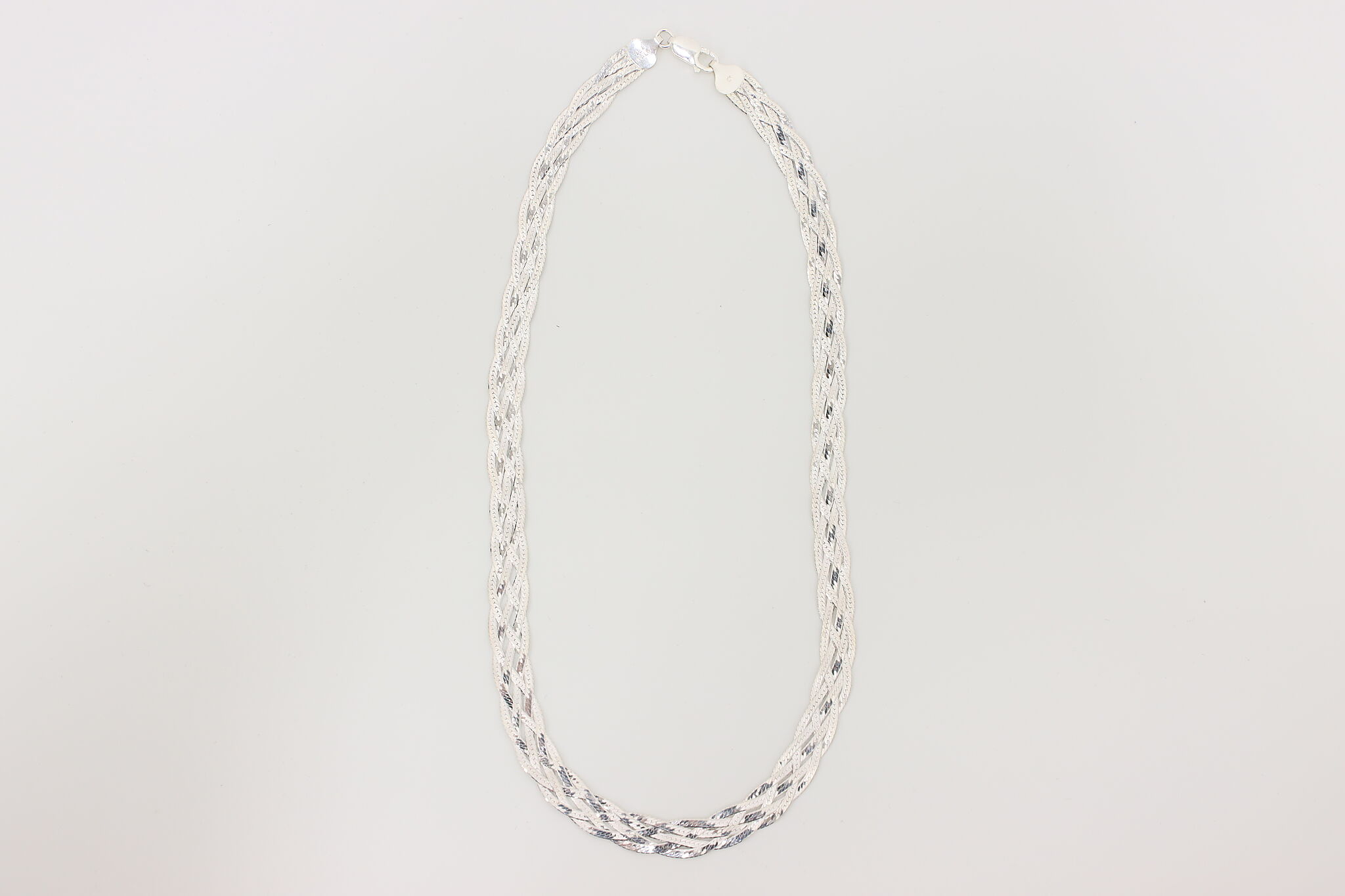 A bold sterling silver braided mesh necklace featuring intertwined textured strands for a bright, eye-catching finish.