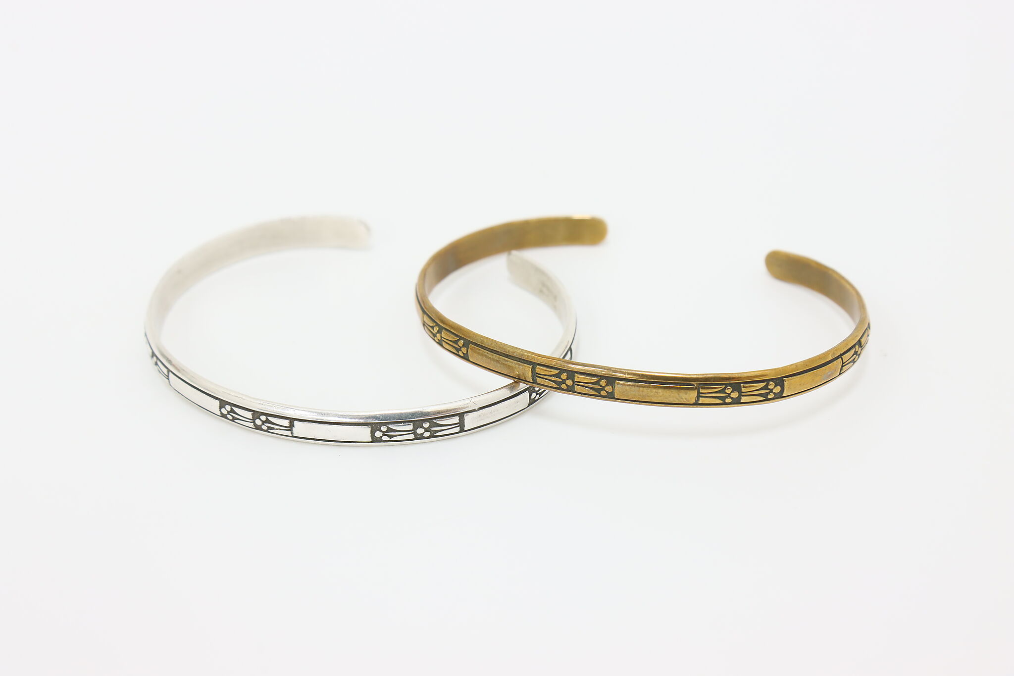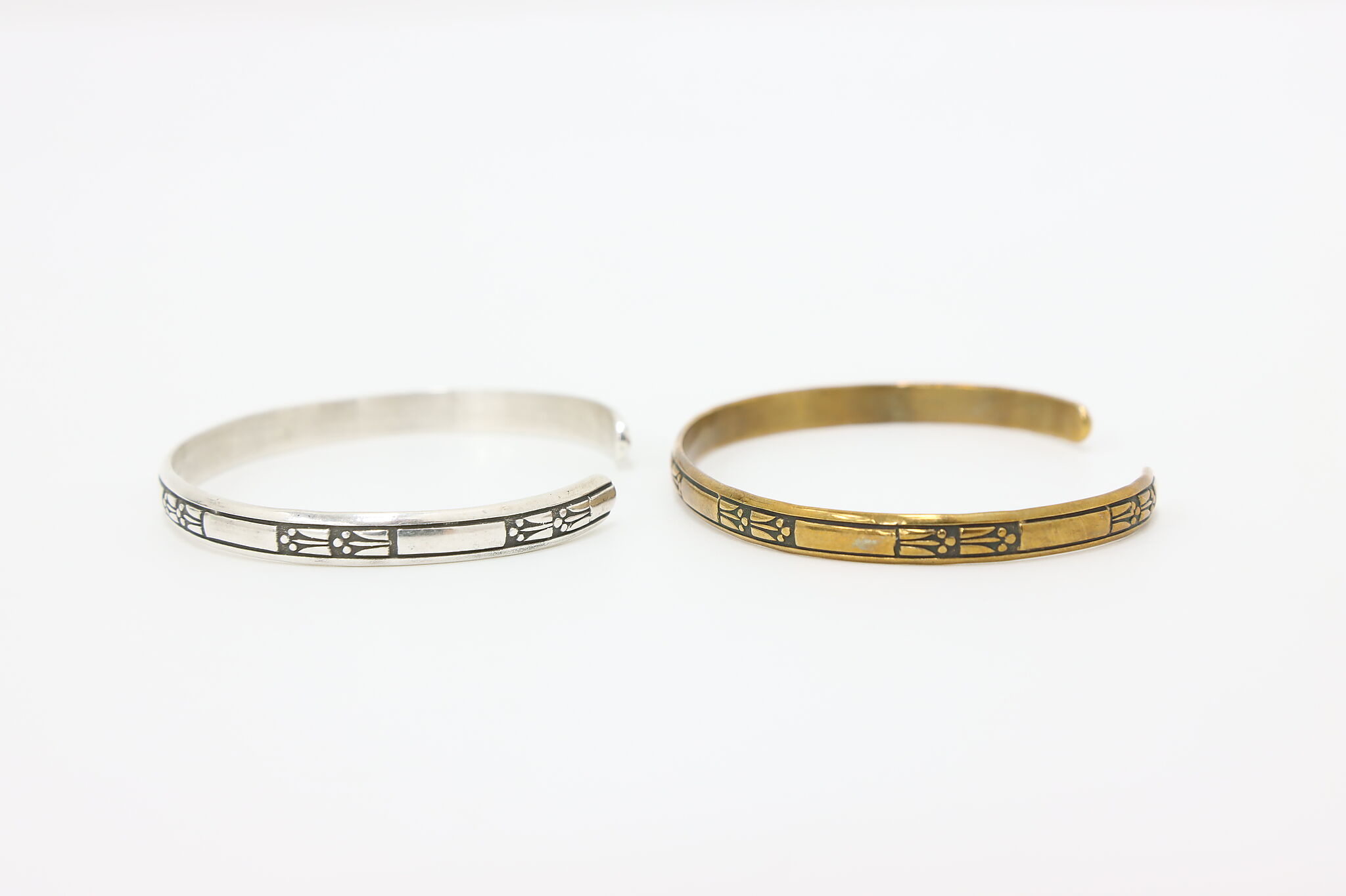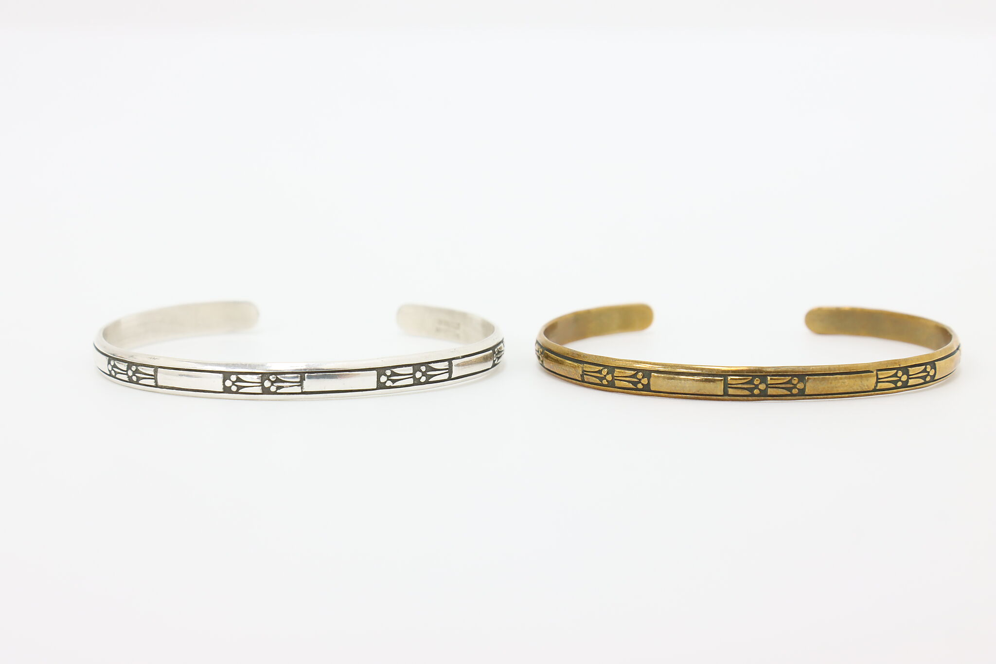 A classic two-piece cuff set featuring a sterling silver bracelet and a coordinating bronze bracelet, each detailed with an etched geometric floral pattern. Perfect worn together or individually for a subtle vintage-inspired accent.