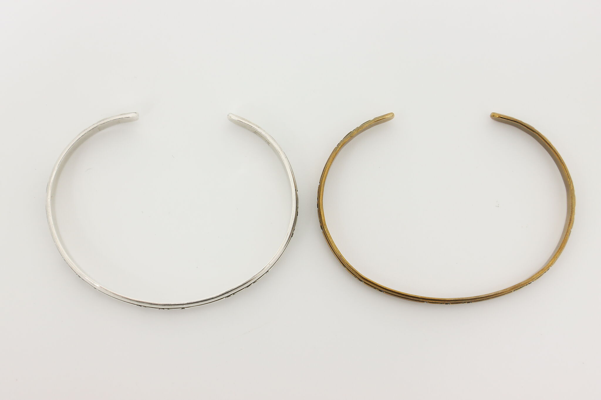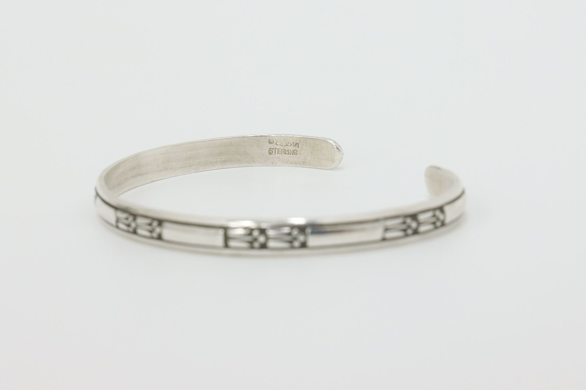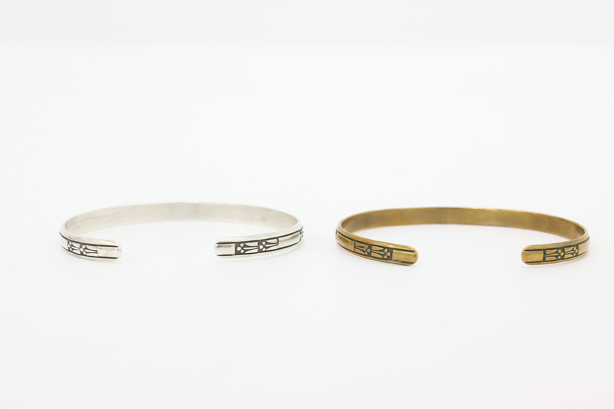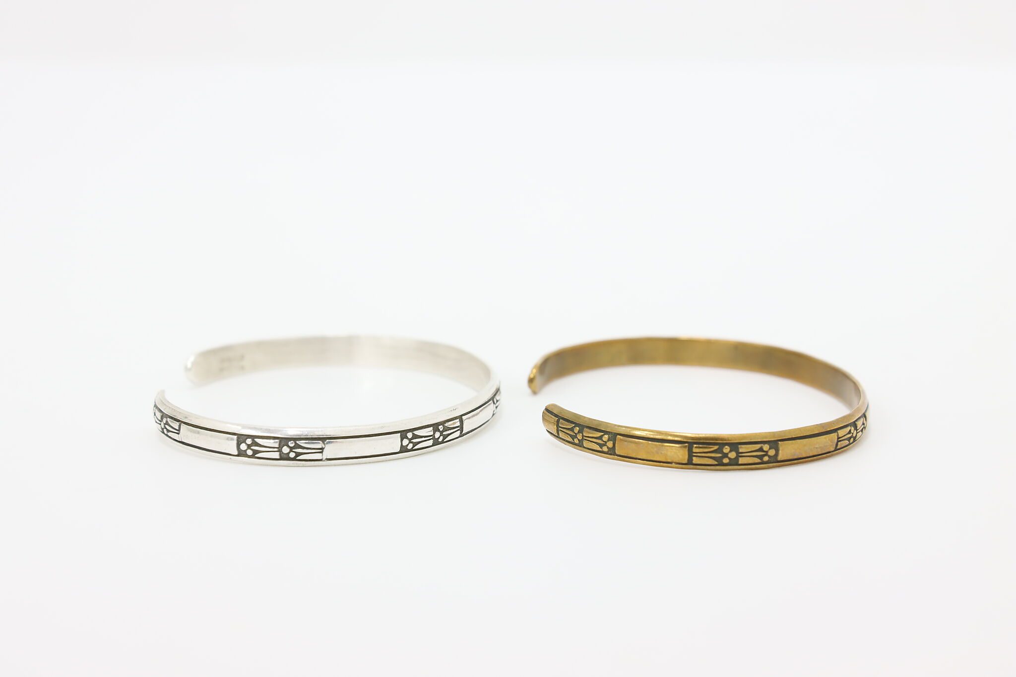 A classic two-piece cuff set featuring a sterling silver bracelet and a coordinating bronze bracelet, each detailed with an etched geometric floral pattern. Perfect worn together or individually for a subtle vintage-inspired accent.