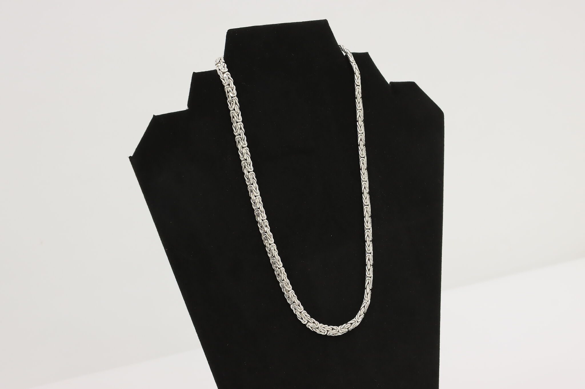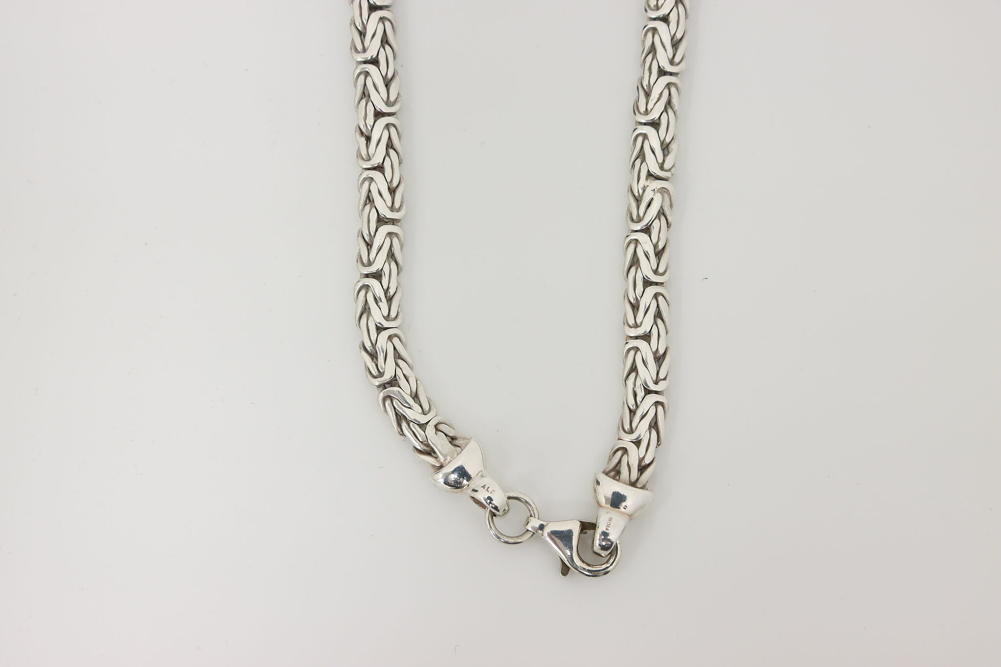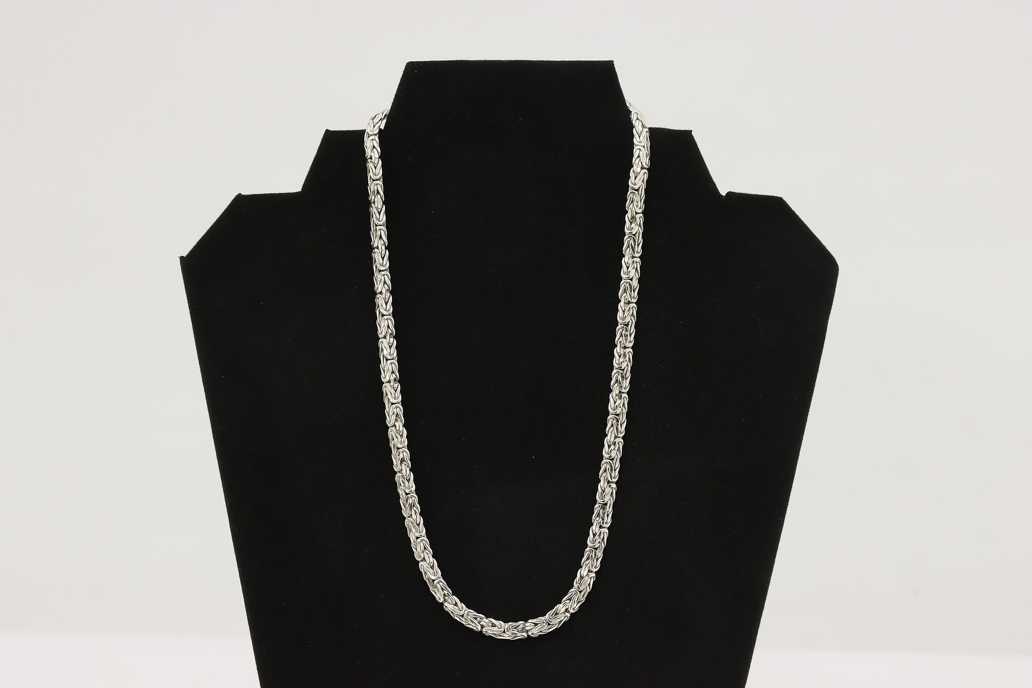 A bold sterling silver Byzantine chain necklace featuring intricate interlocking links with a bright, polished finish.