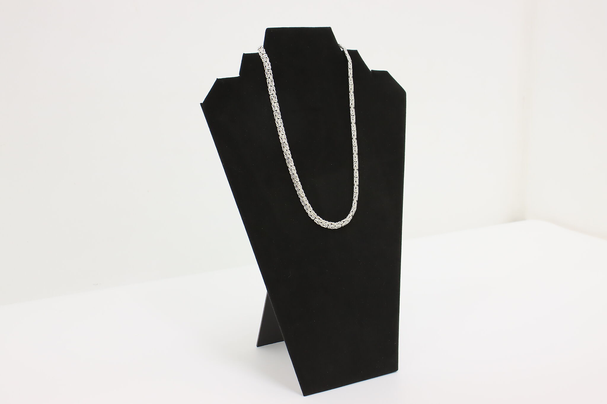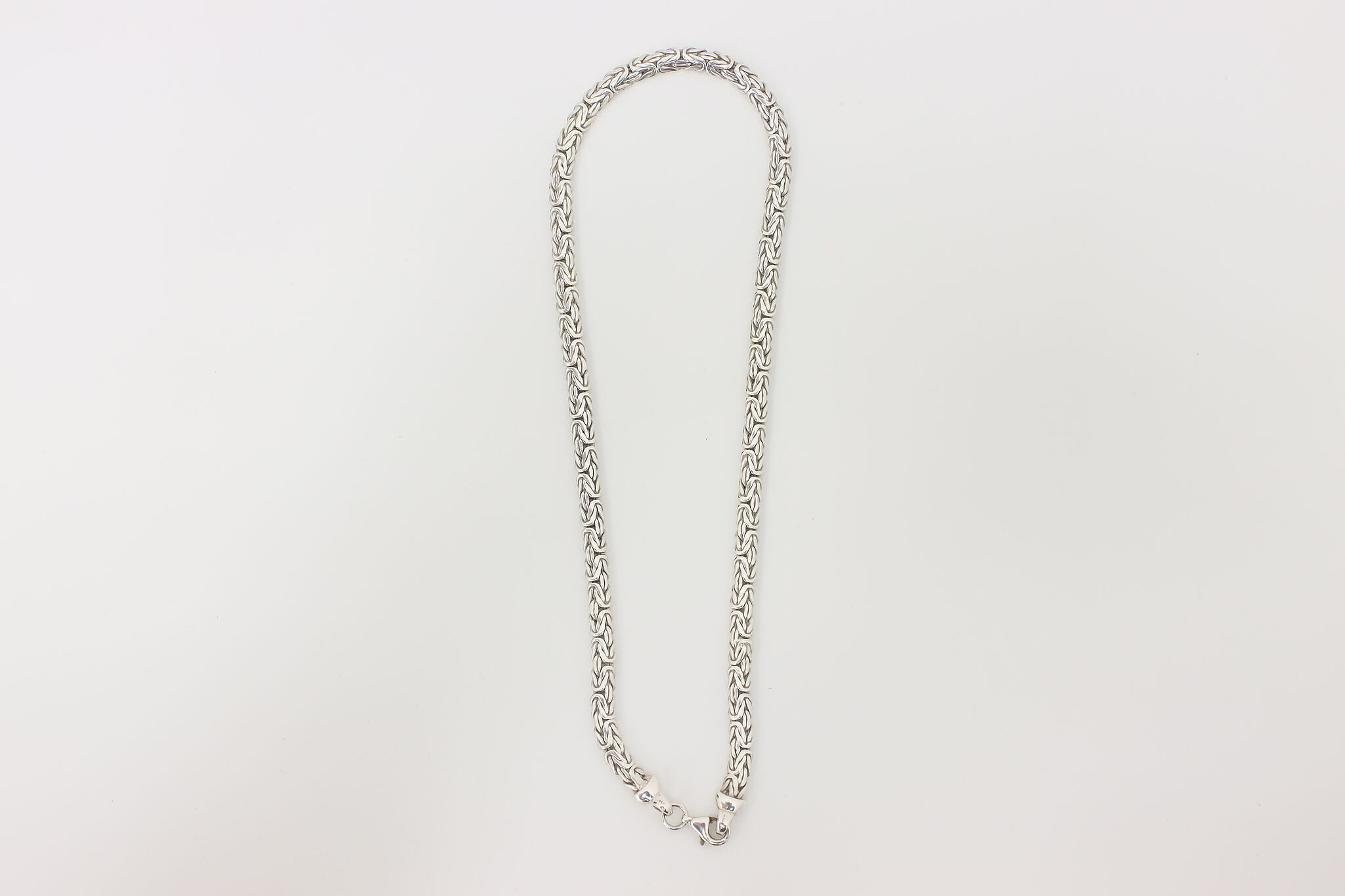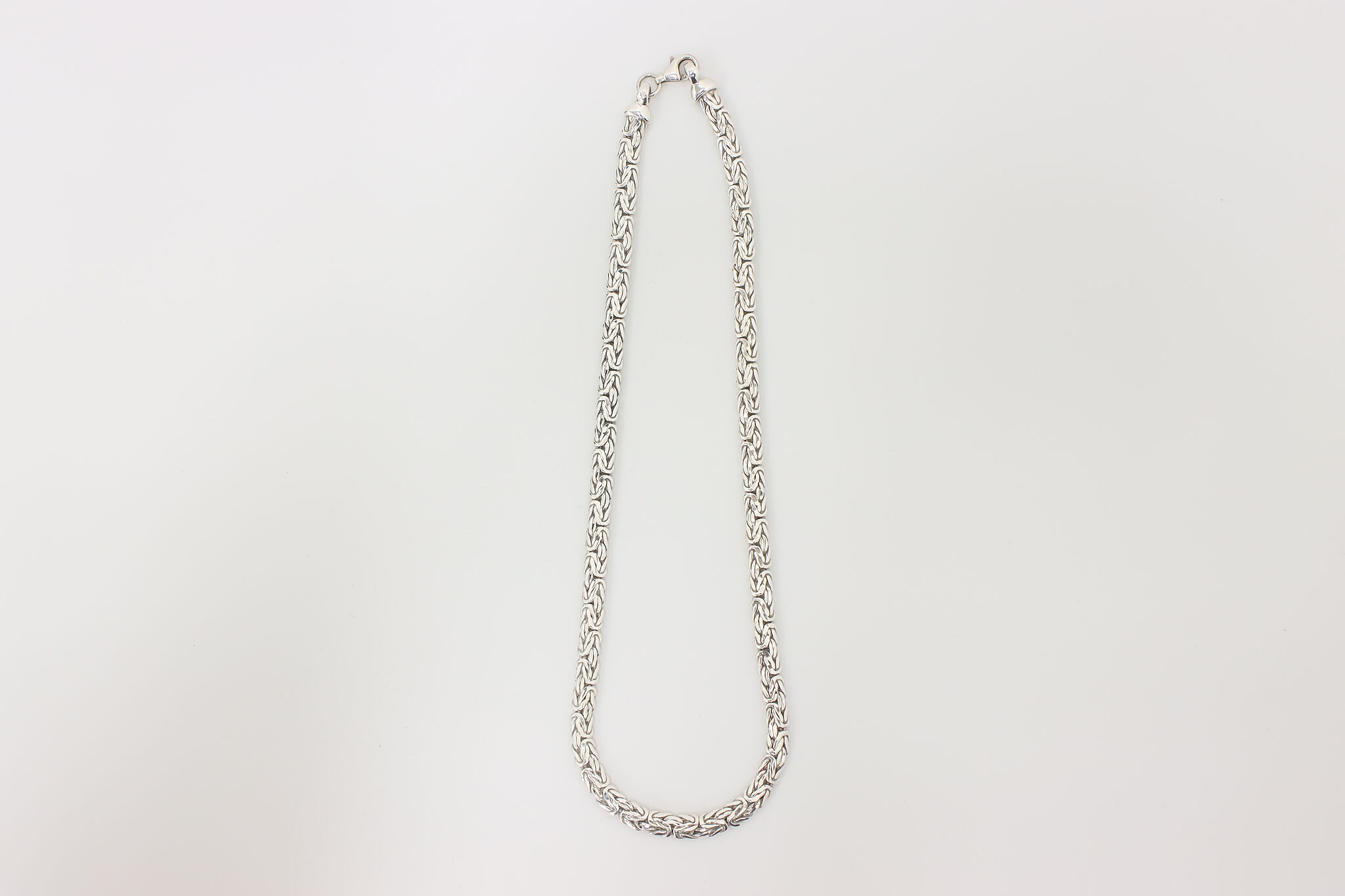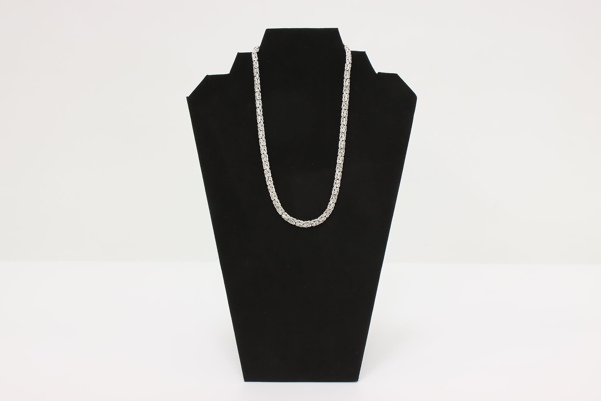 A bold sterling silver Byzantine chain necklace featuring intricate interlocking links with a bright, polished finish.