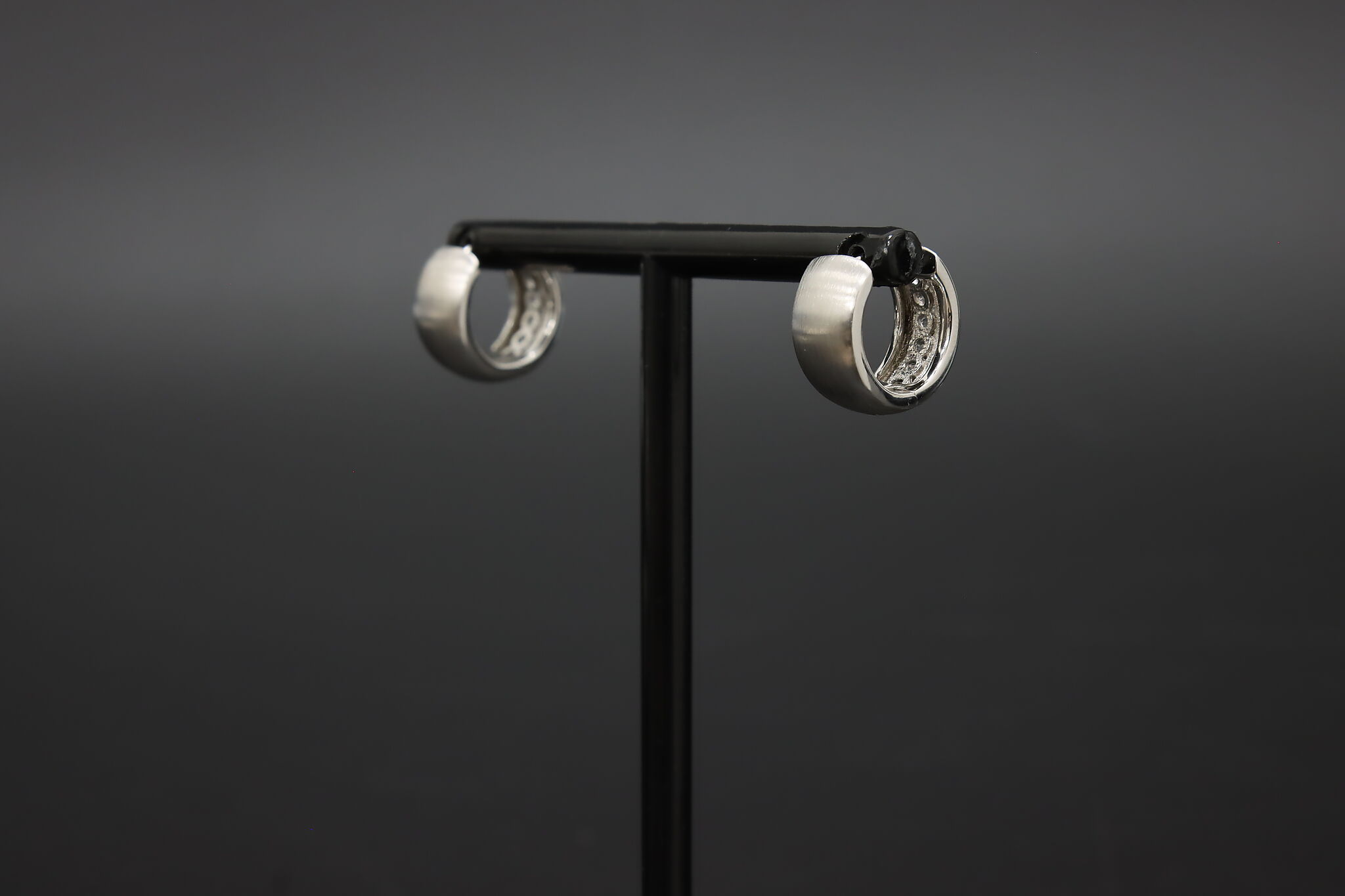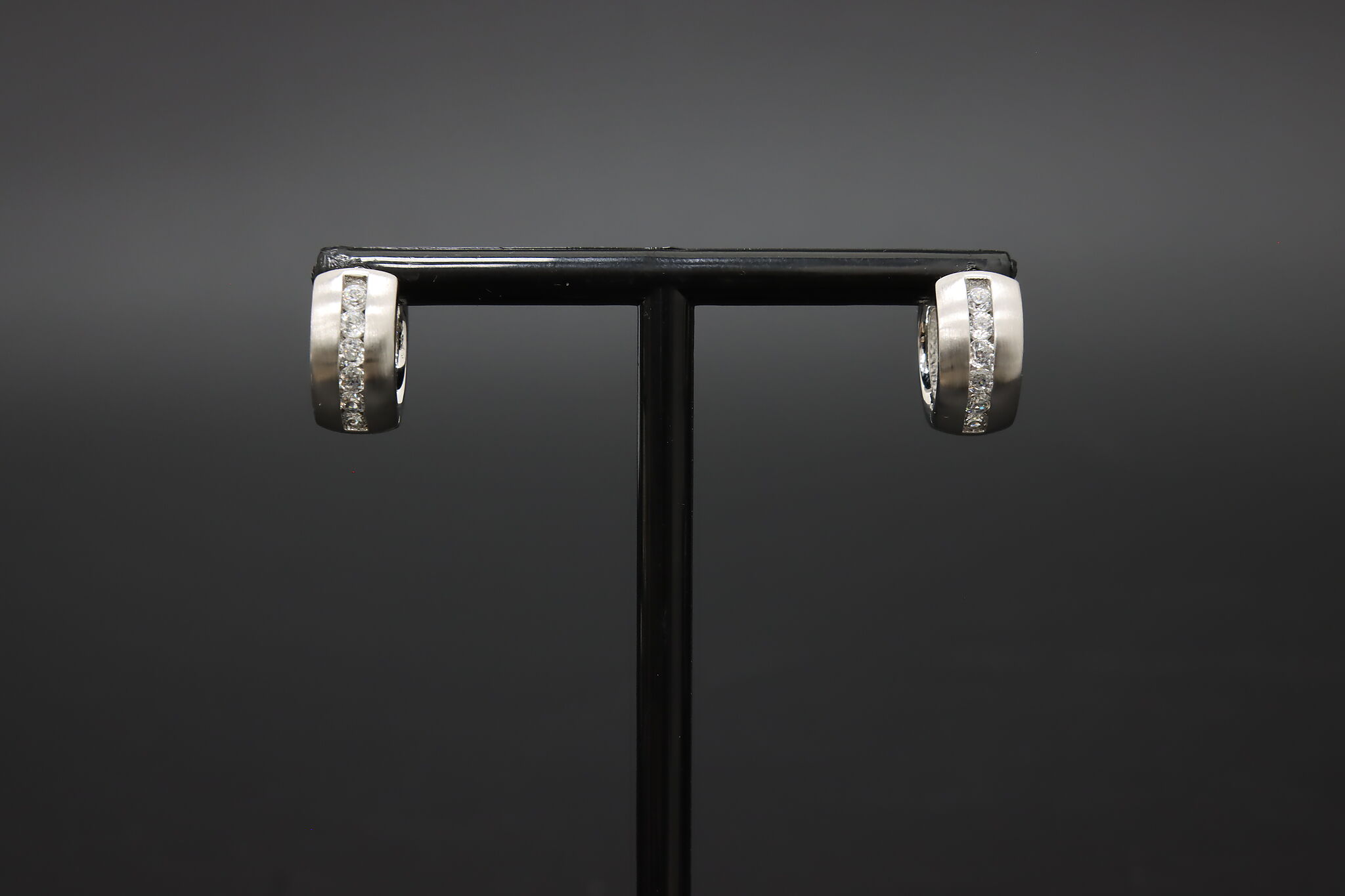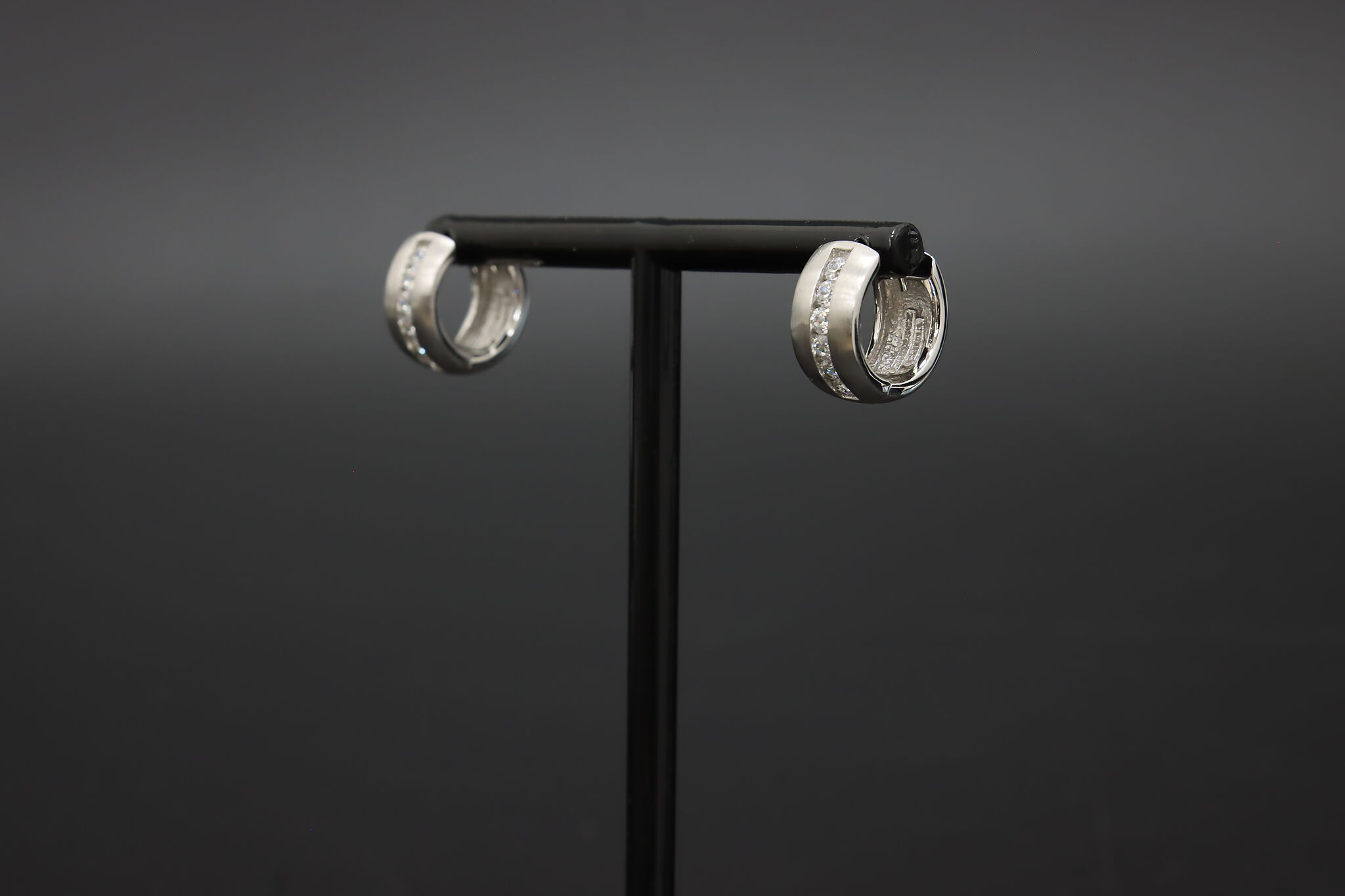 Classic sterling silver huggie hoop earrings set with sparkling channel-set cubic zirconia stones, finished with a softly brushed texture for a modern, elegant look.