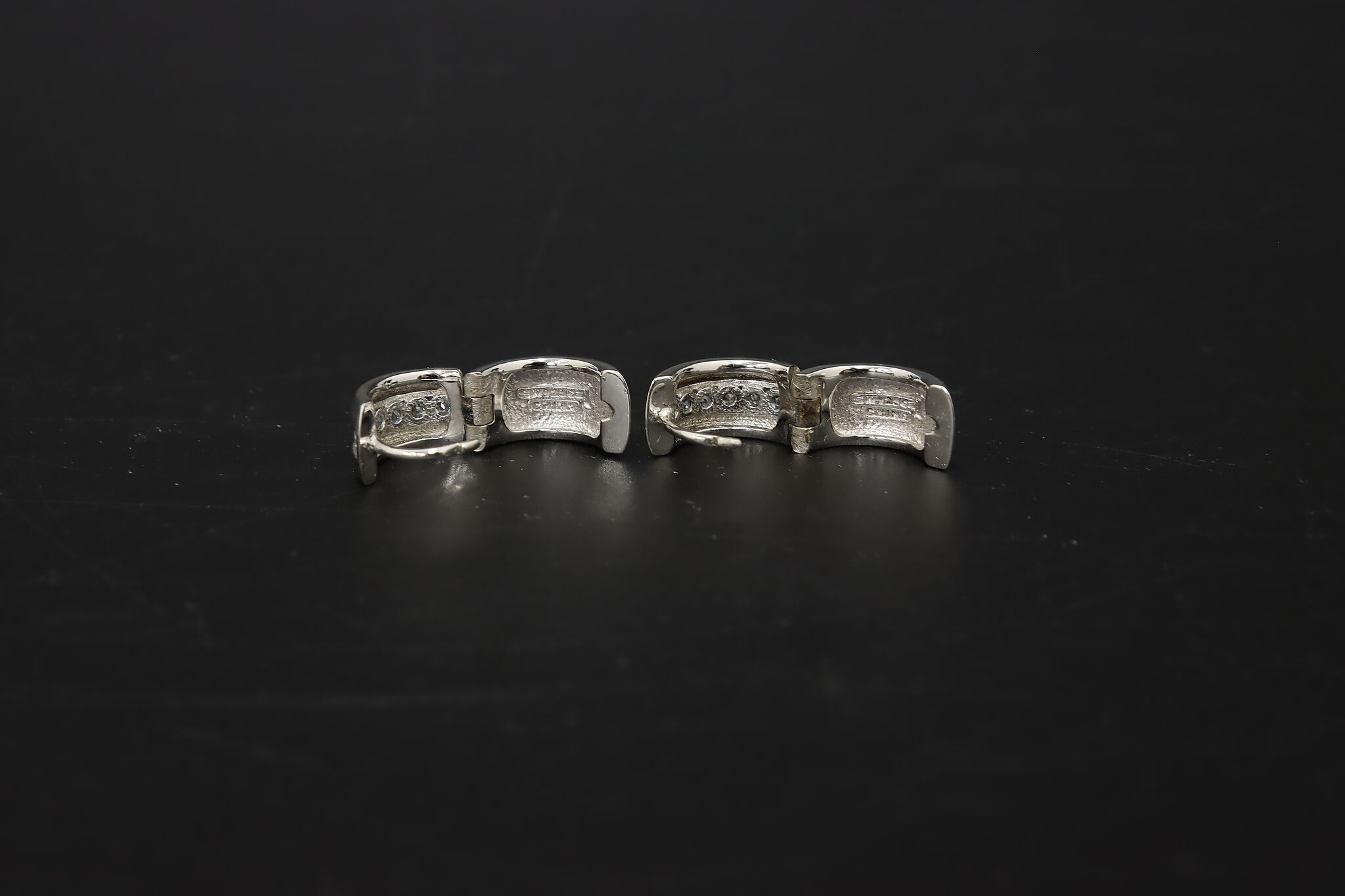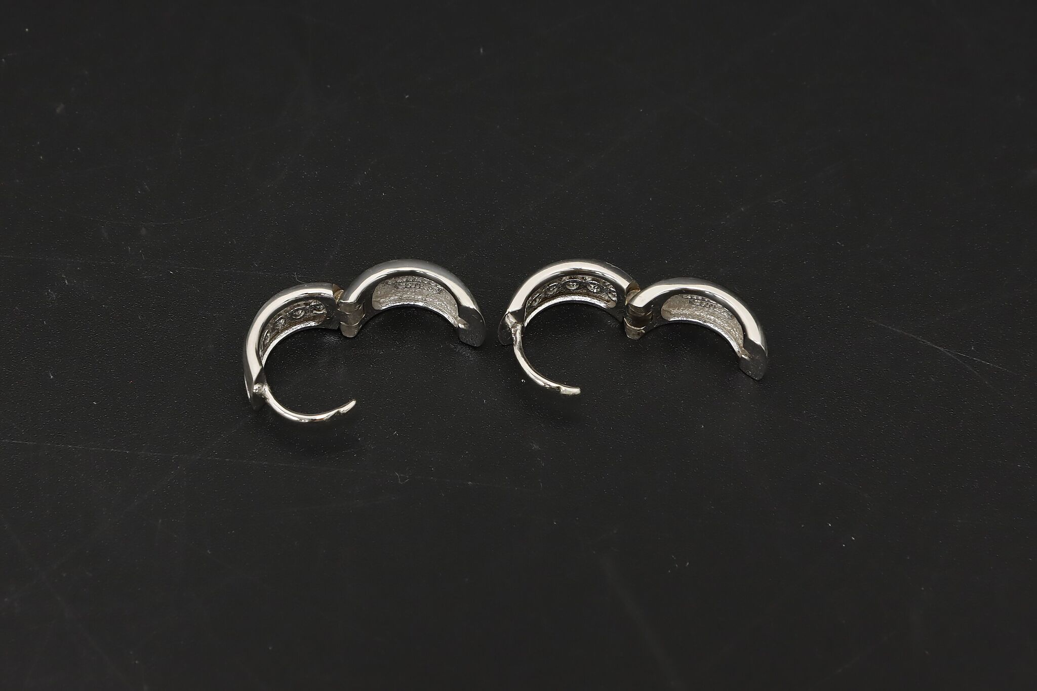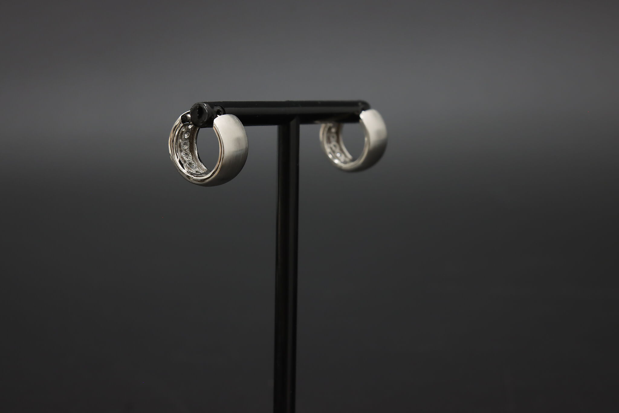 Classic sterling silver huggie hoop earrings set with sparkling channel-set cubic zirconia stones, finished with a softly brushed texture for a modern, elegant look.