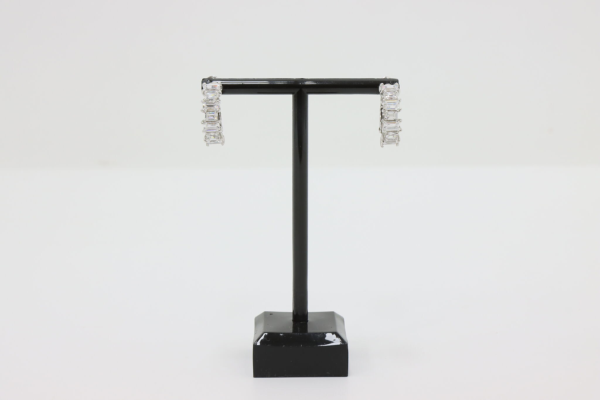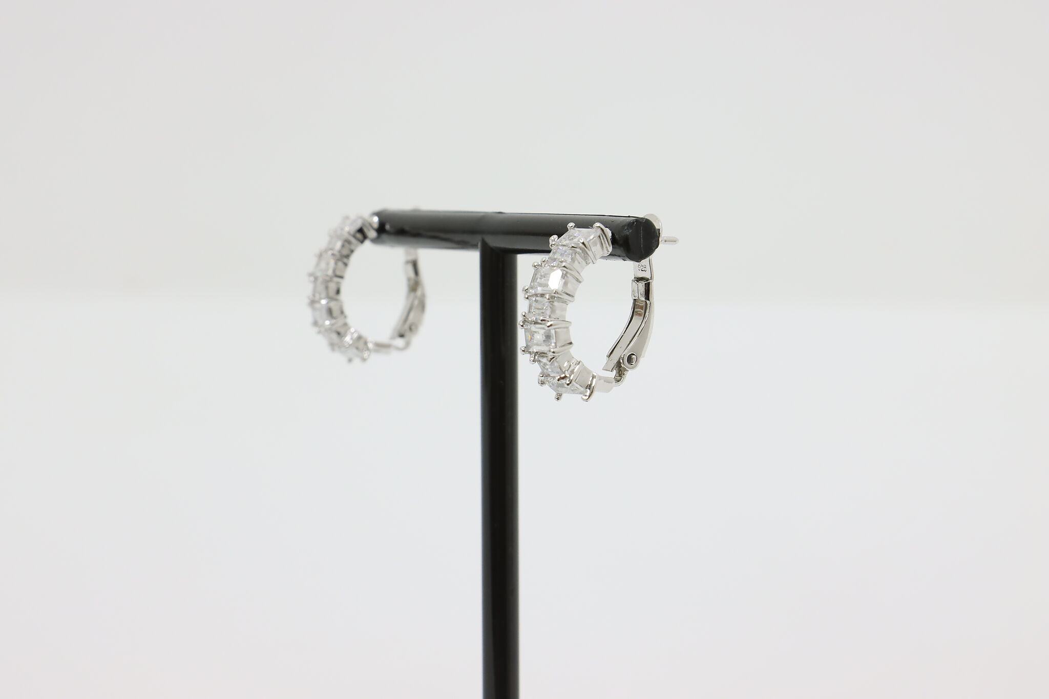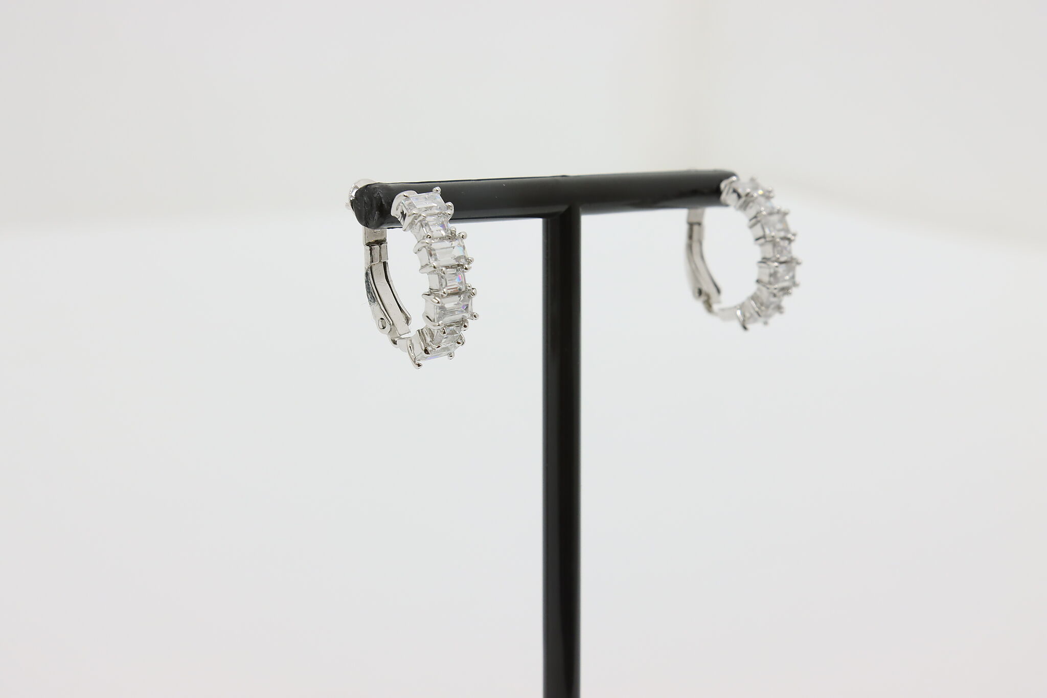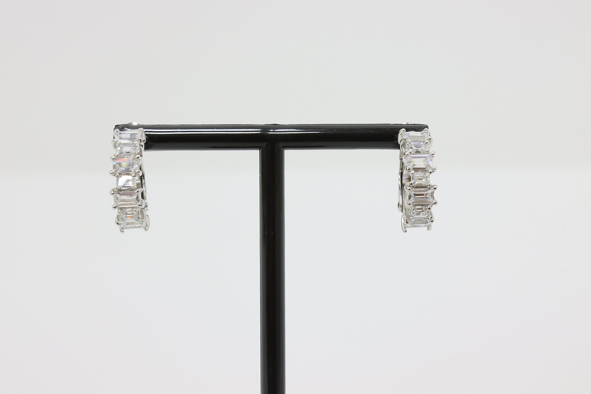 Modern sterling silver hoop earrings featuring a continuous row of emerald-cut cubic zirconia stones for a bold, high-shine statement.
