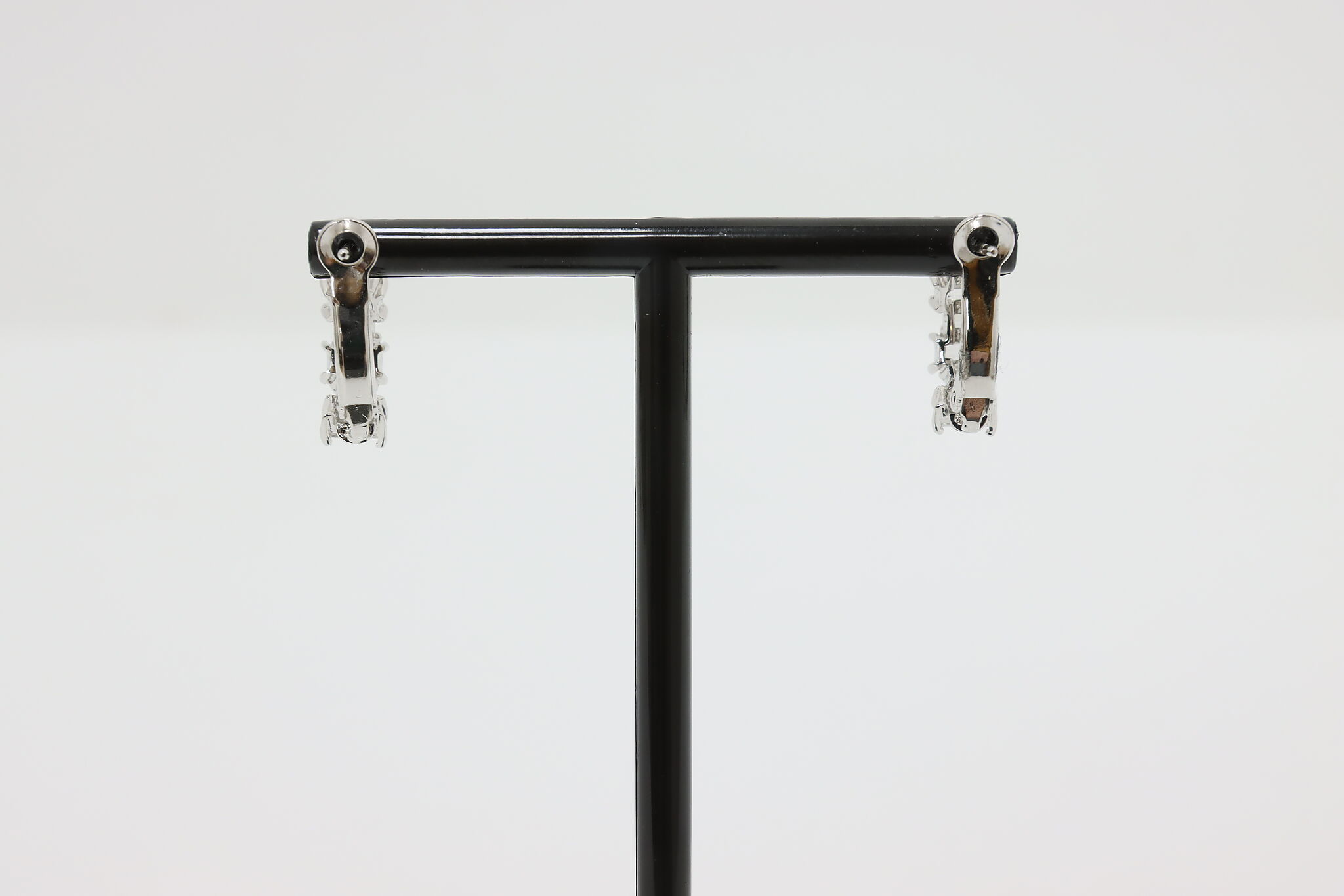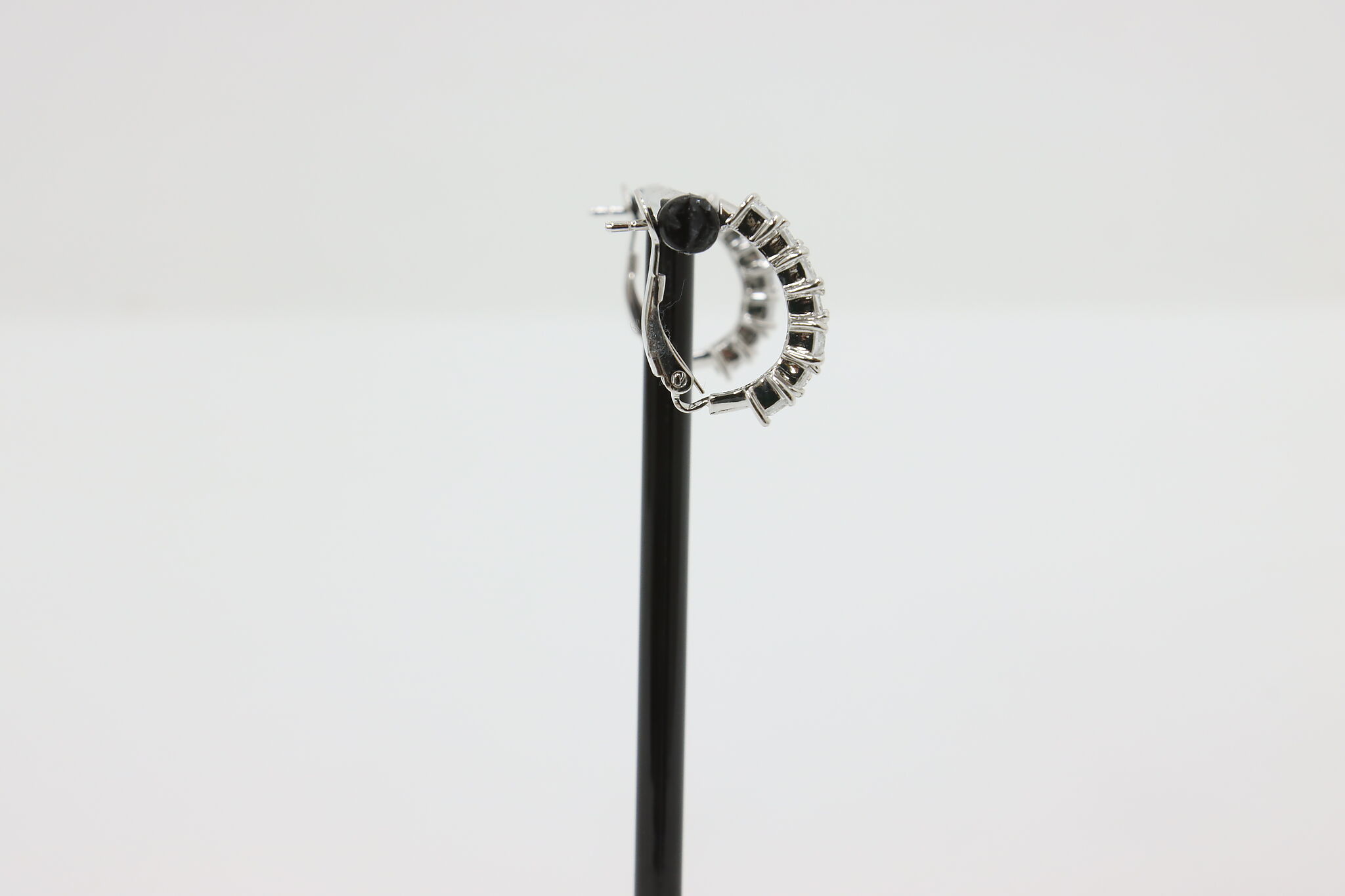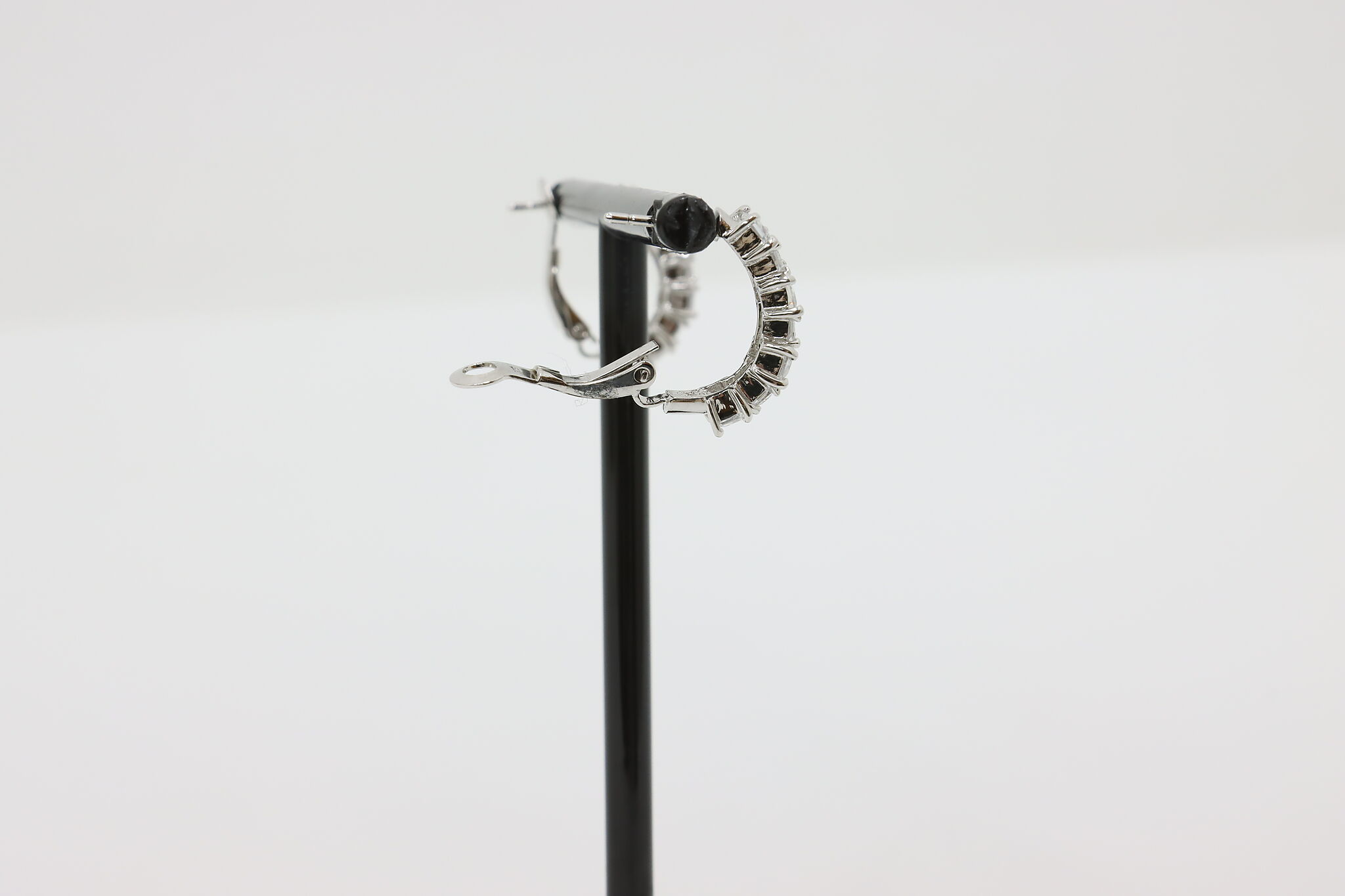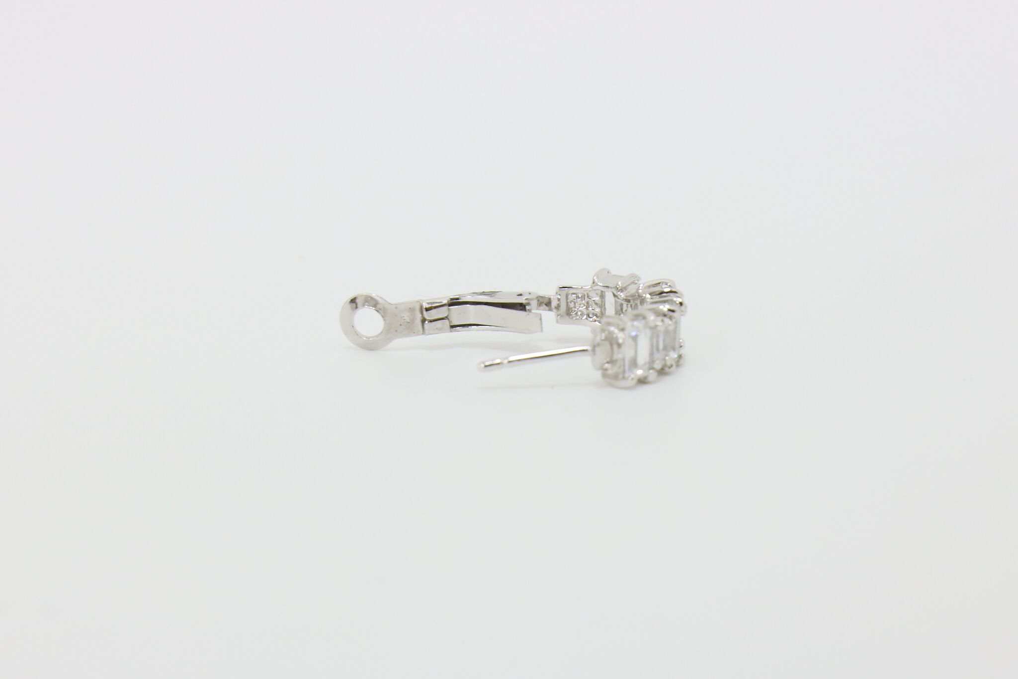 Modern sterling silver hoop earrings featuring a continuous row of emerald-cut cubic zirconia stones for a bold, high-shine statement.