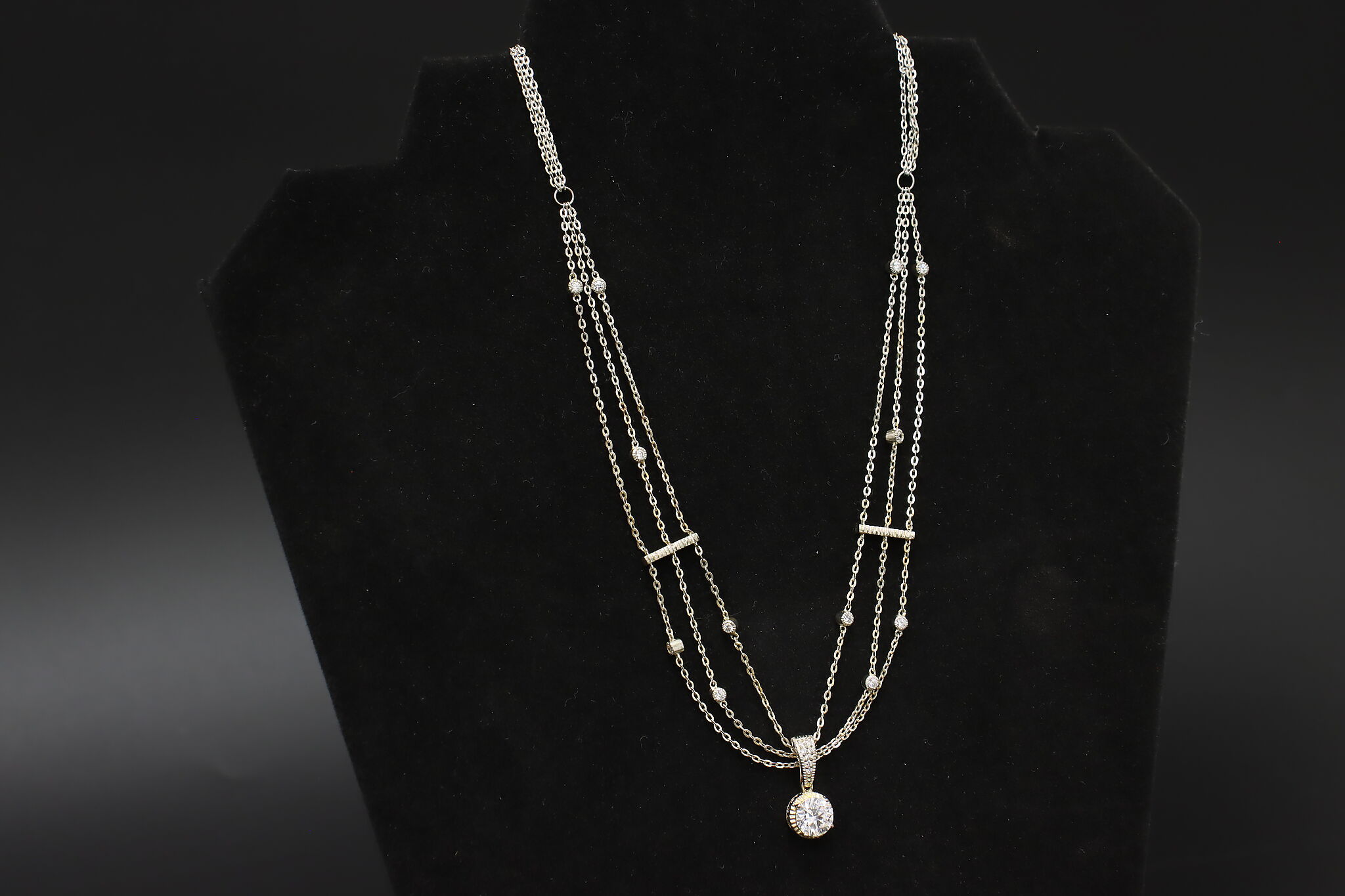 This beautiful triple strand necklace has small white cubic zirconia gems with a large hanging pendant.