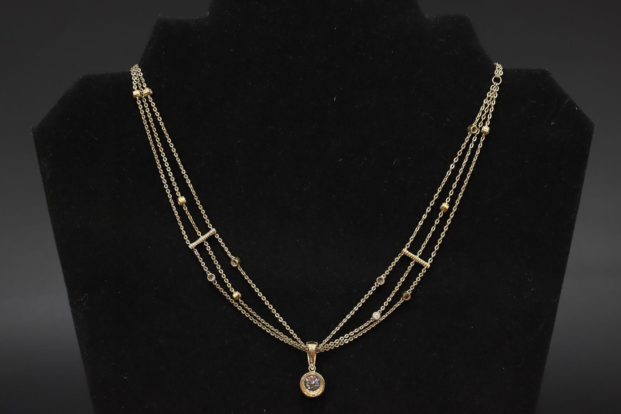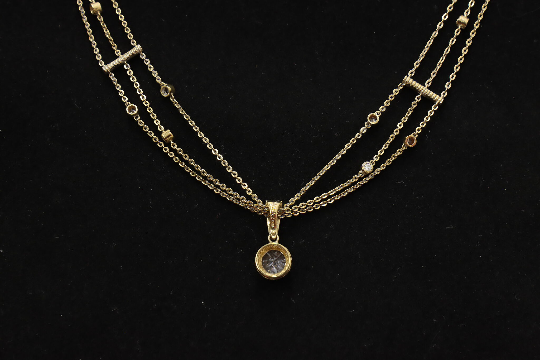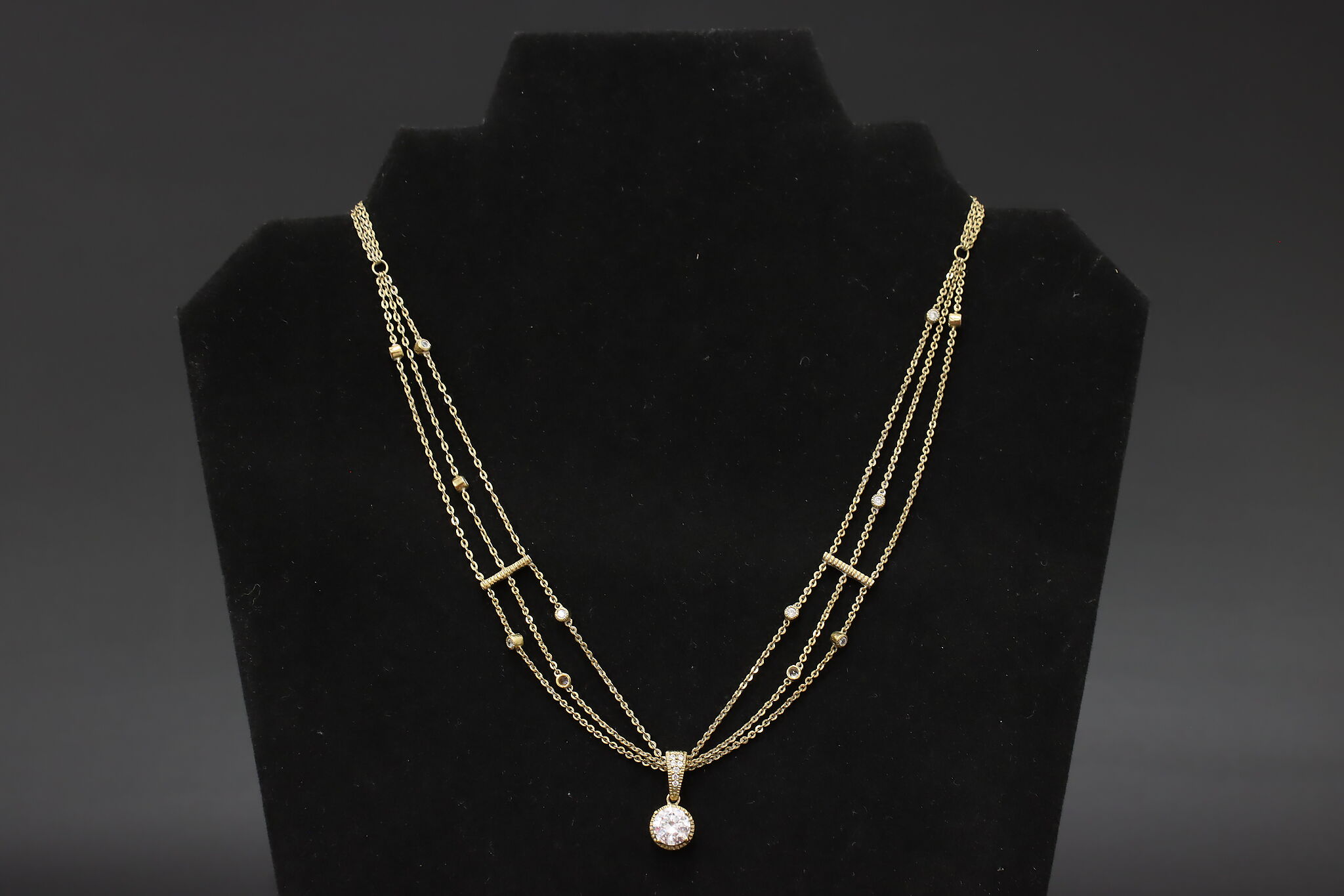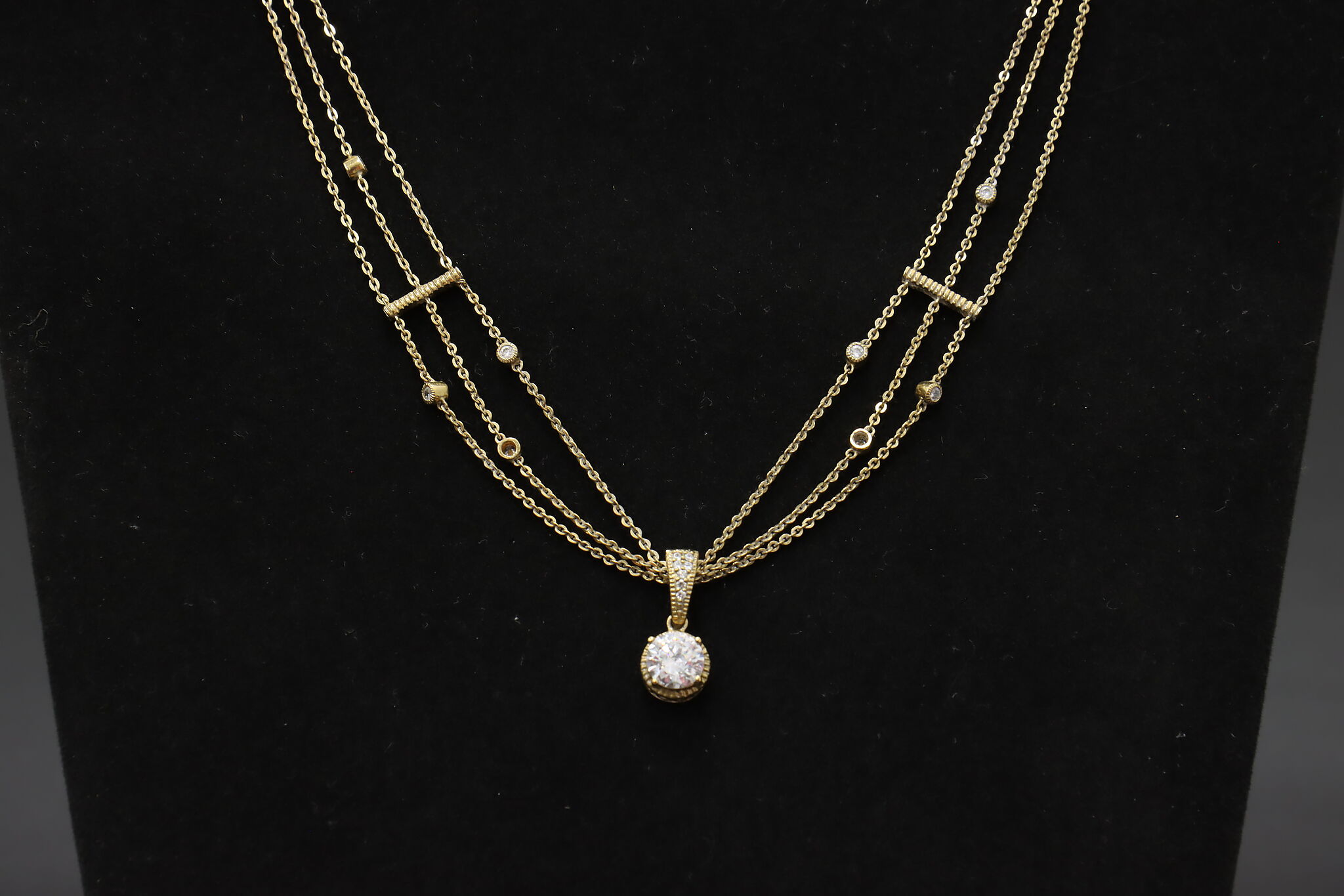 Elegant gold-tone sterling silver necklace featuring a layered multi-chain design accented with sparkling cubic zirconia stations and drop pendant. The adjustable length and delicate drape make this a versatile piece that works beautifully for everyday wear or special occasions.