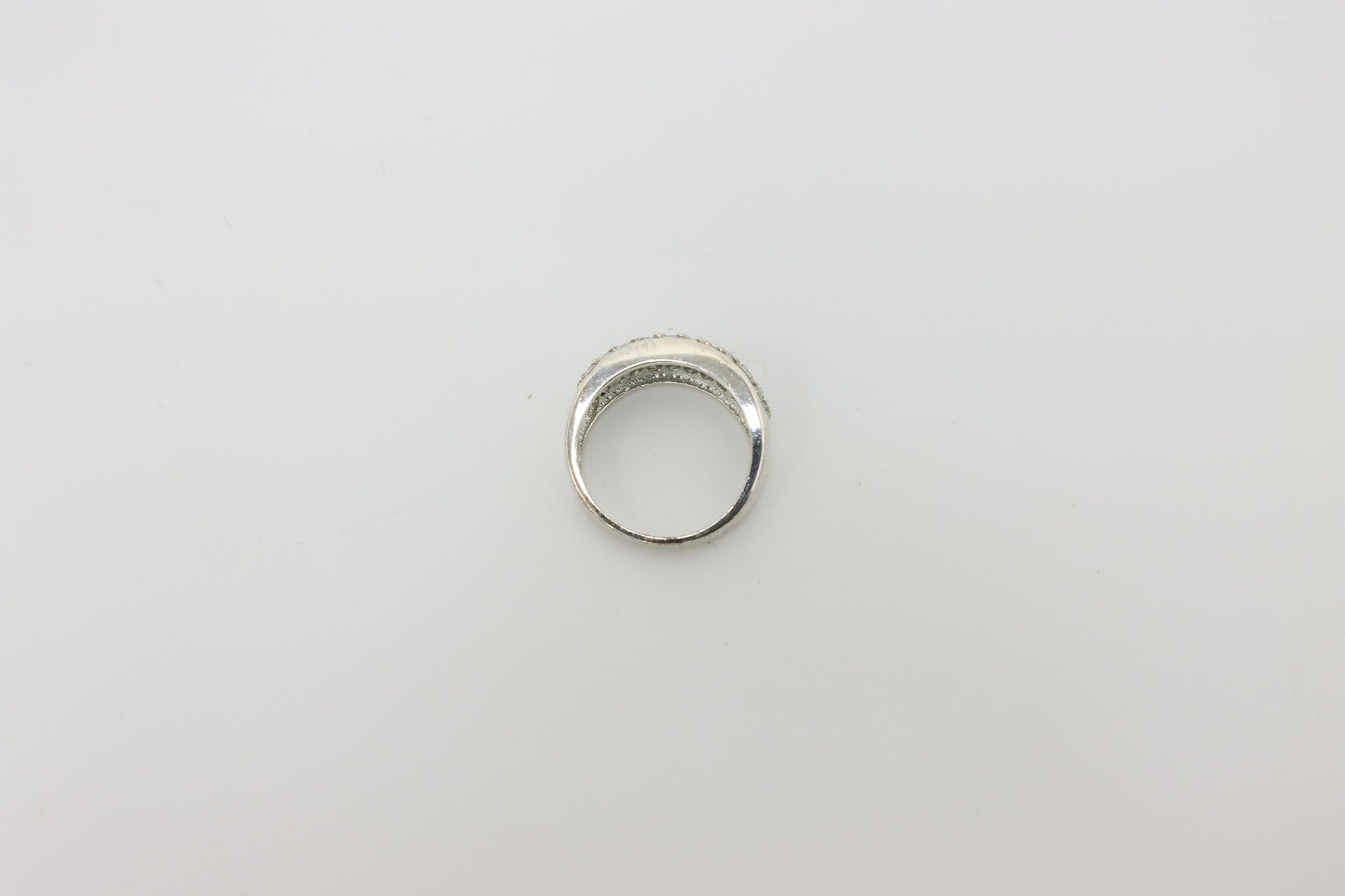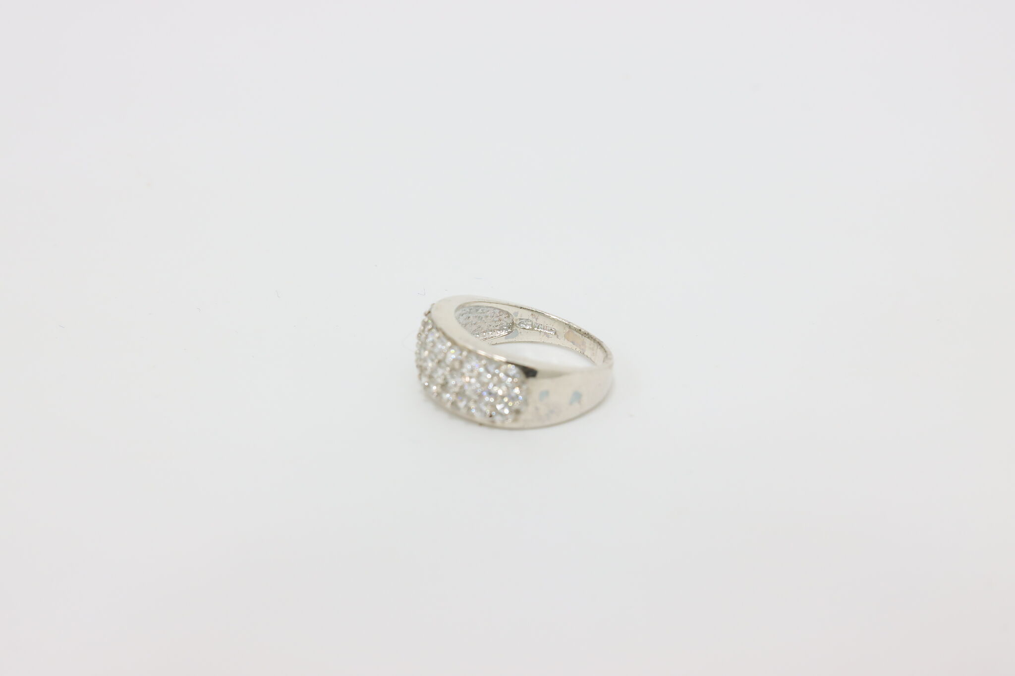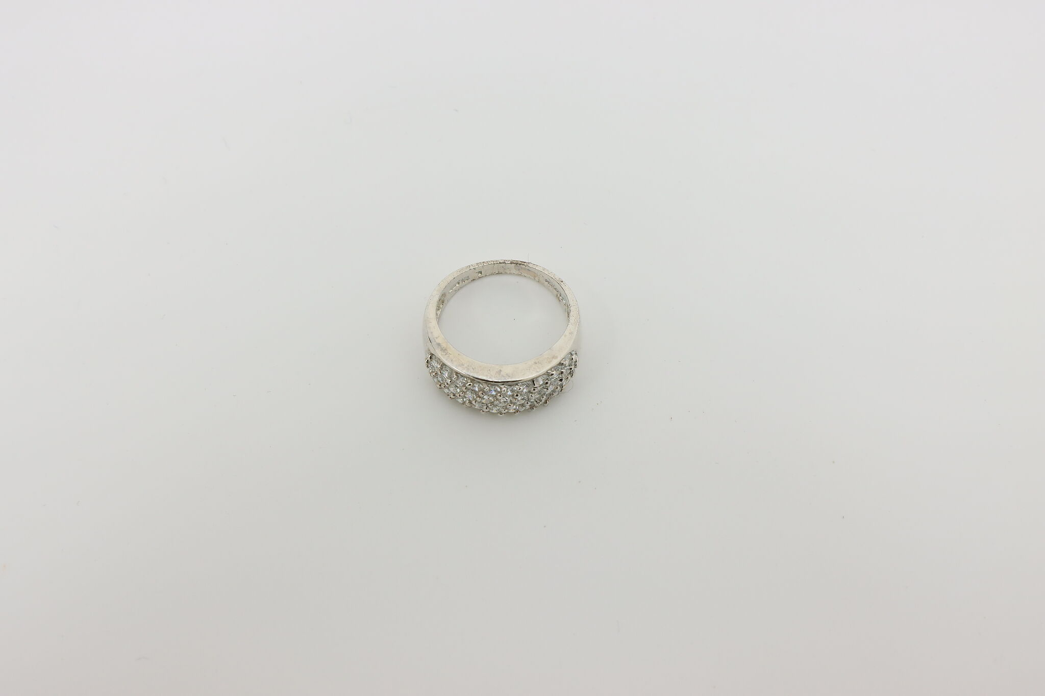 Sparkling sterling silver band ring featuring a wide pavé-style top set with rows of clear cubic zirconia stones for a bold, elegant look. The smooth polished band and shimmering stones make this ring perfect for everyday wear or special occasions.