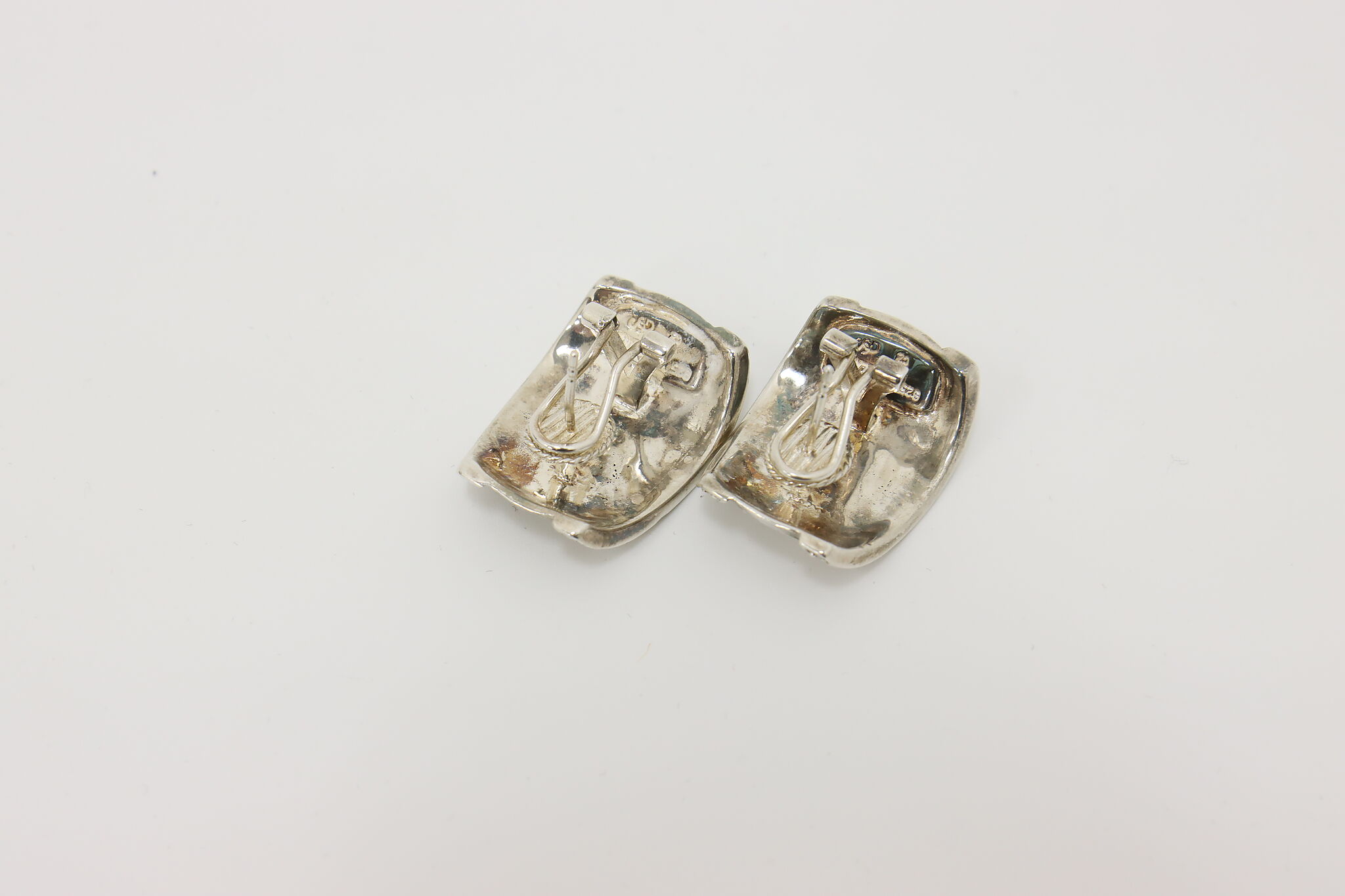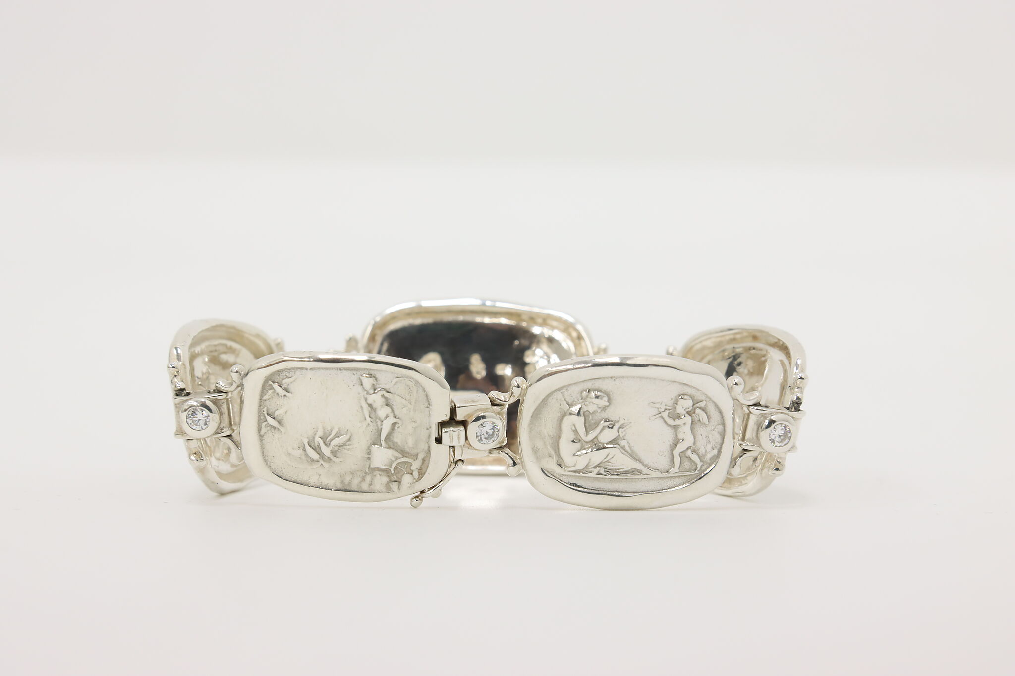 A beautifully crafted sterling silver set featuring raised cherub relief panels accented with sparkling CZ stones. Includes a wide-panel bracelet and matching huggie-style earrings for a coordinated, elegant look.
