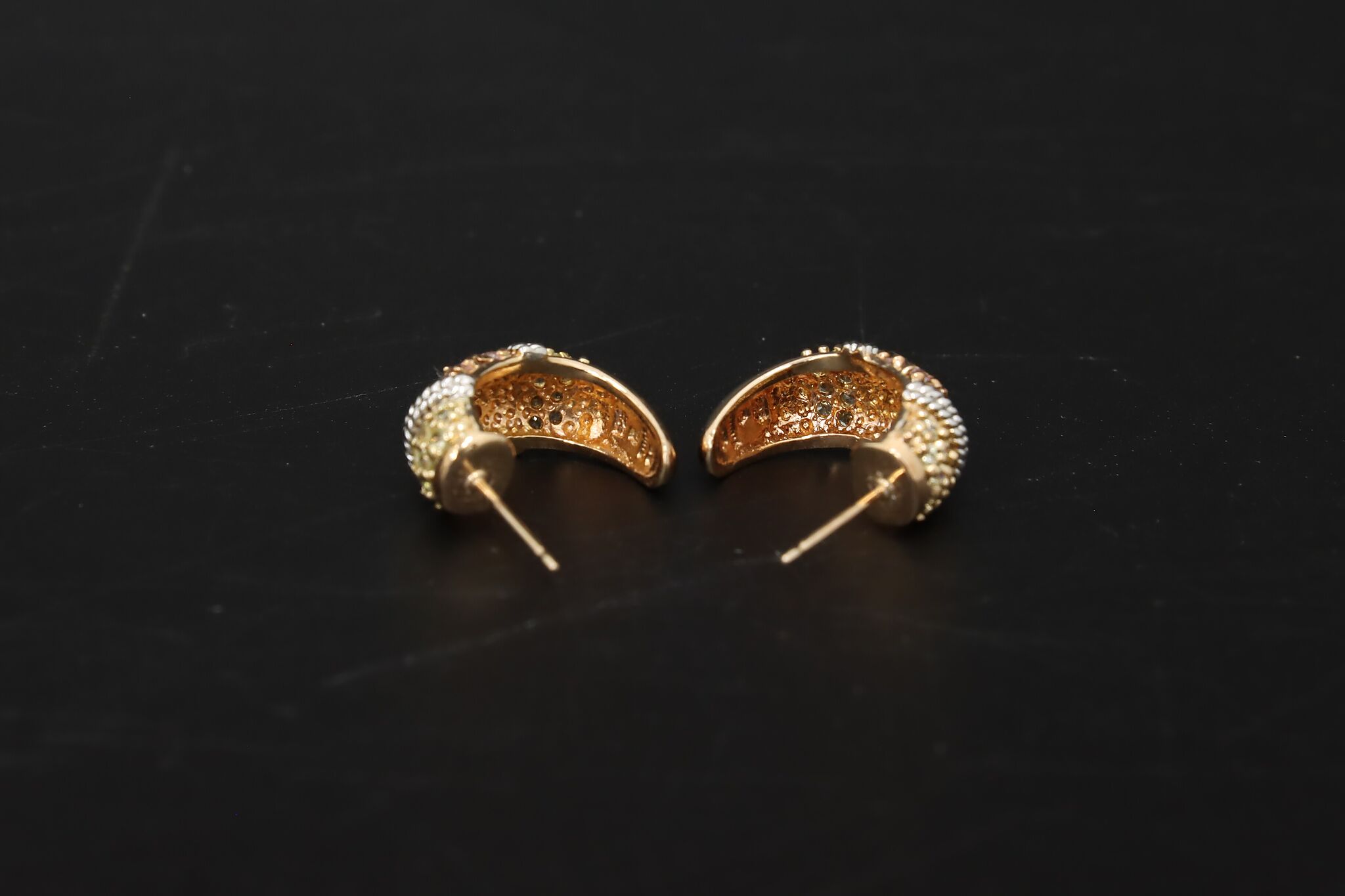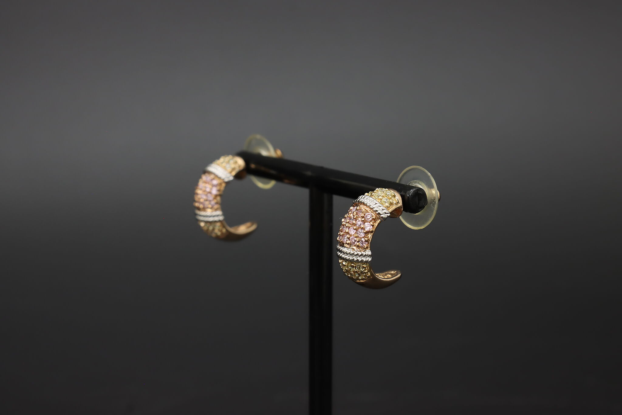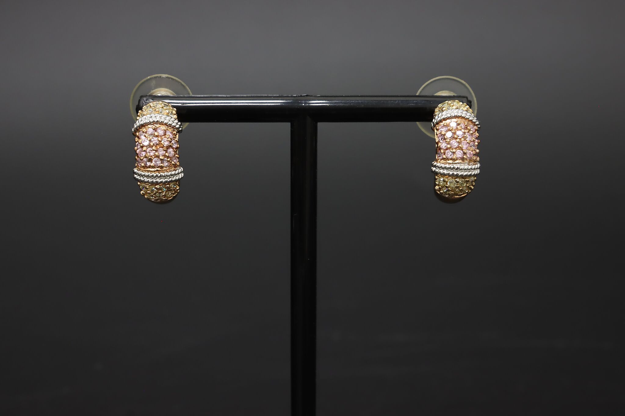 Stylish sterling silver hoop earrings with gold and rose tone accents and sparkling pave set cubic zirconia stones for a bold, luxury-inspired look.